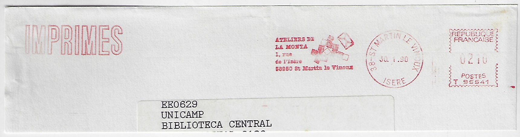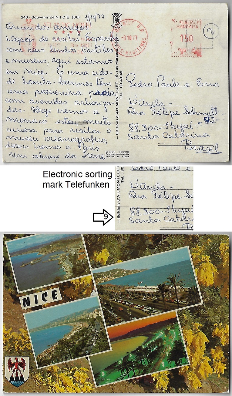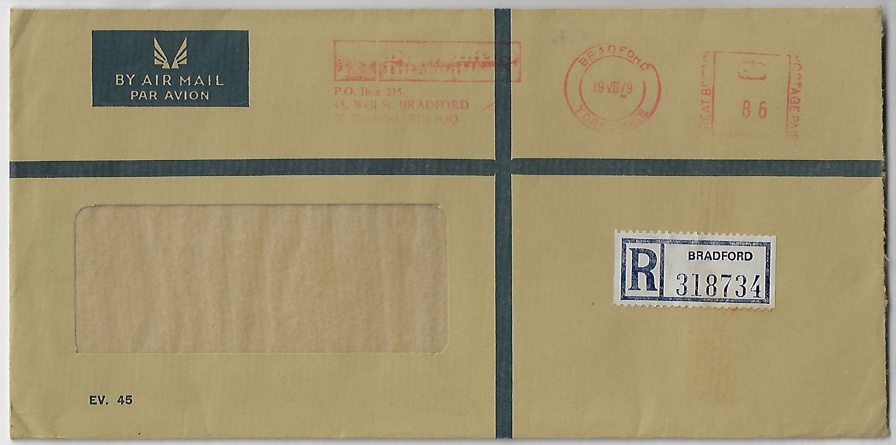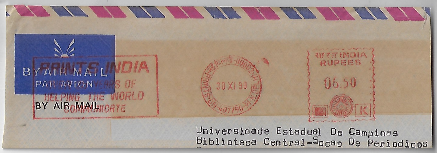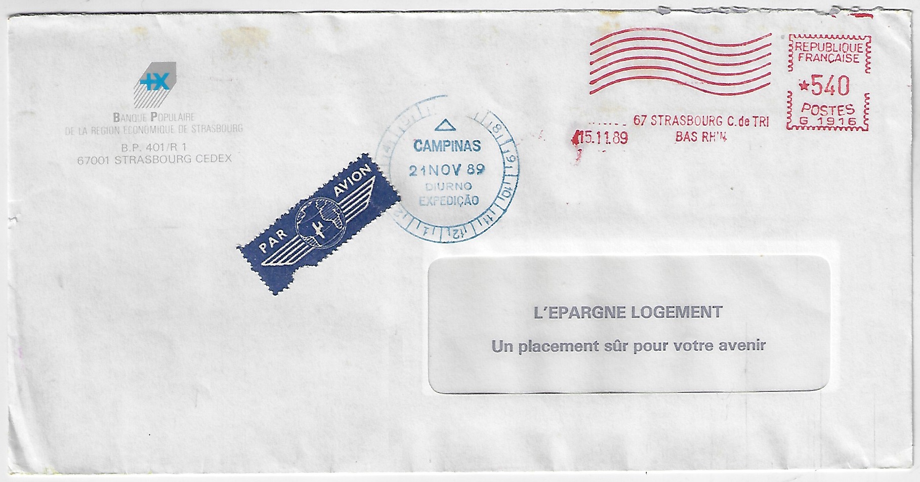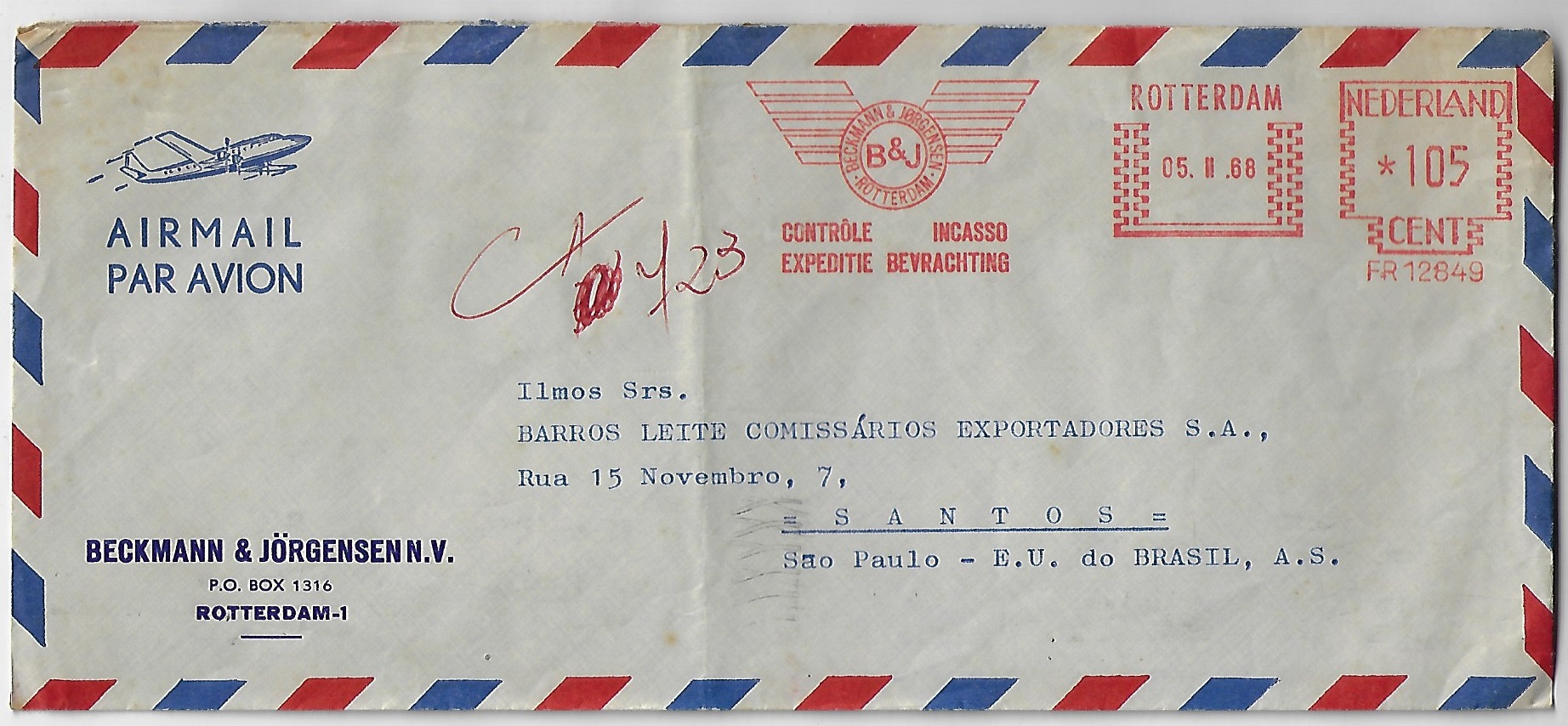 | 79678 | África do Sul, 1979, envelope aéreo enviado de Eppingust (13/7) para São Paulo, porteado com franquia mecânica Roneo Neopost "205/2205" com slogan Barclays National Bank Ltd | 10,00 | Foto |