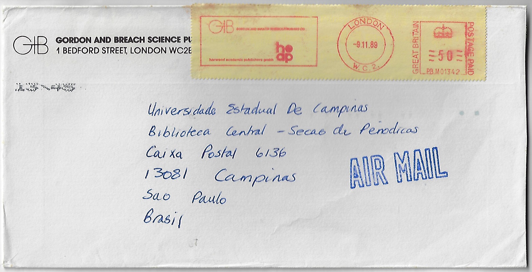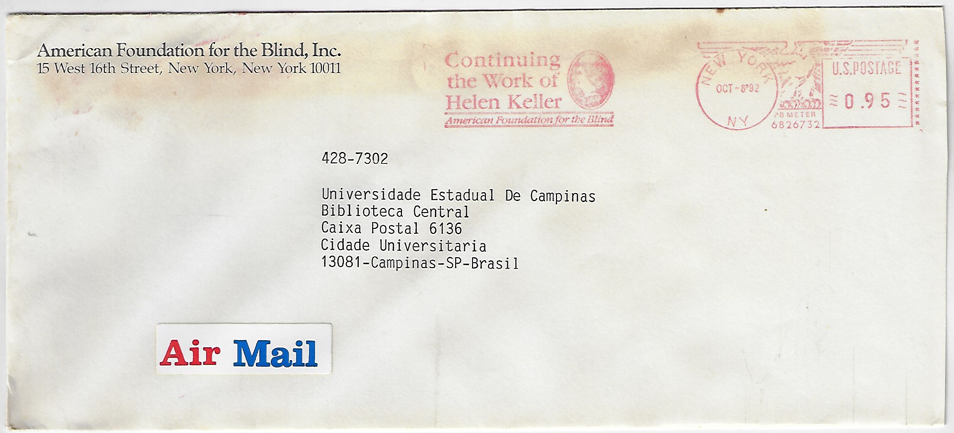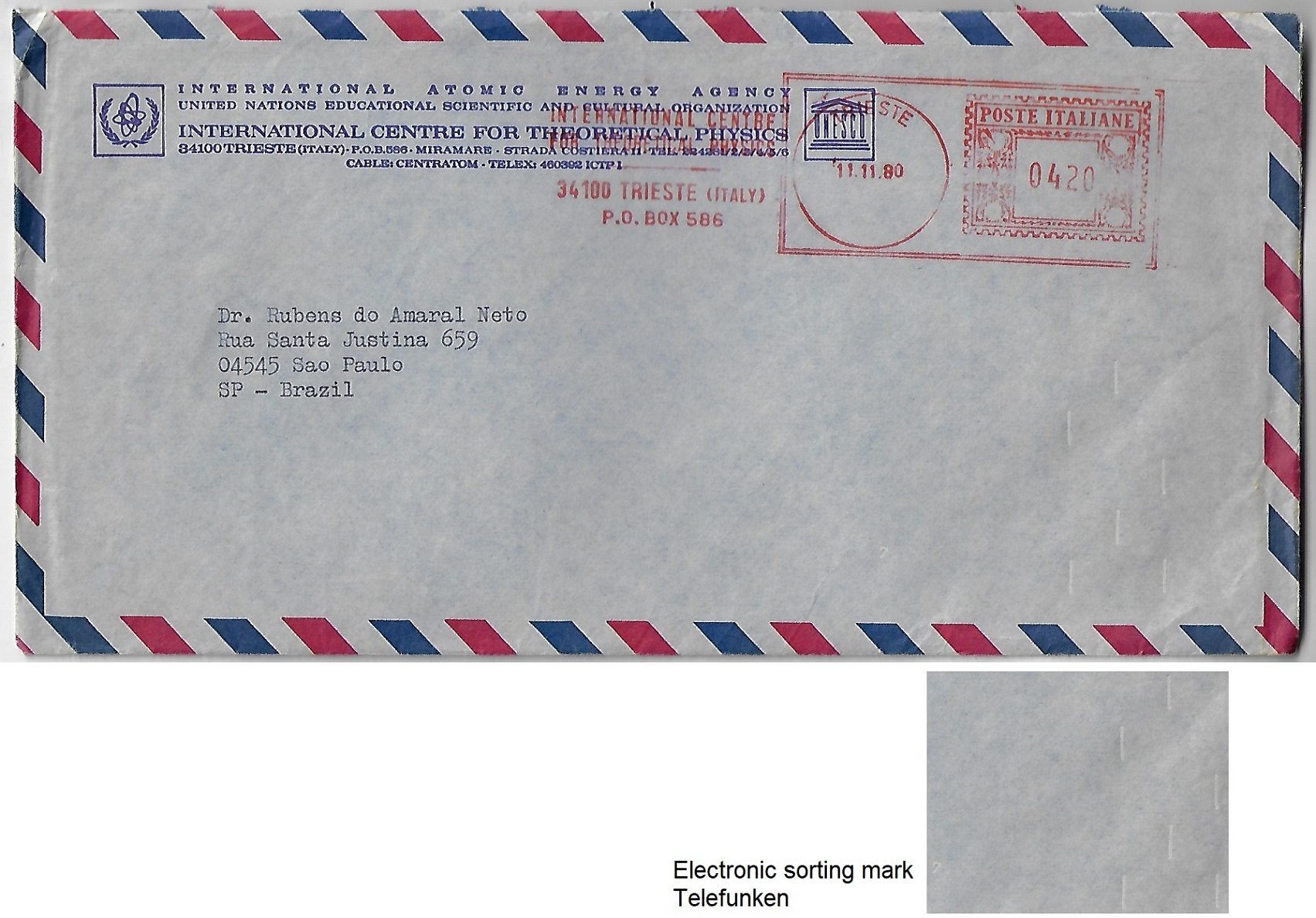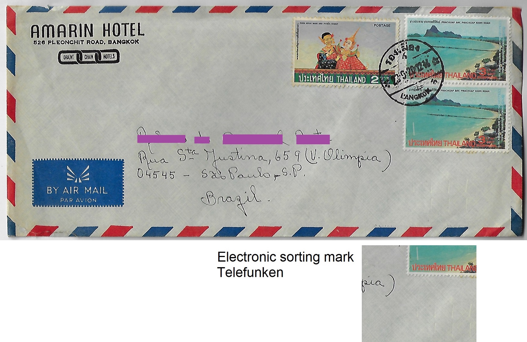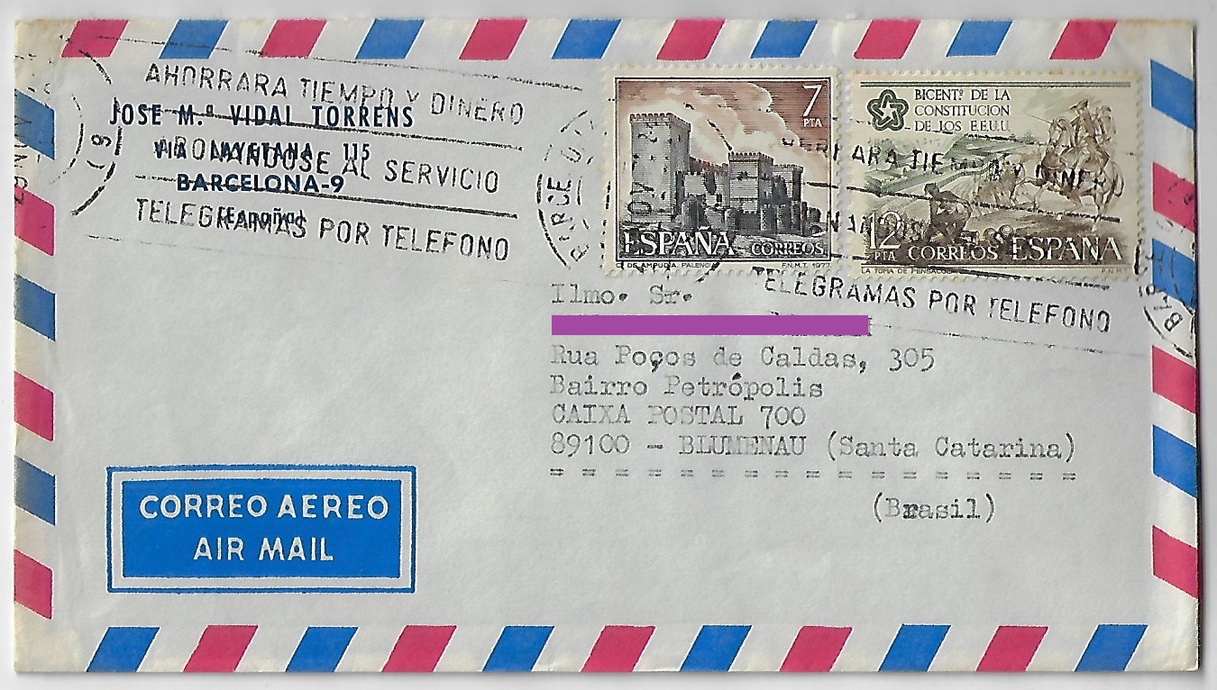 | 79678 | África do Sul, 1979, envelope aéreo enviado de Eppingust (13/7) para São Paulo, porteado com franquia mecânica Roneo Neopost "205/2205" com slogan Barclays National Bank Ltd | 10,00 | Foto |