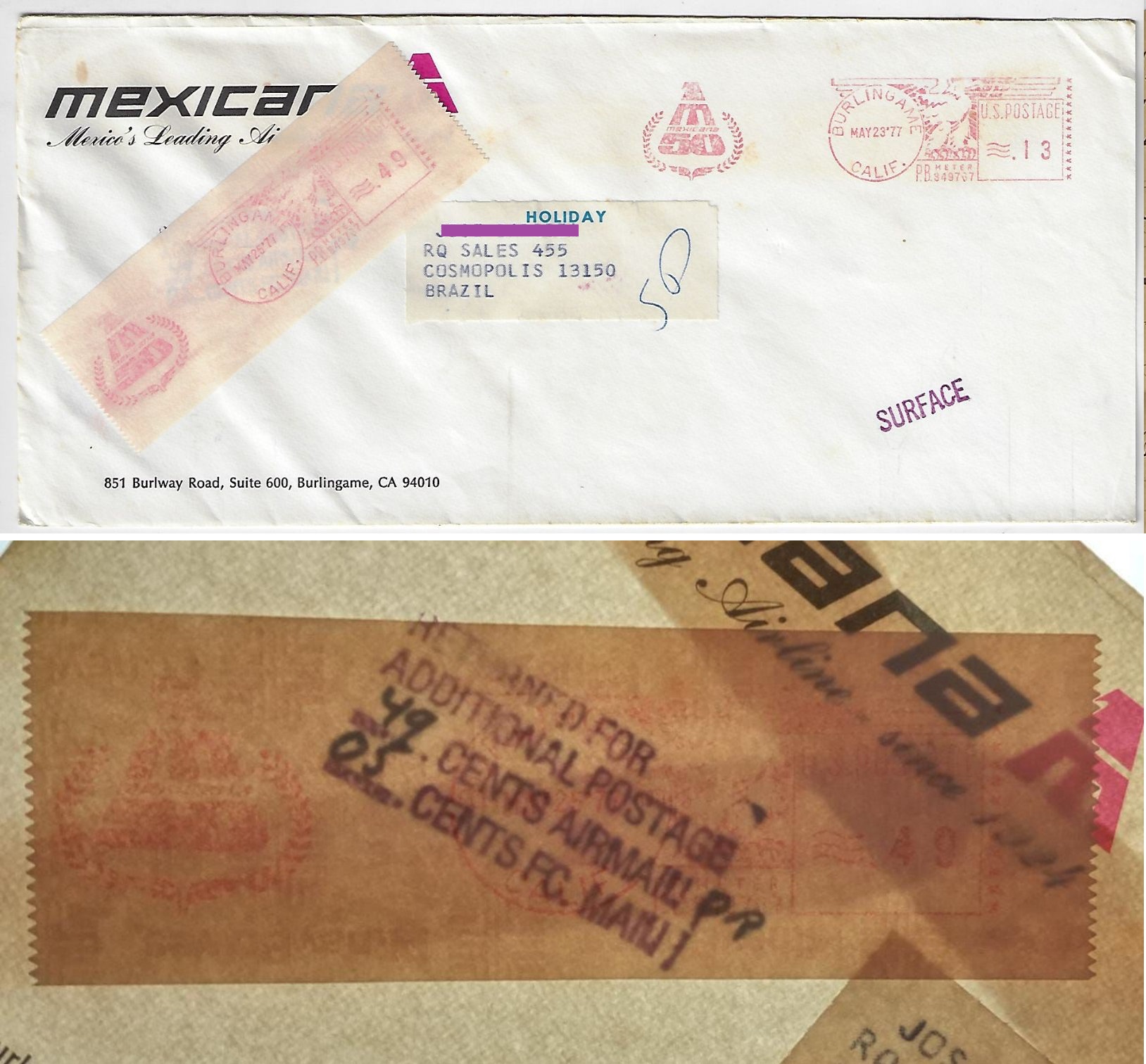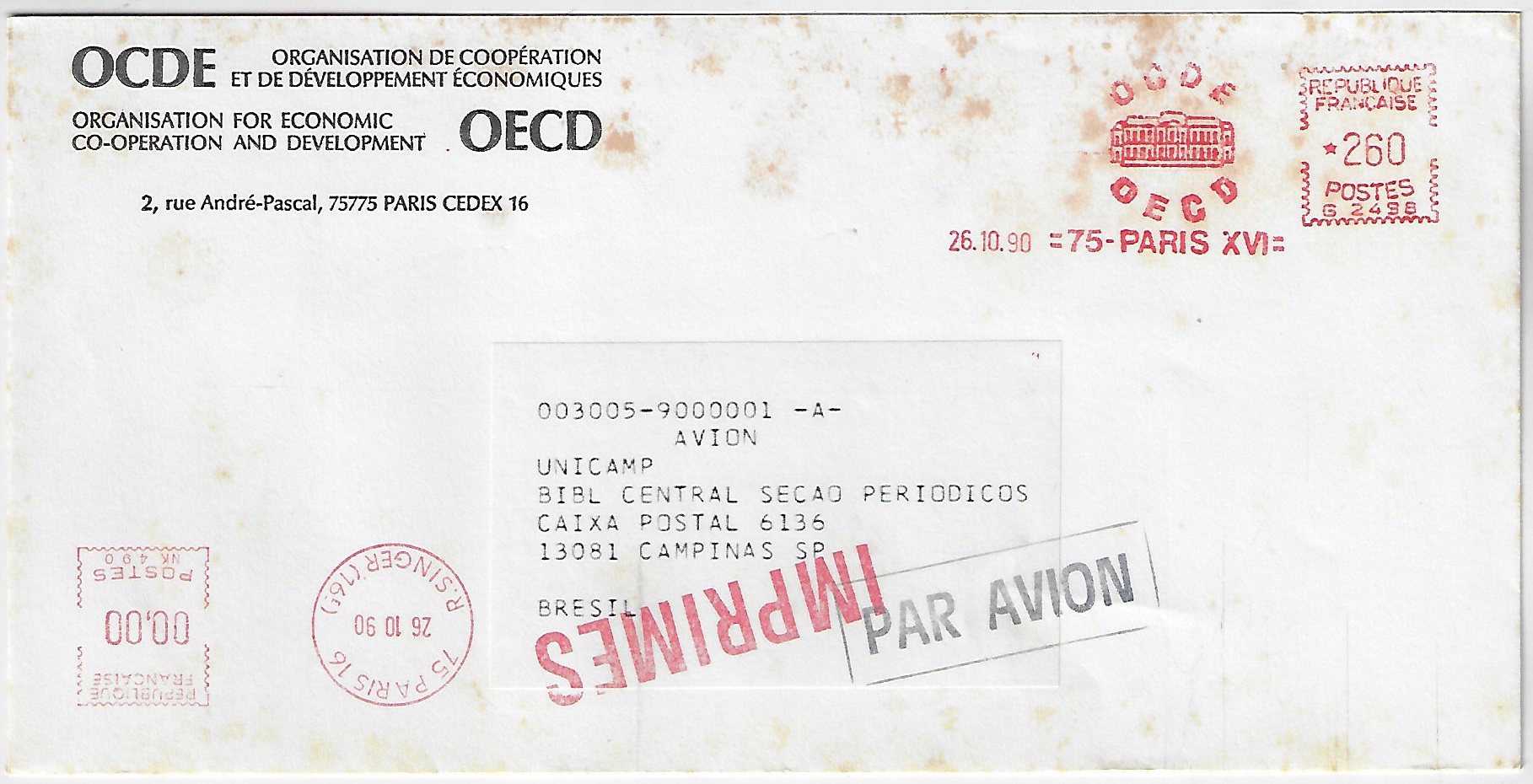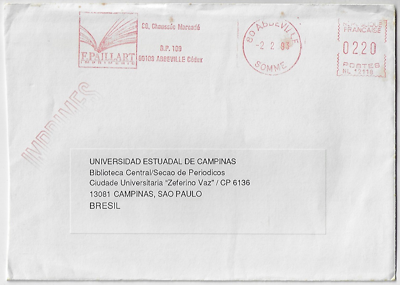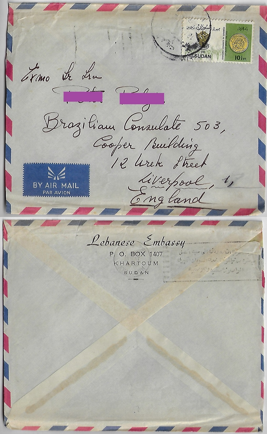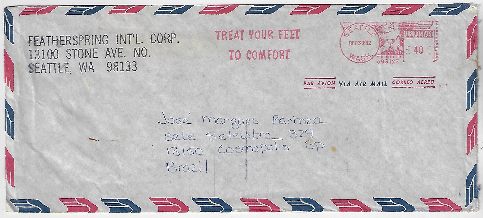| 79678 | África do Sul, 1979, envelope aéreo enviado de Eppingust (13/7) para São Paulo, porteado com franquia mecânica Roneo Neopost "205/2205" com slogan Barclays National Bank Ltd | 10,00 | Foto |