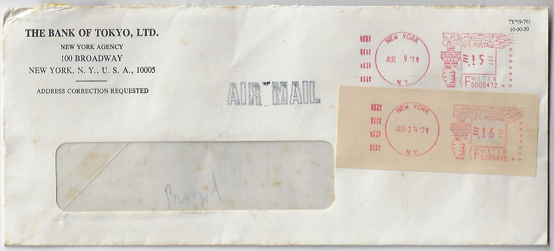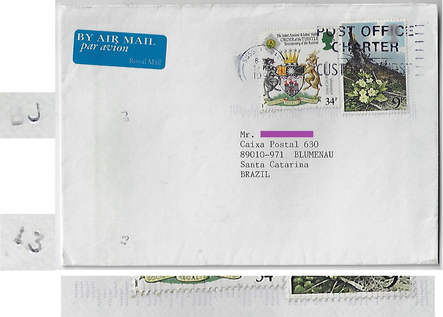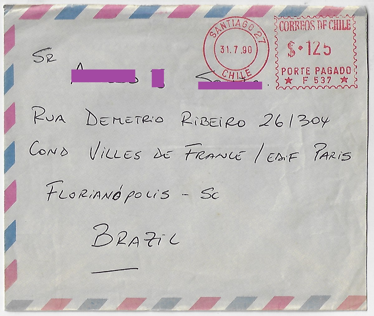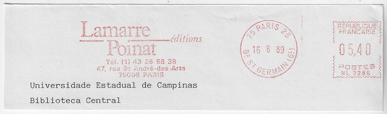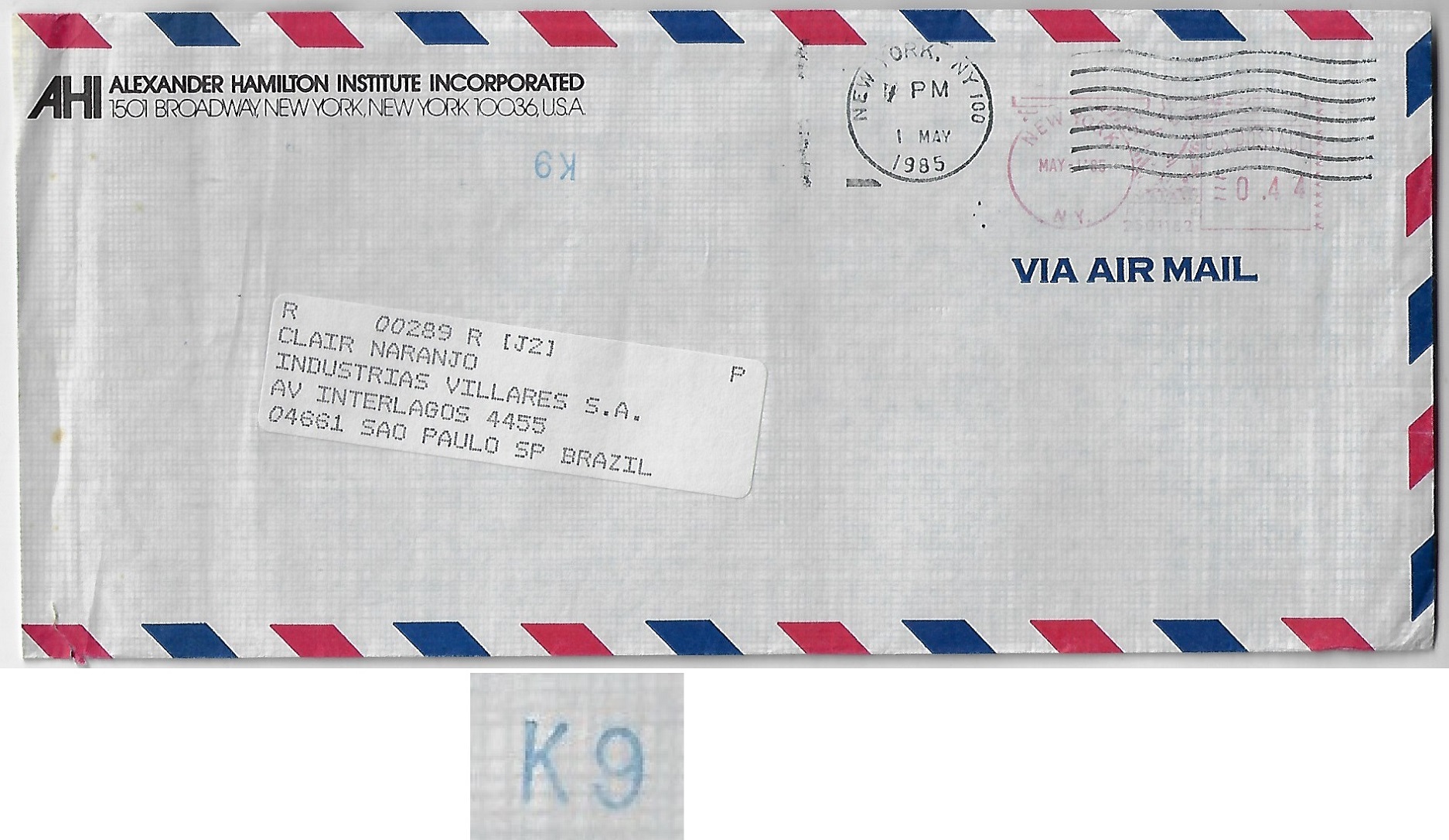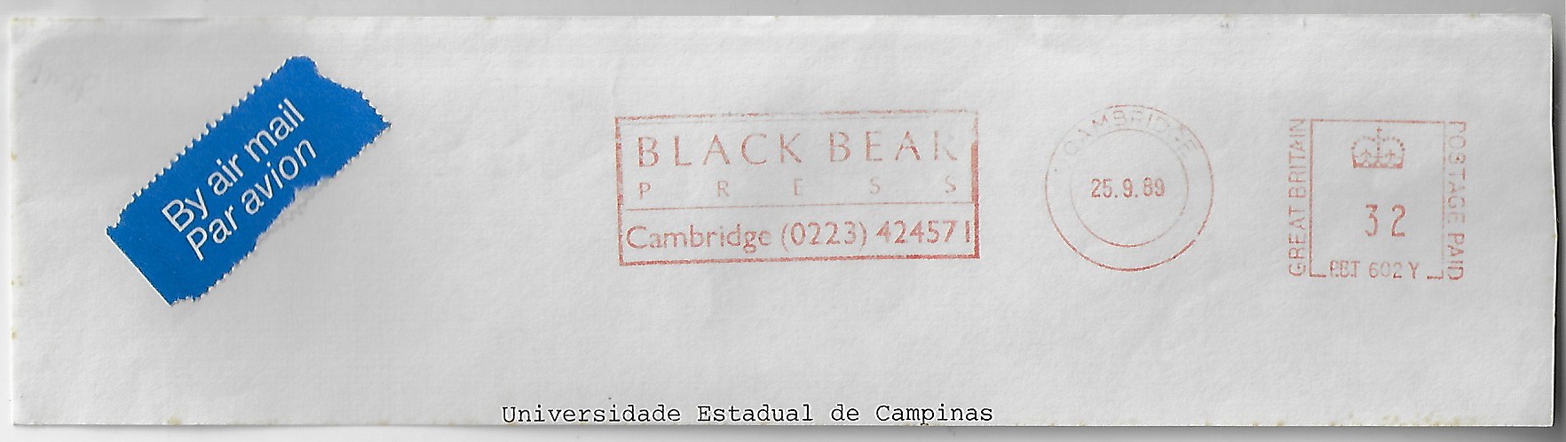 | 79678 | África do Sul, 1979, envelope aéreo enviado de Eppingust (13/7) para São Paulo, porteado com franquia mecânica Roneo Neopost "205/2205" com slogan Barclays National Bank Ltd | 10,00 | Foto |