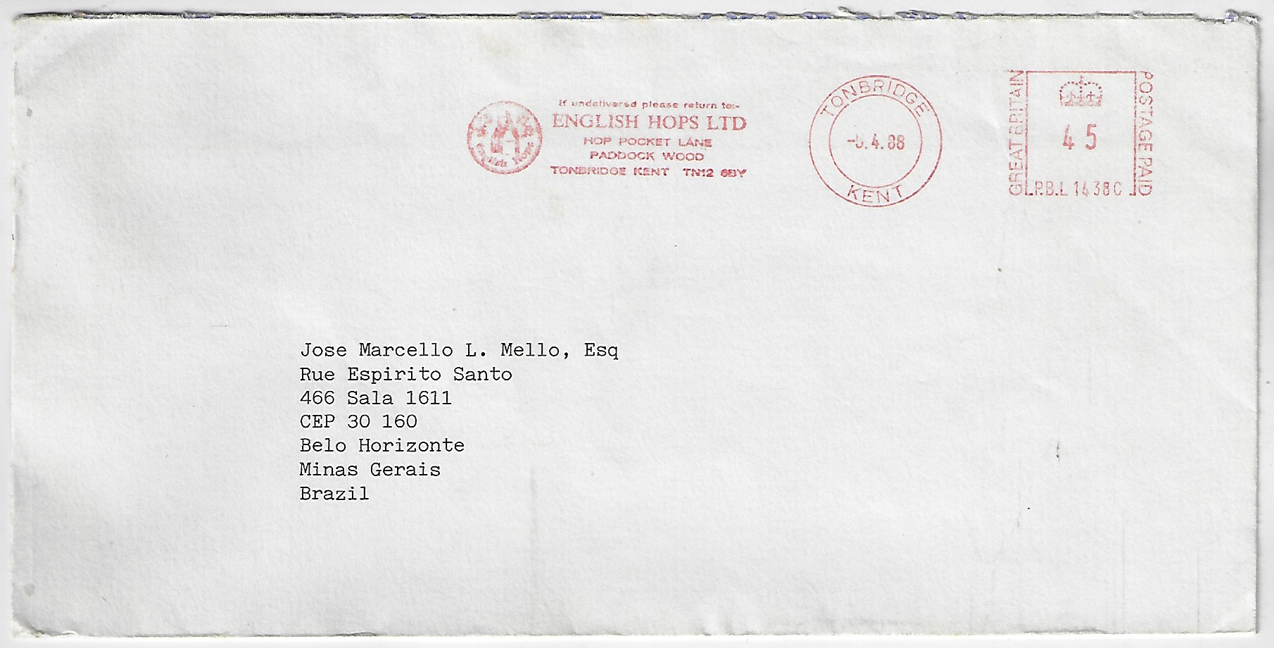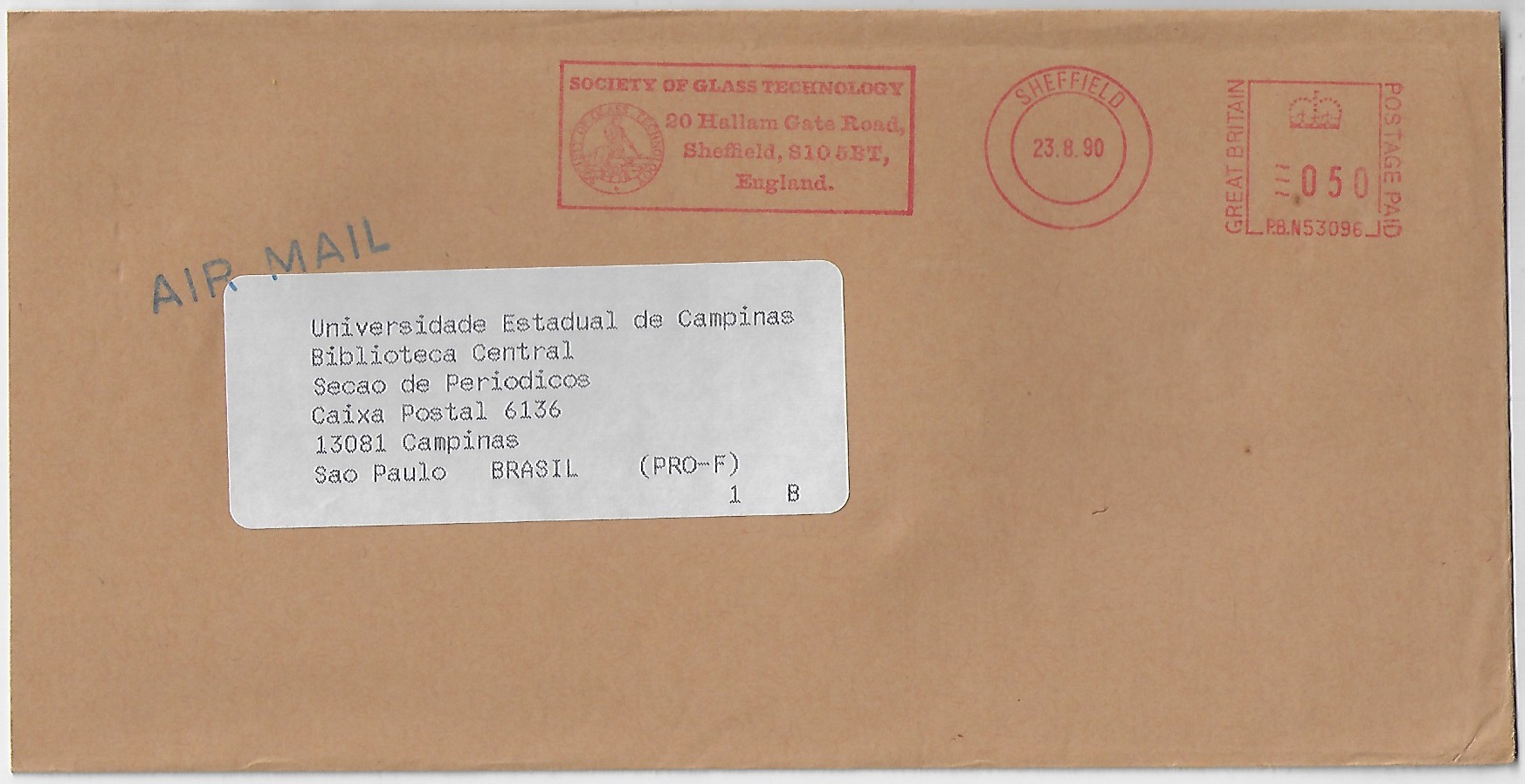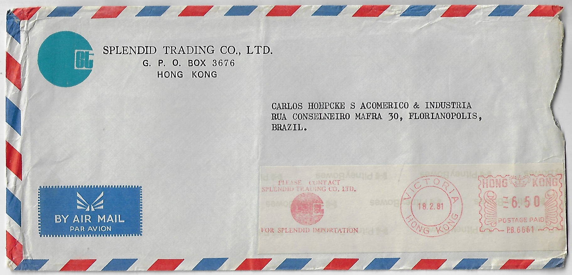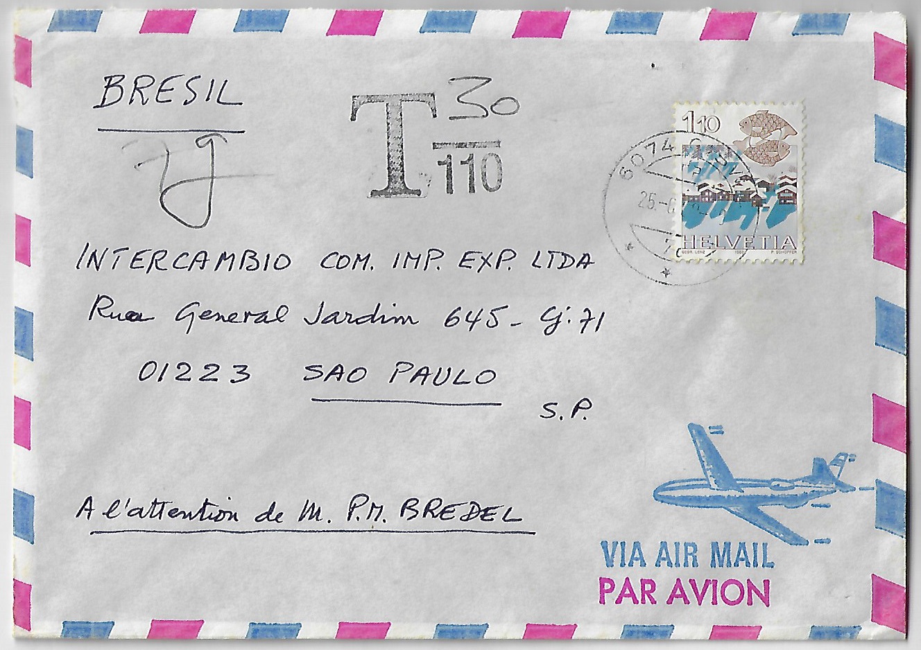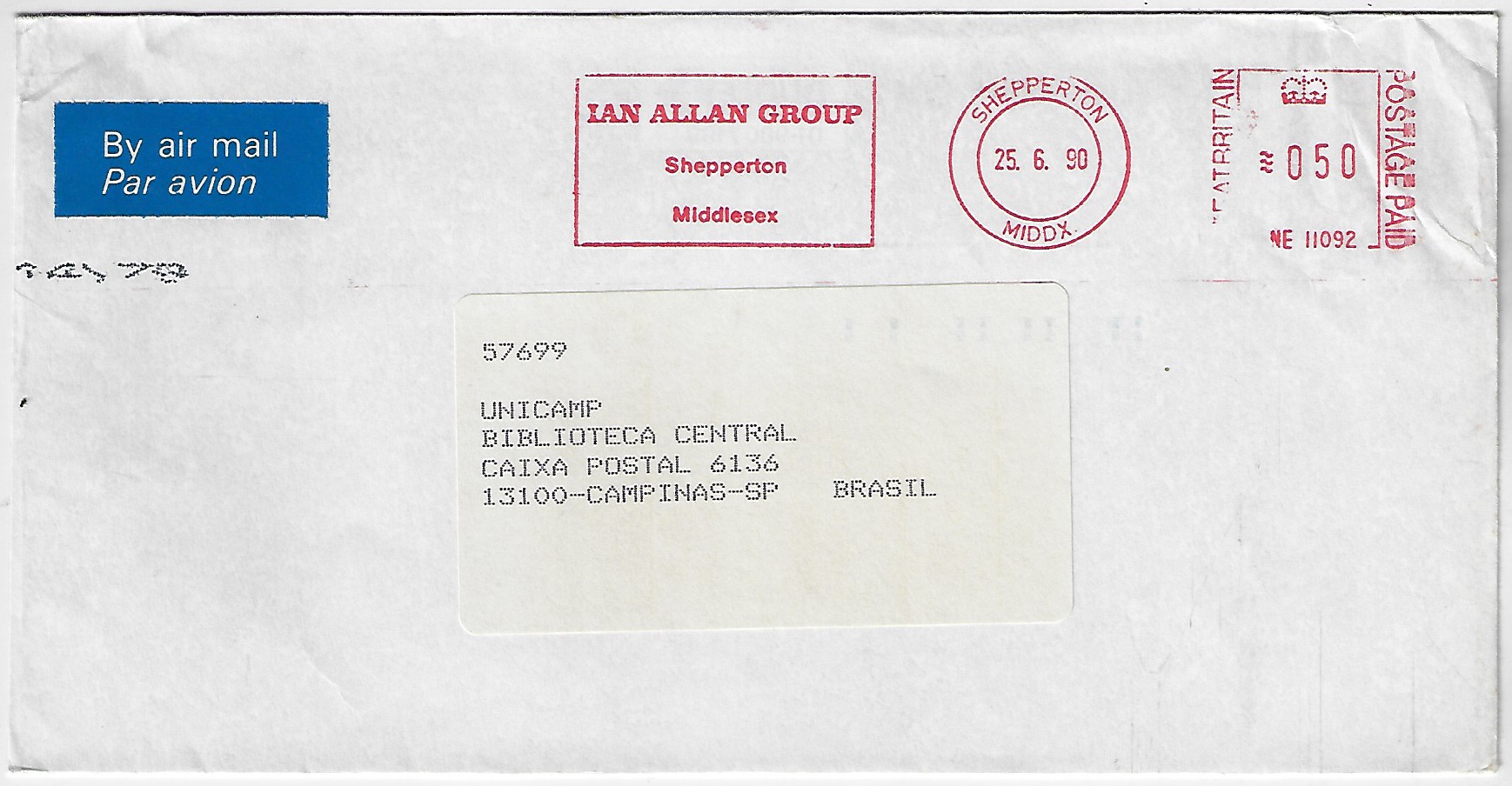 | 79678 | África do Sul, 1979, envelope aéreo enviado de Eppingust (13/7) para São Paulo, porteado com franquia mecânica Roneo Neopost "205/2205" com slogan Barclays National Bank Ltd | 10,00 | Foto |