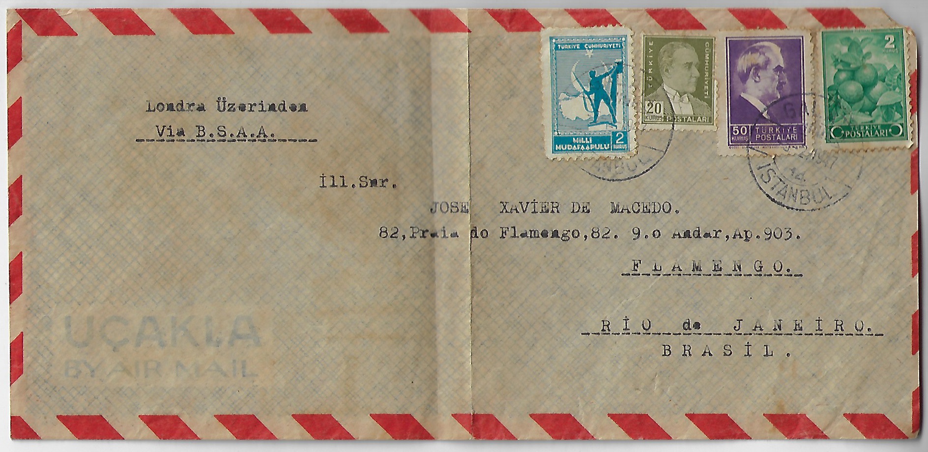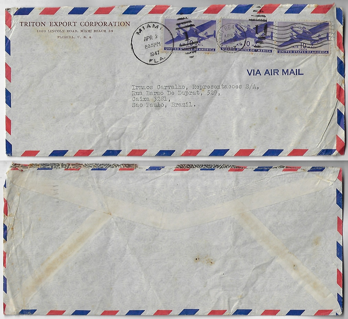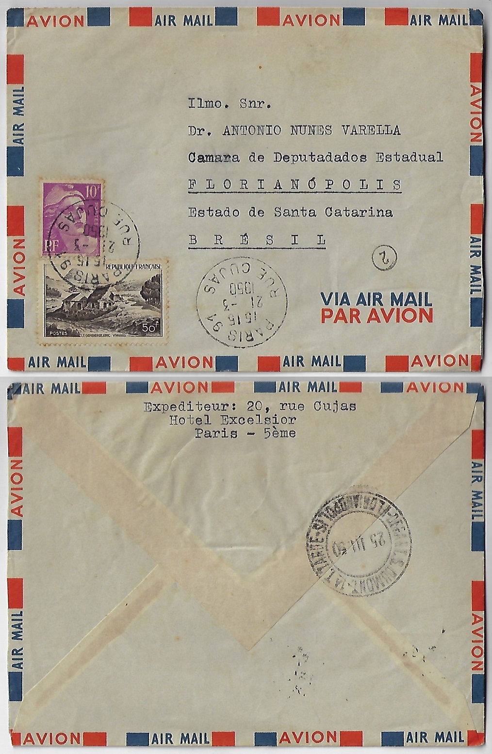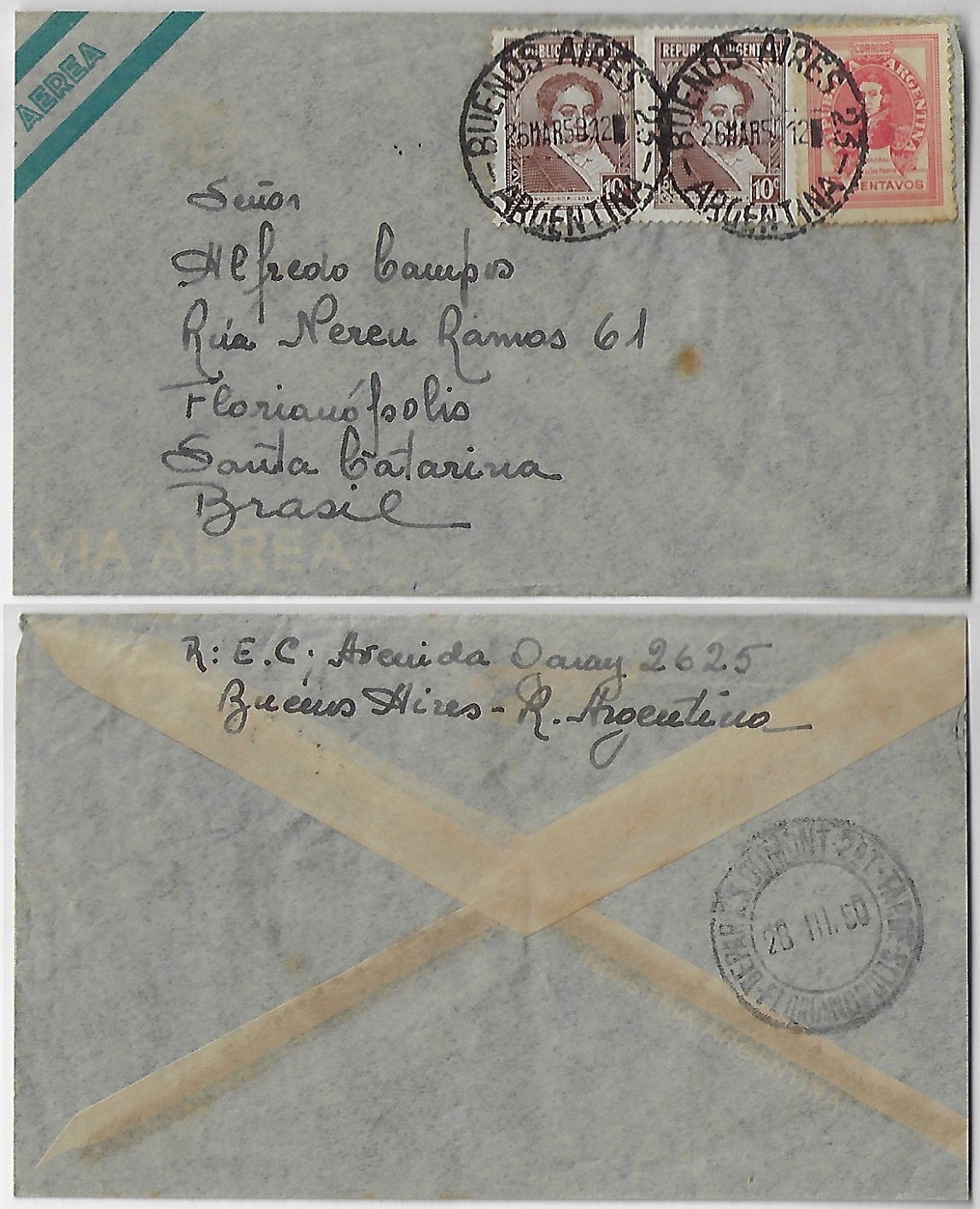 | 81071 | Argentina, 1950, envelope aéreo de Buenos Aires (25/3)para Florianópolis (28/3), porteado com 3 selos | 10,00 | Foto |