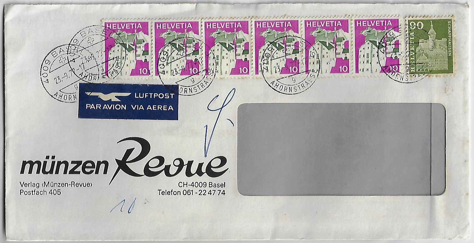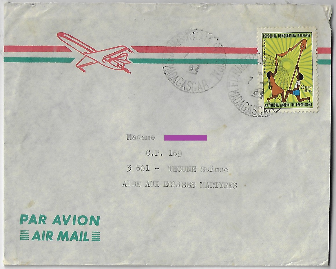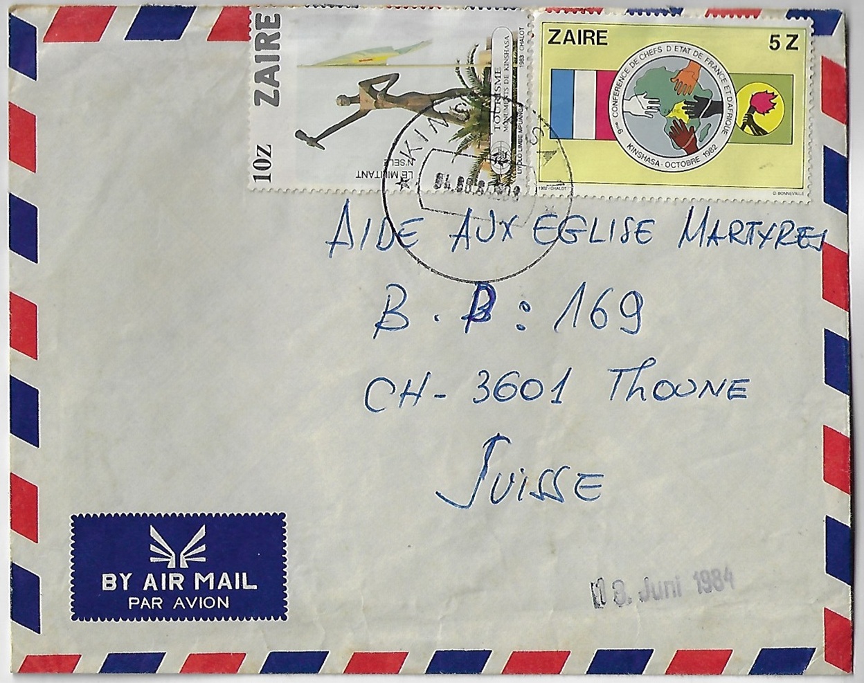 | 84661 | Zaire, 1984, envelope aéreo enviado de Kinshasa para Thoune / Suíça, porteado com selos Conferência de Chefes de Estado da França e da África e Escultura "Le Militant" | 10,00 | Foto |