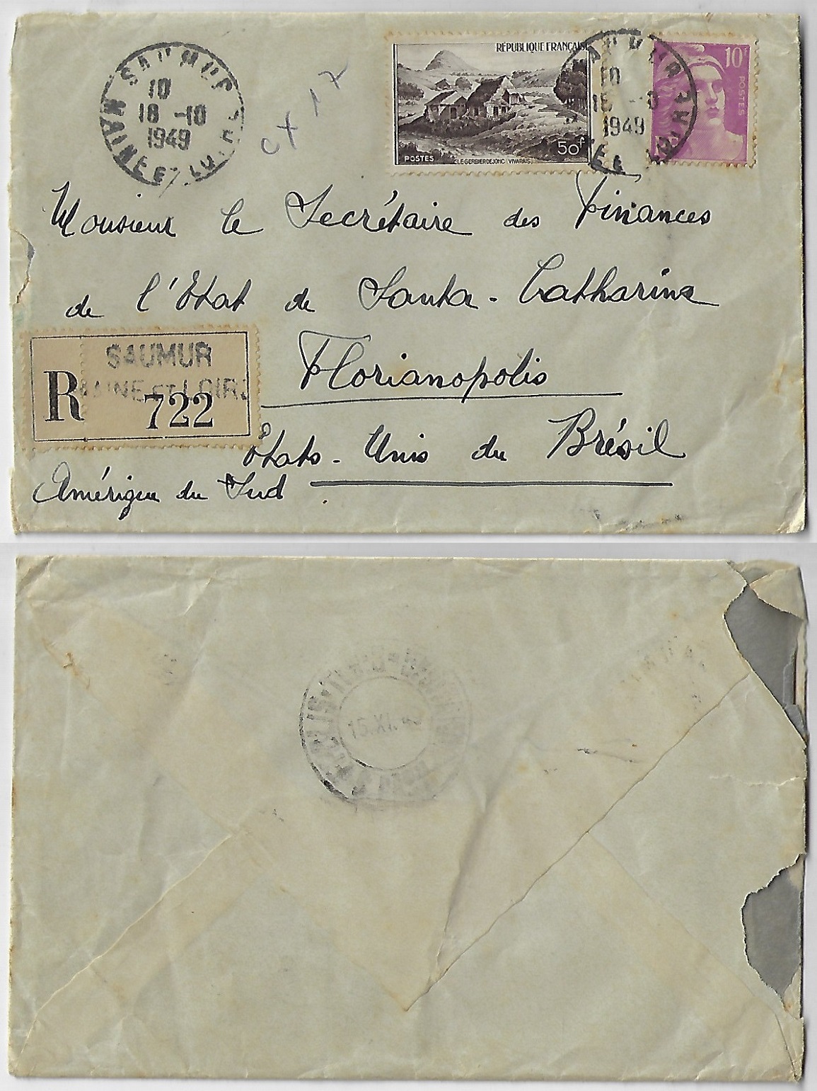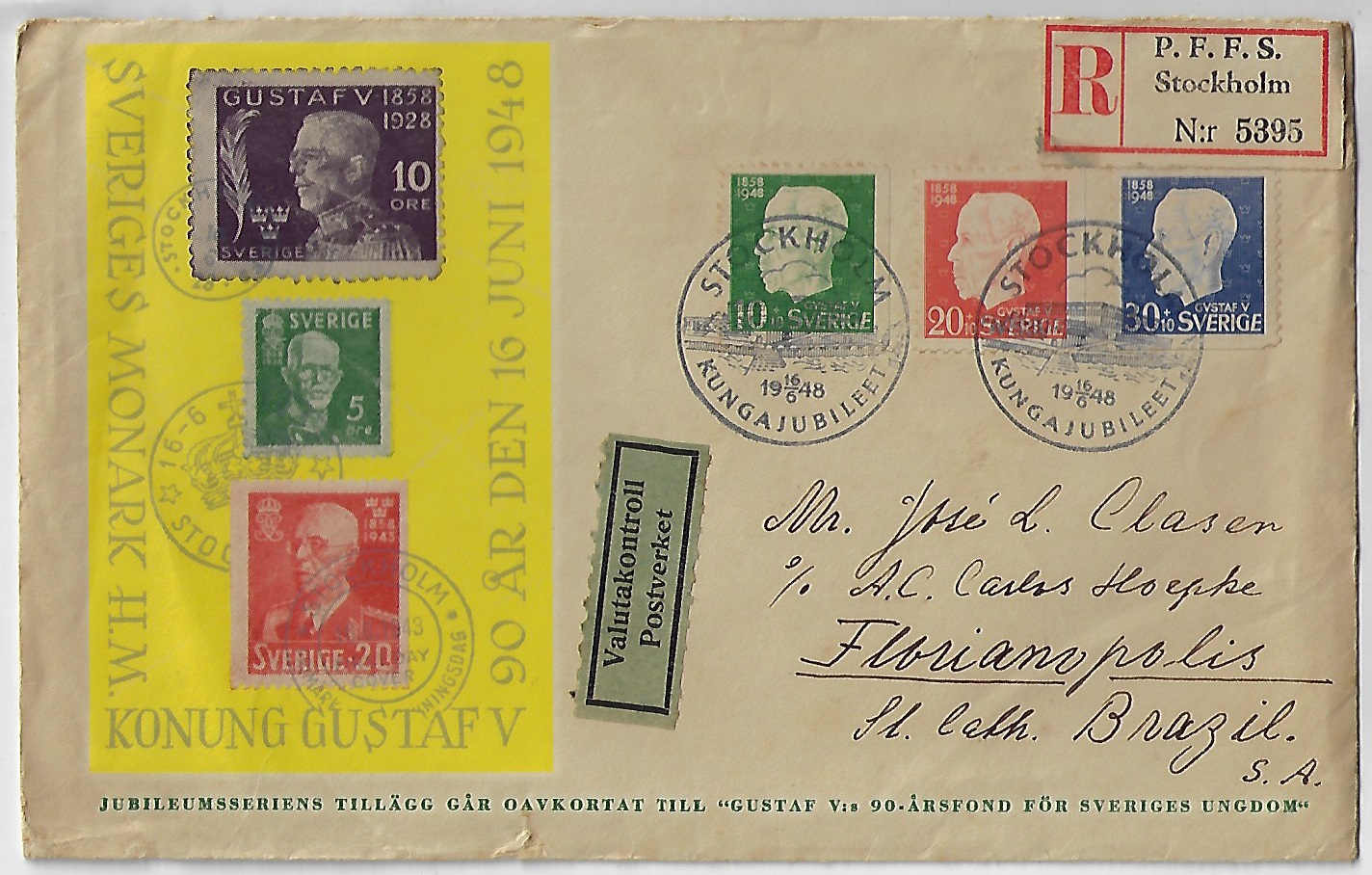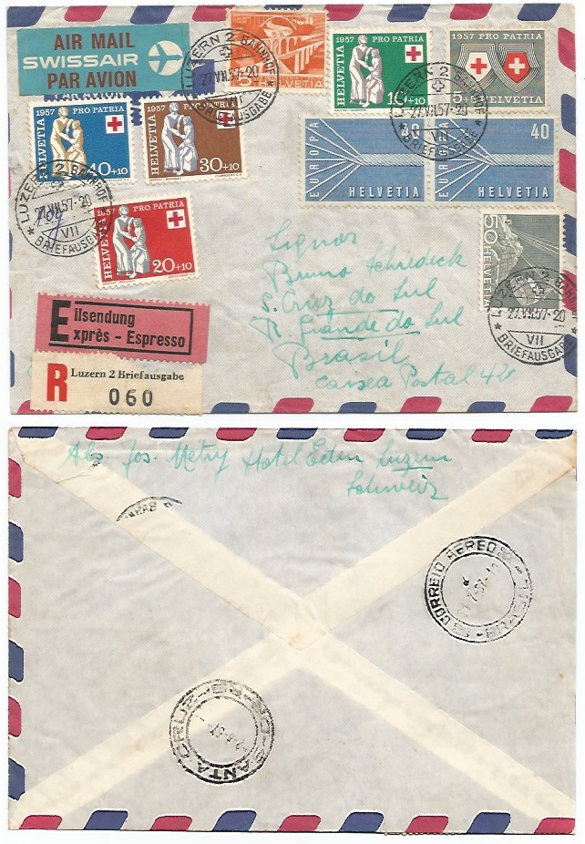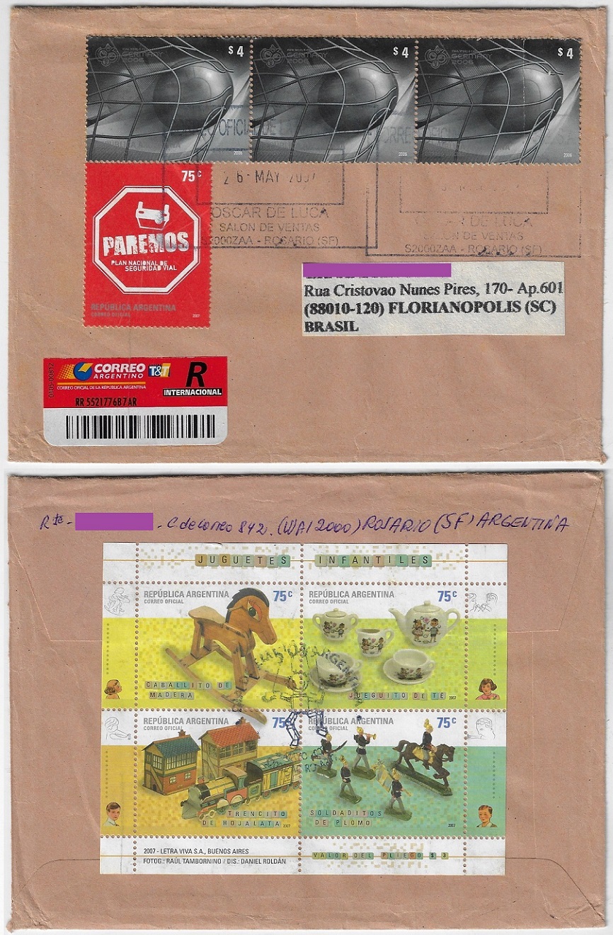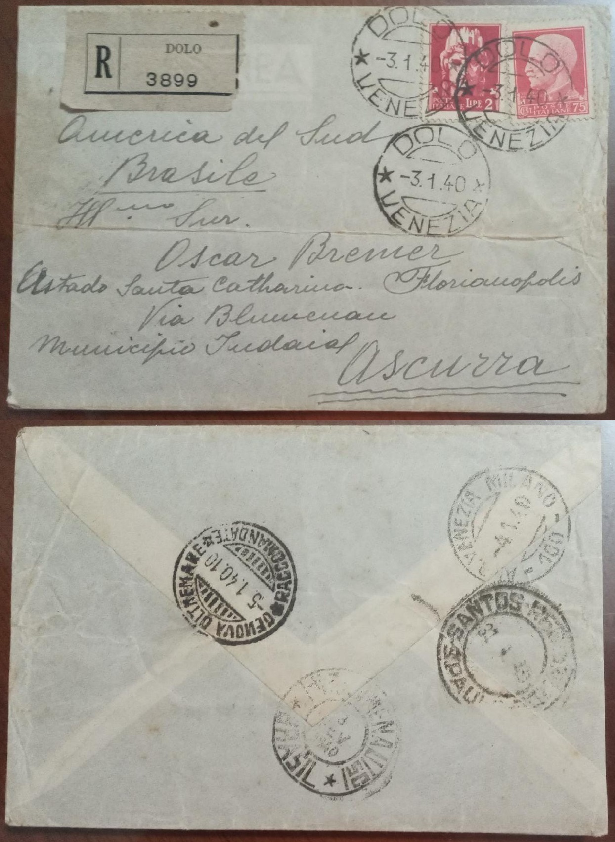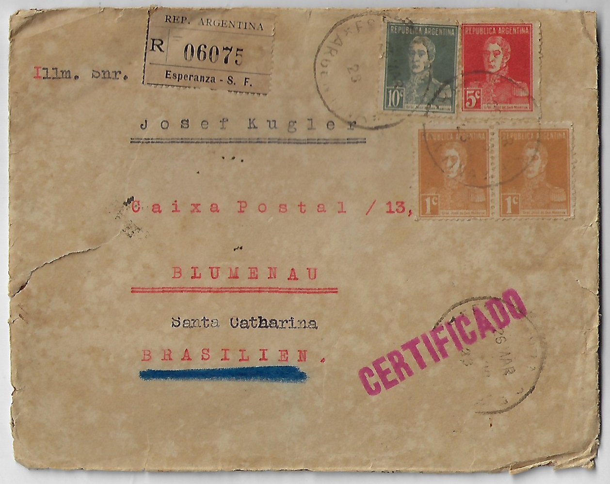 | 79938 | Argentina, 1928, envelope registrado enviado de Esperanza (26/3) para Blumenau, passagem por Buenos Aires (27/3) e Florianópolis (3/4), porteado com 4 selos General San Martin 1, 5 e 10 Centavos | 10,00 | Foto |