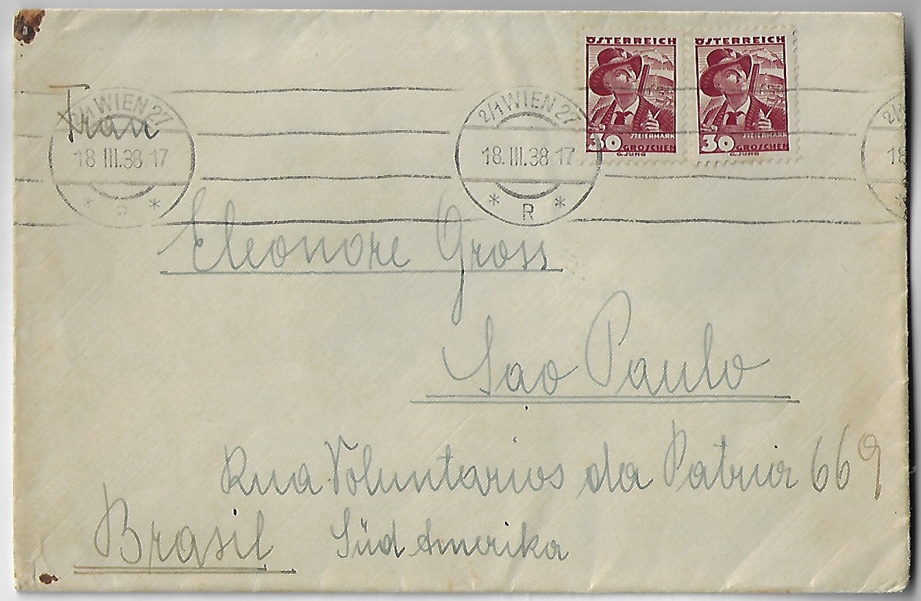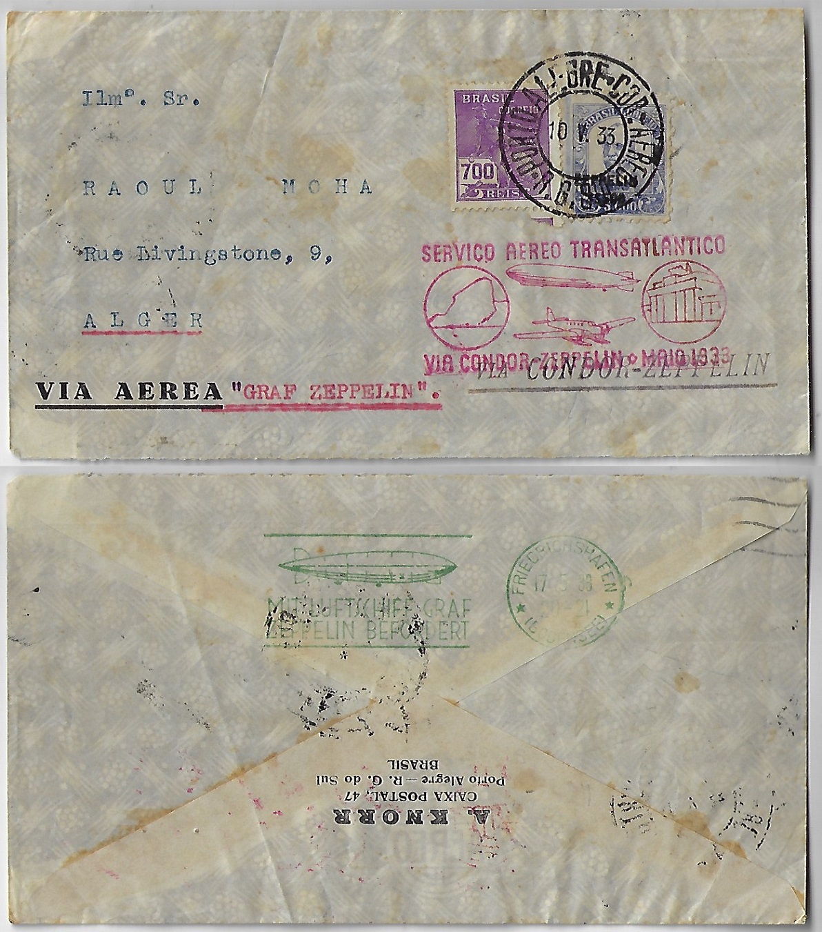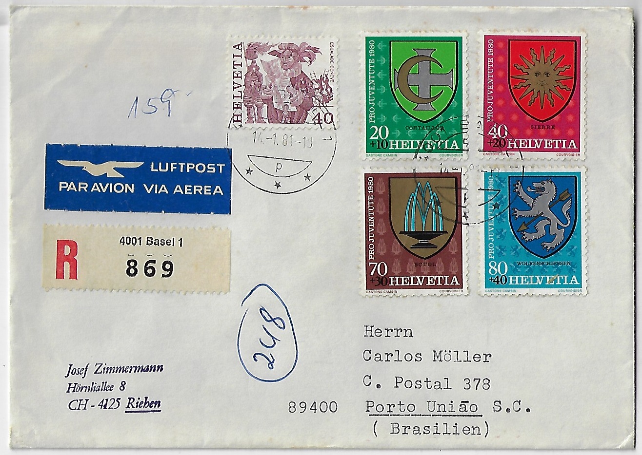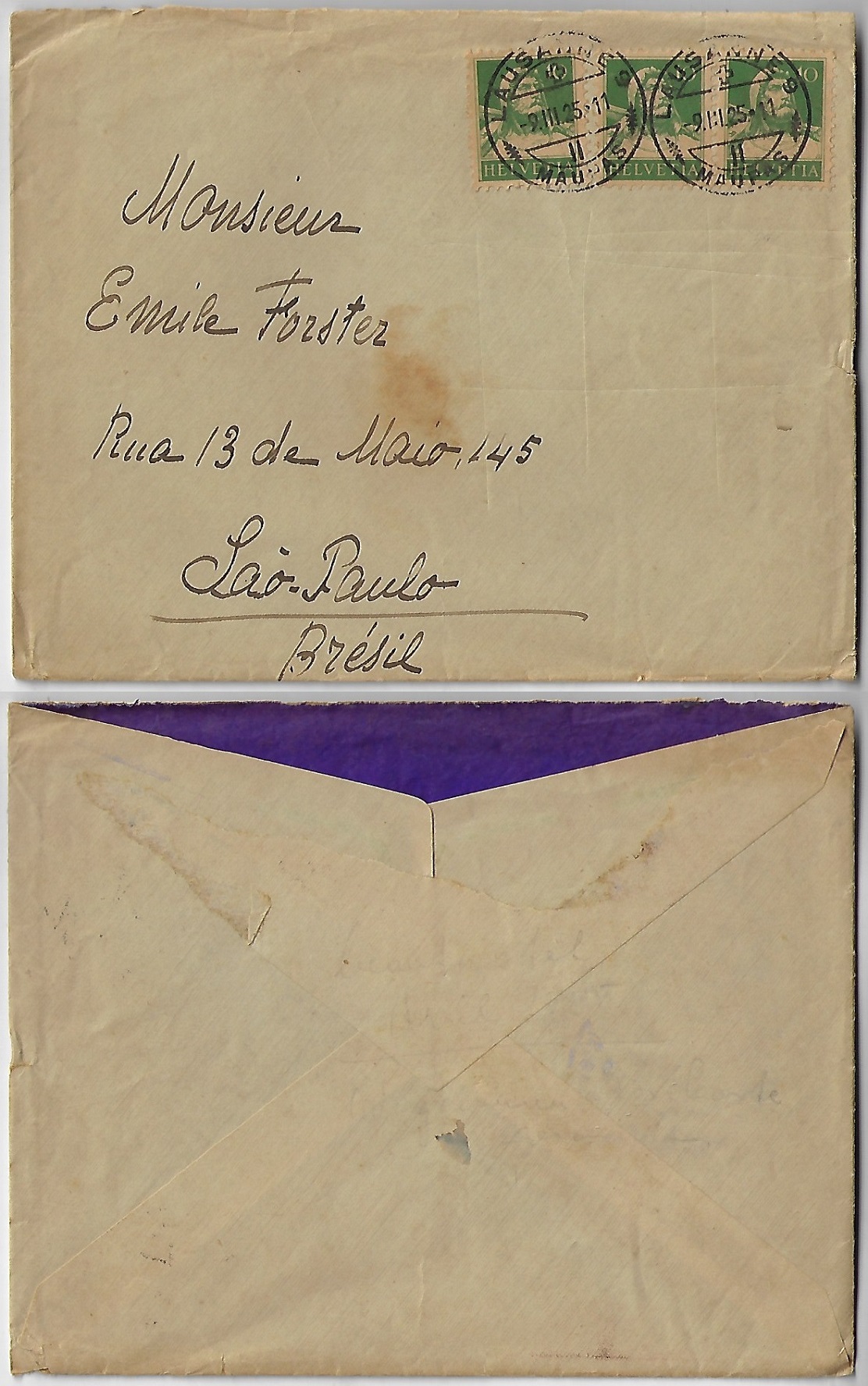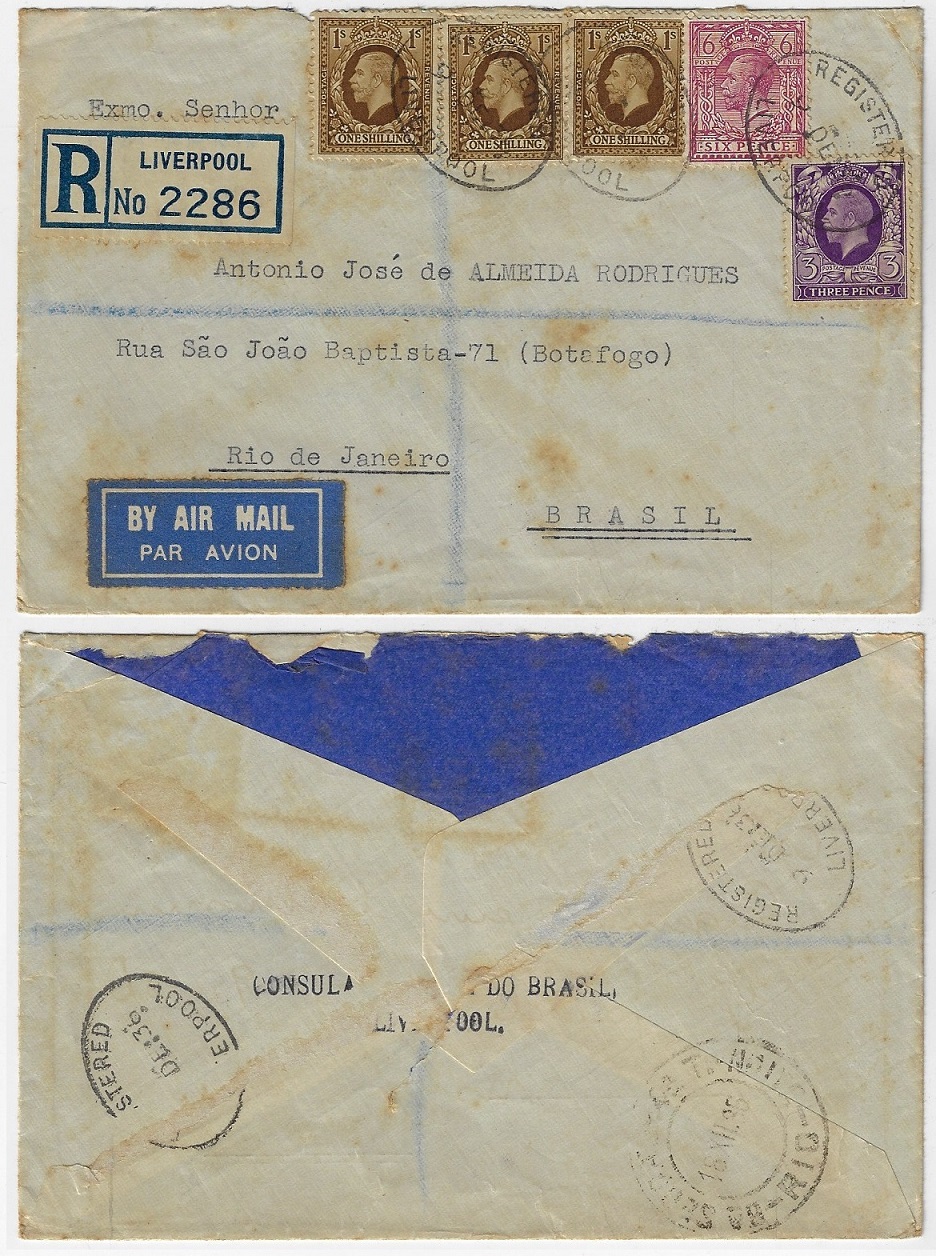 | 79938 | Argentina, 1928, envelope registrado enviado de Esperanza (26/3) para Blumenau, passagem por Buenos Aires (27/3) e Florianópolis (3/4), porteado com 4 selos General San Martin 1, 5 e 10 Centavos | 10,00 | Foto |