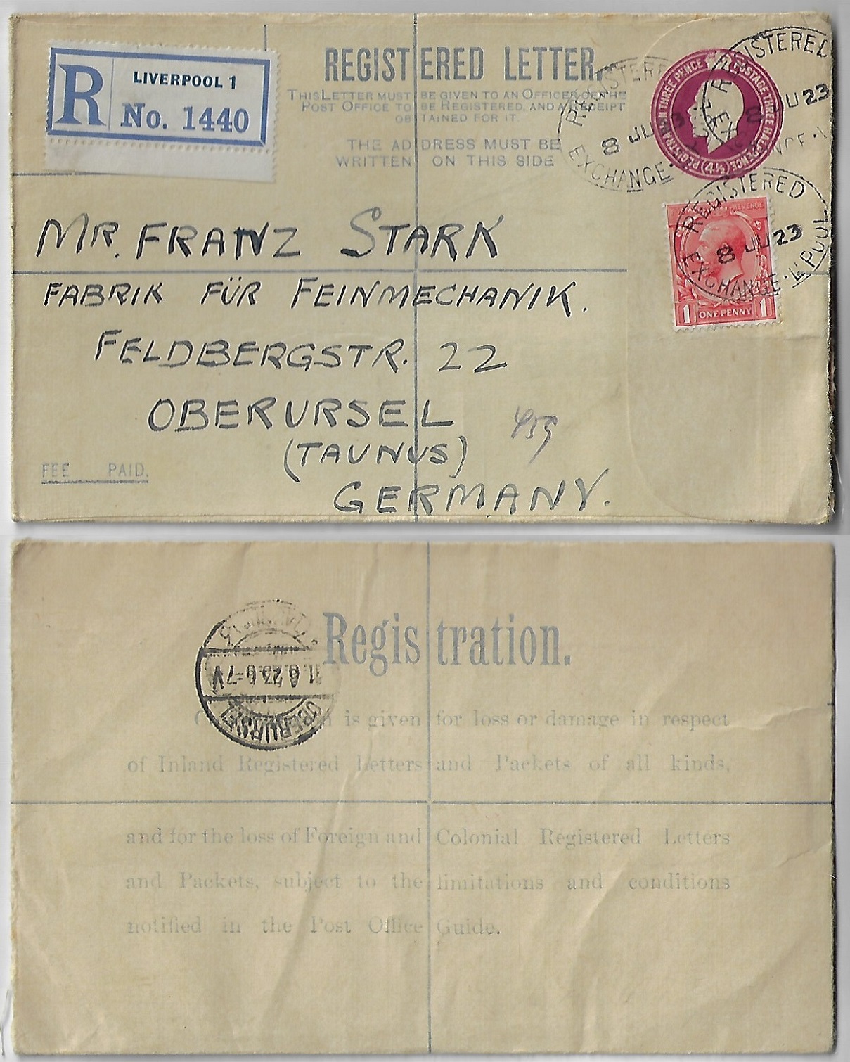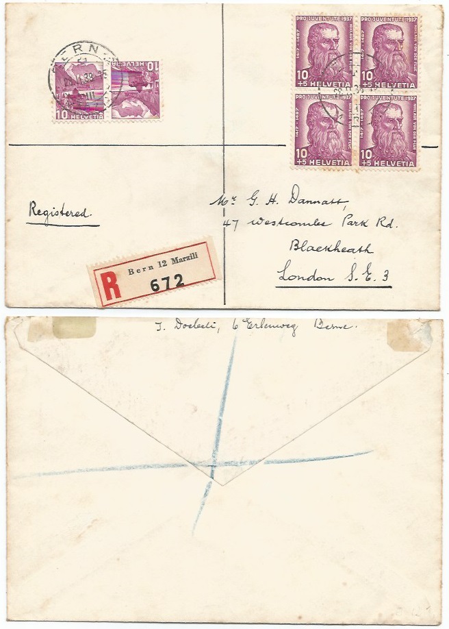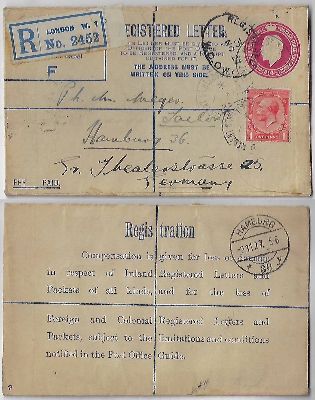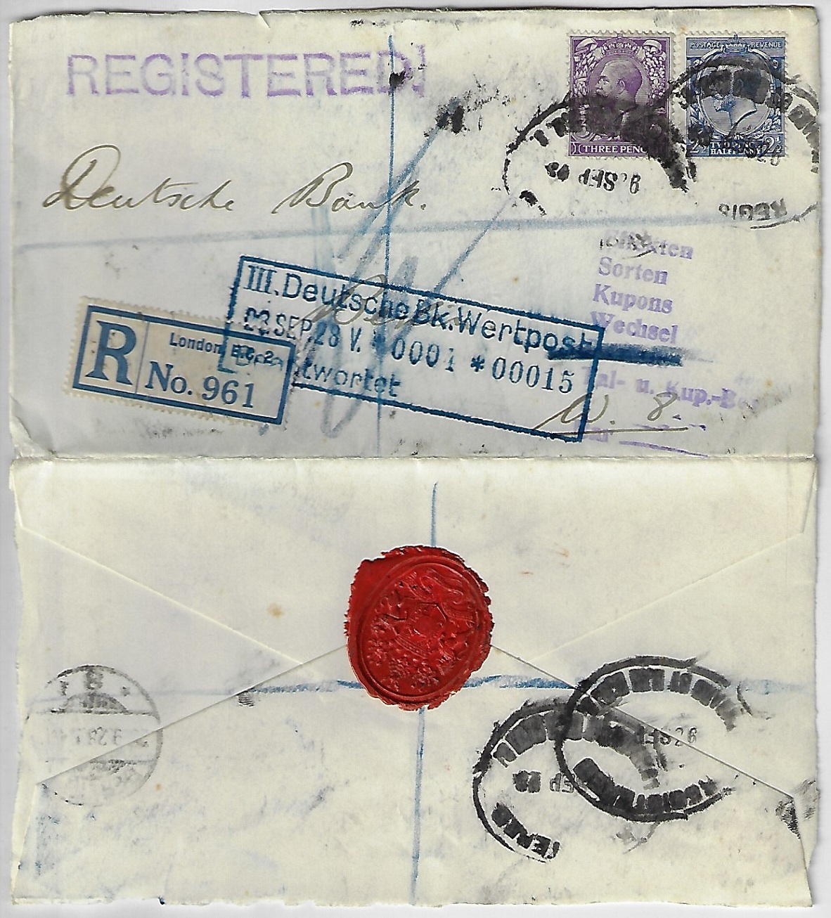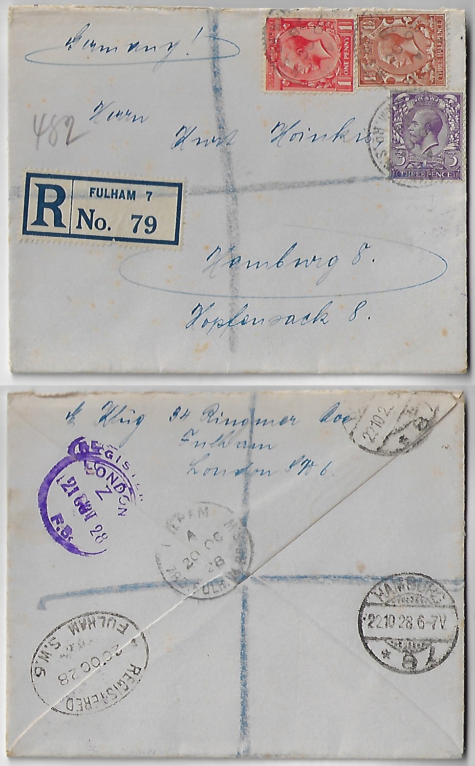 | 79938 | Argentina, 1928, envelope registrado enviado de Esperanza (26/3) para Blumenau, passagem por Buenos Aires (27/3) e Florianópolis (3/4), porteado com 4 selos General San Martin 1, 5 e 10 Centavos | 10,00 | Foto |