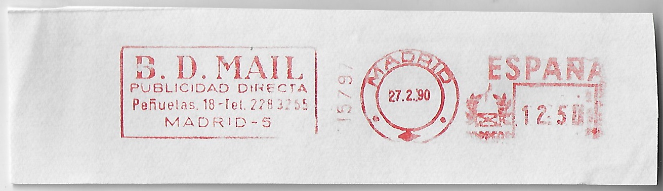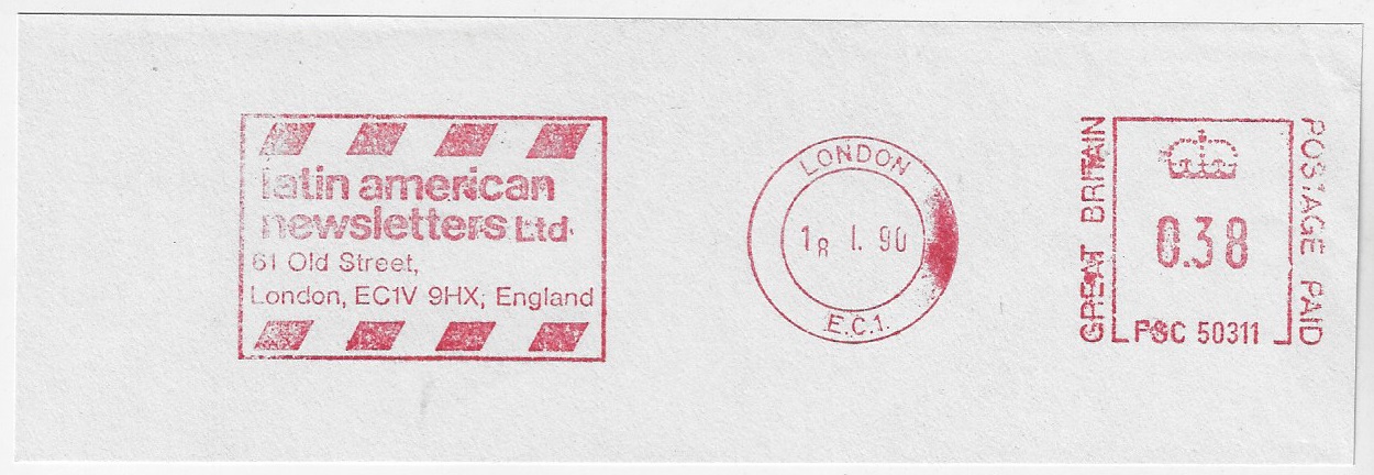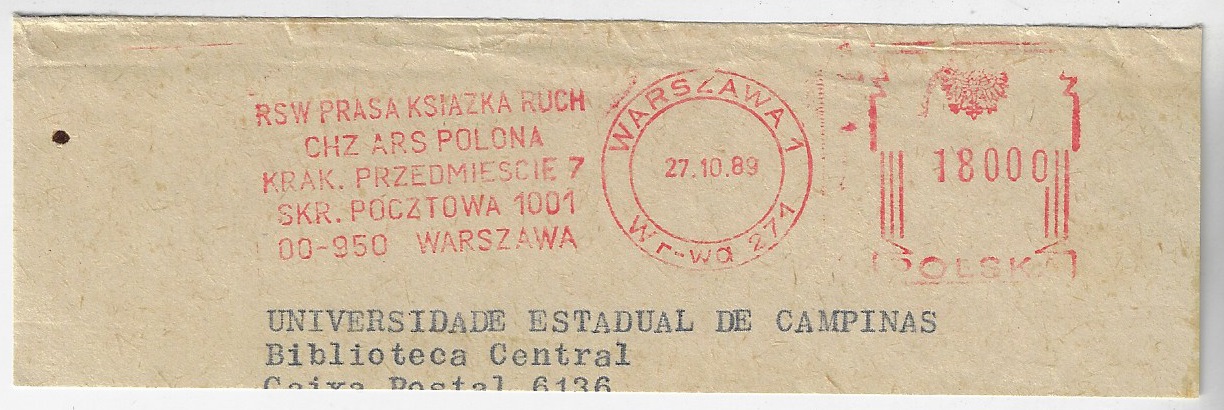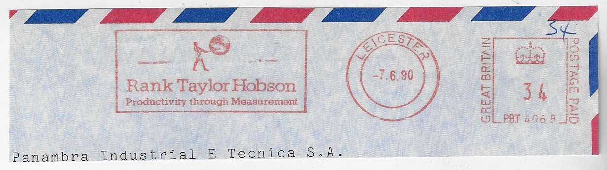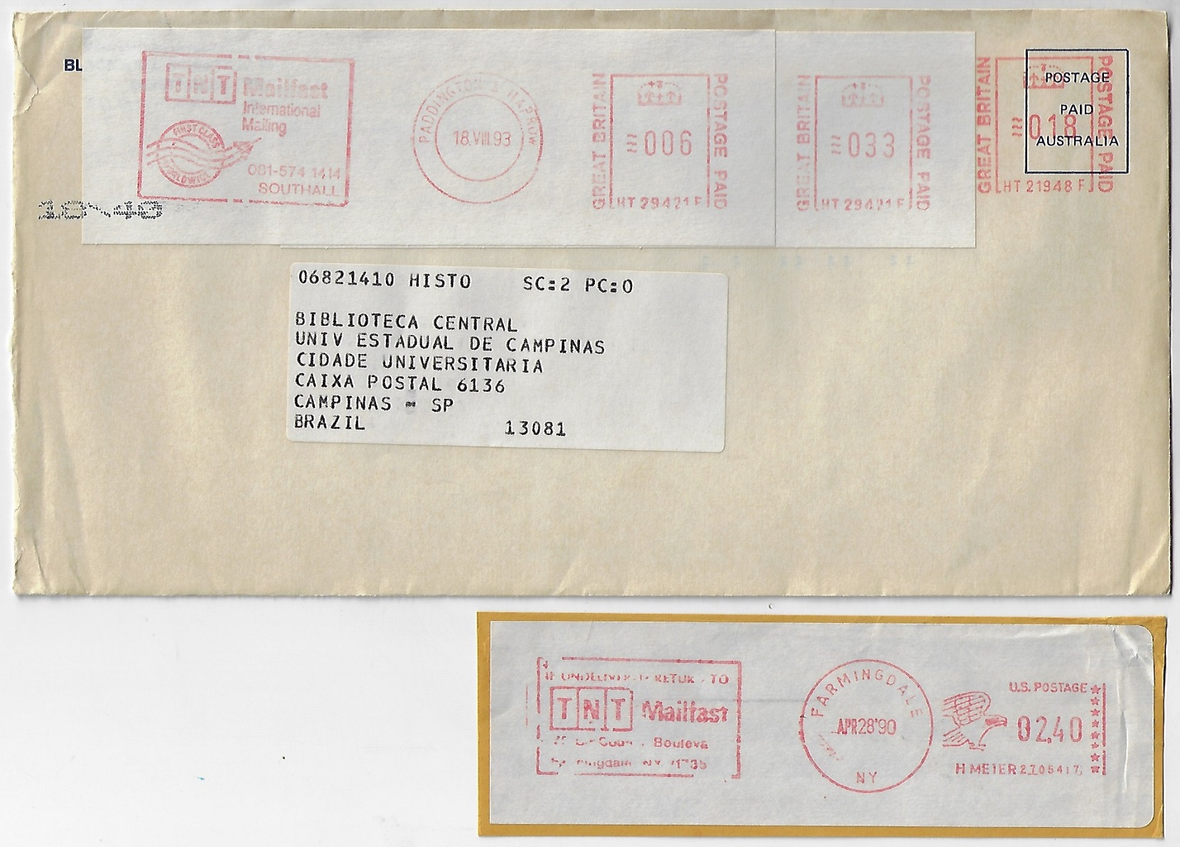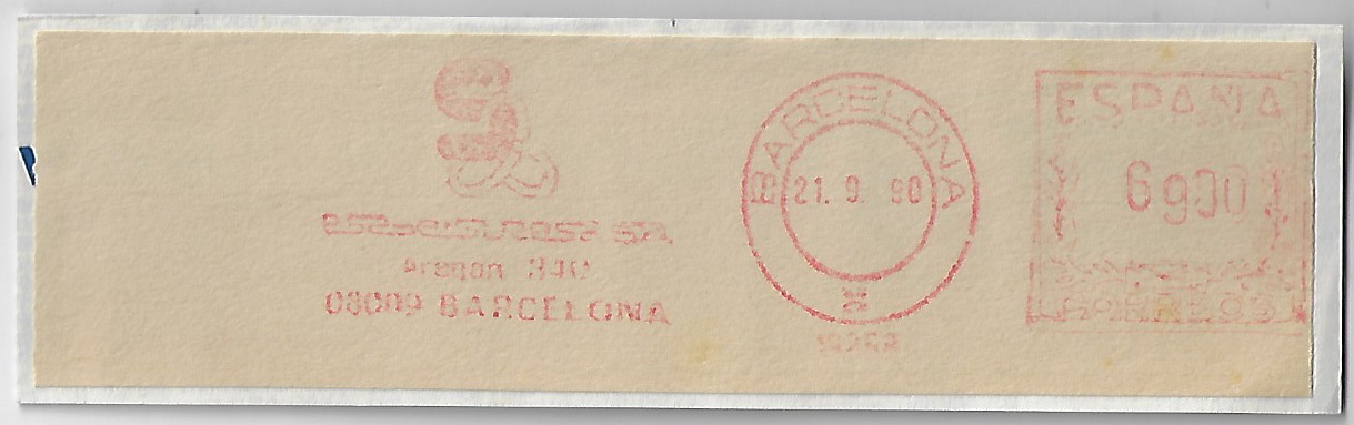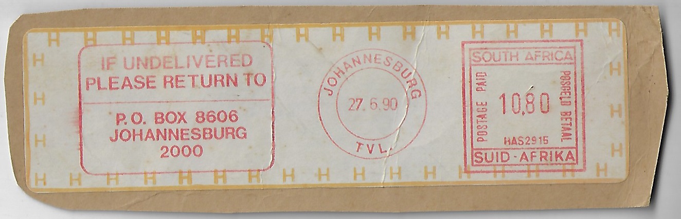 | 79903 | África do Sul, 1990, fragmento de envelope porteado com franquia mecânica Hasler sobre etiqueta, de Johannesburg | 10,00 | Foto |