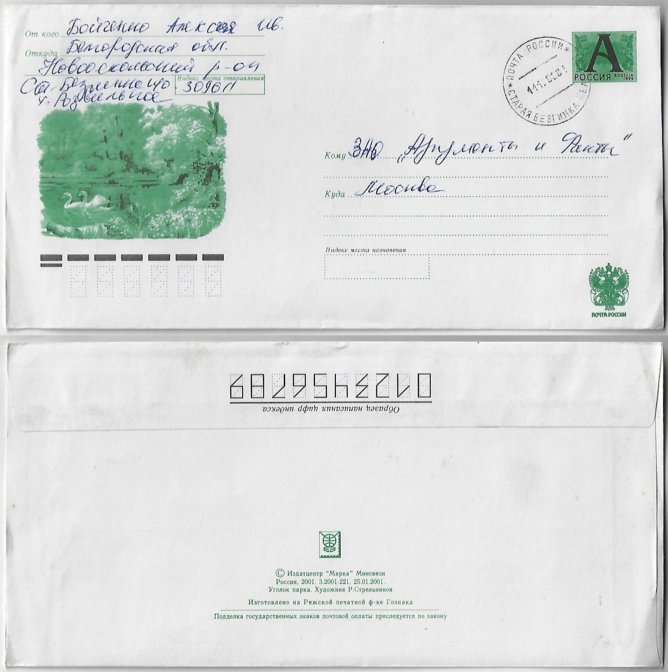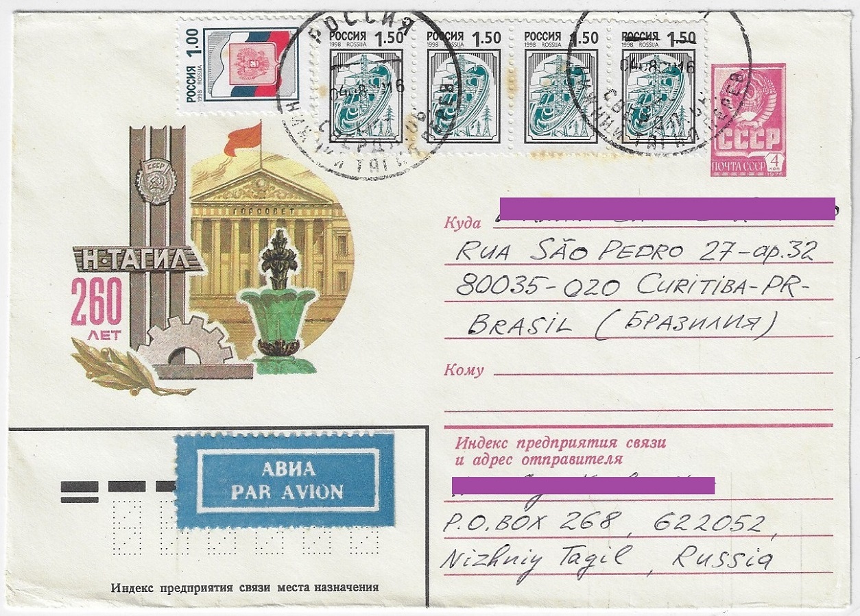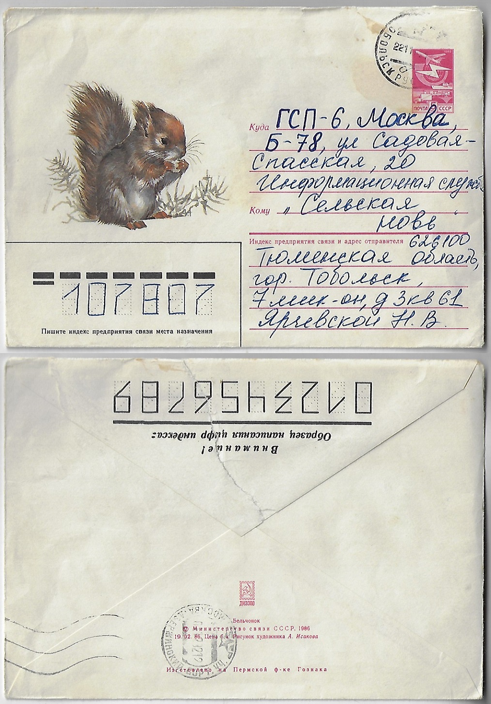 | 83714 | URSS, 1992, inteiro postal tipo envelope enviado de Tobolsk (22/11) para Moscou (1/12), com gravura de Esquilo comendo semente | 10,00 | Foto |