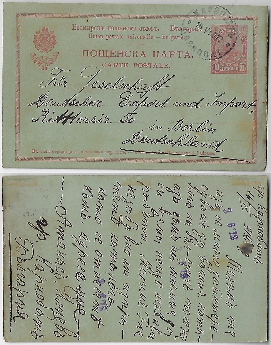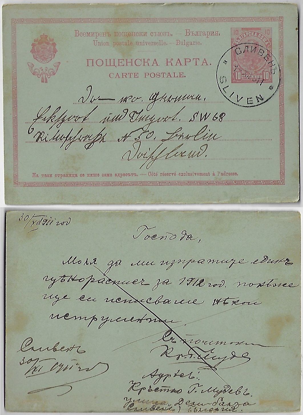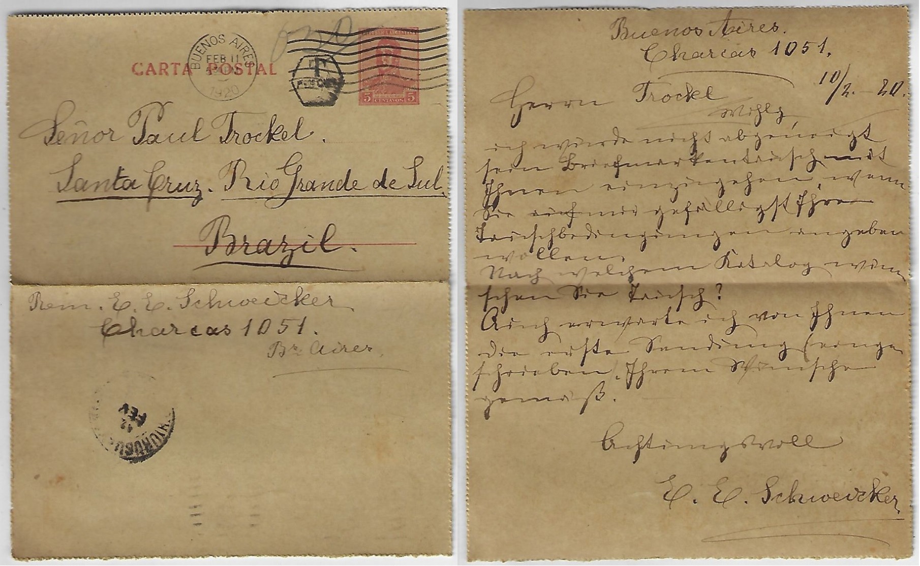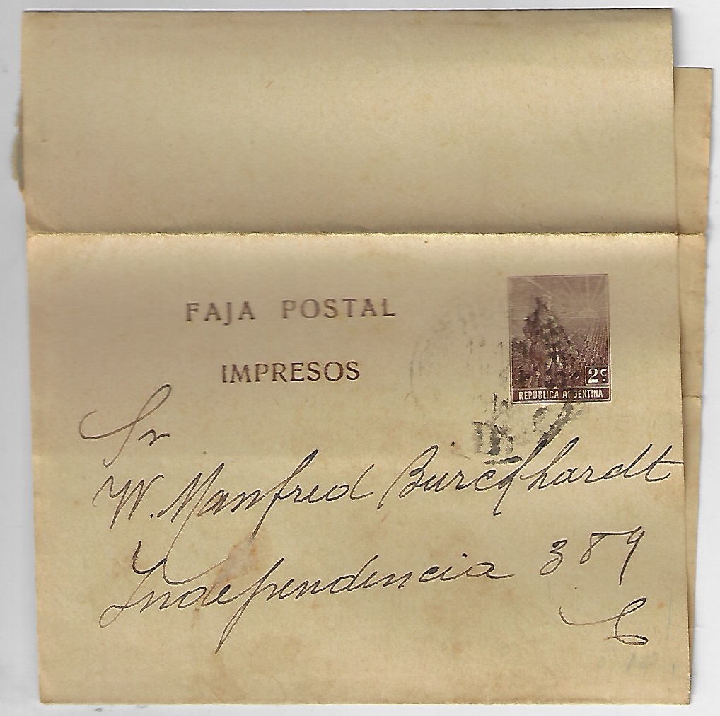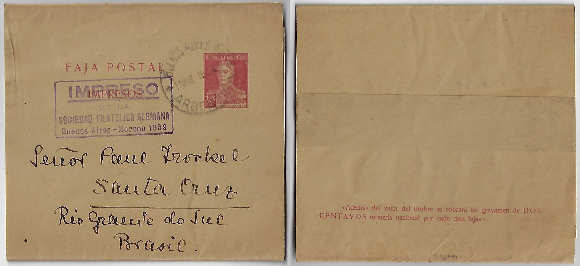 | 80459 | Argentina, 1920s, inteiro postal tipo cinta para jornais, selo ½ Centavo, enviado pela Sociedad Filatélica Alemana de Buenos Aires (11/3) para Santa Cruz / Brasil | 10,00 | Foto |