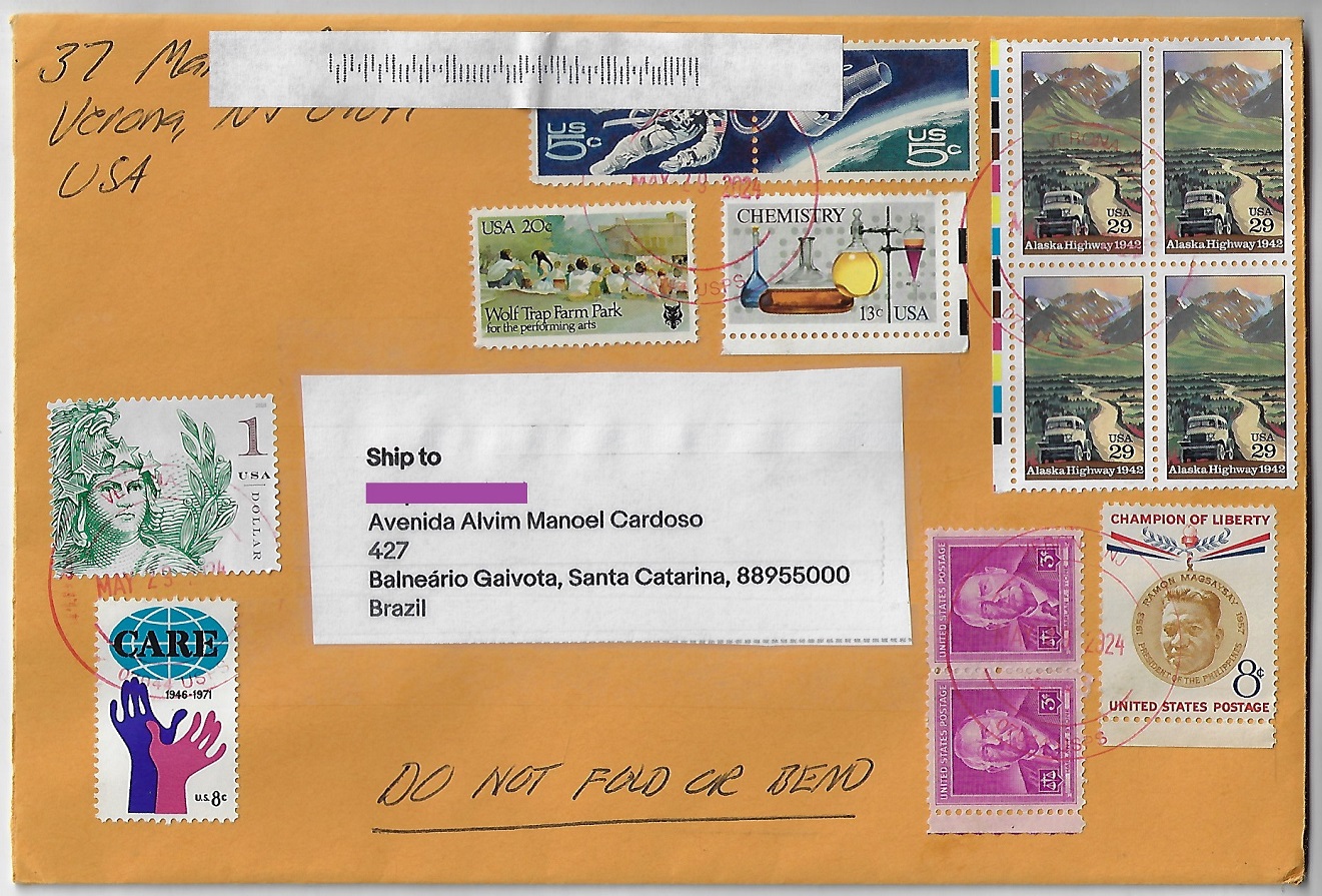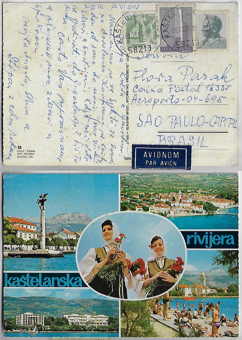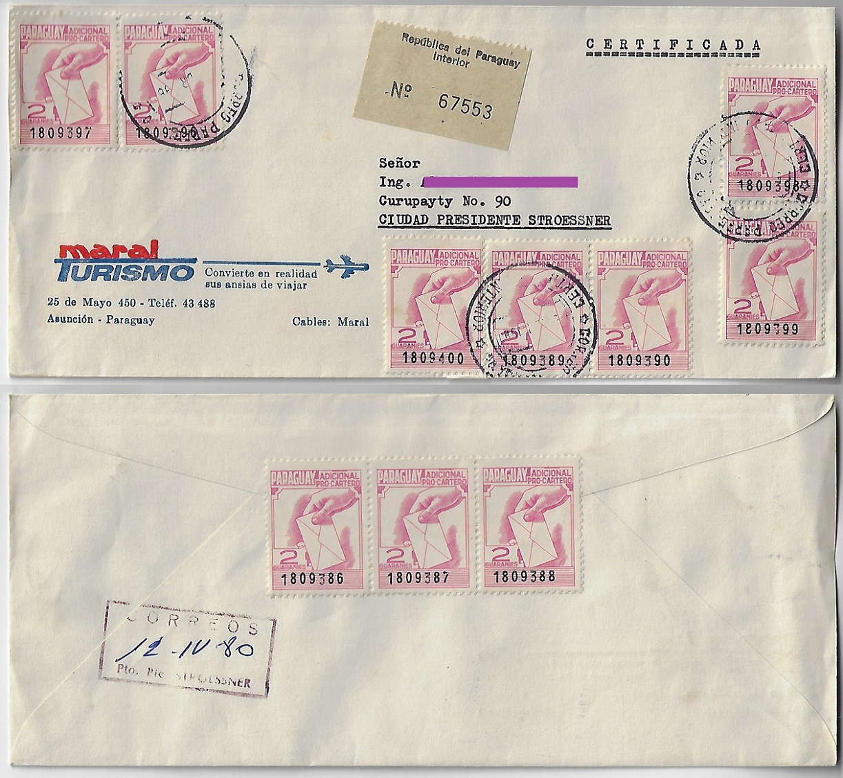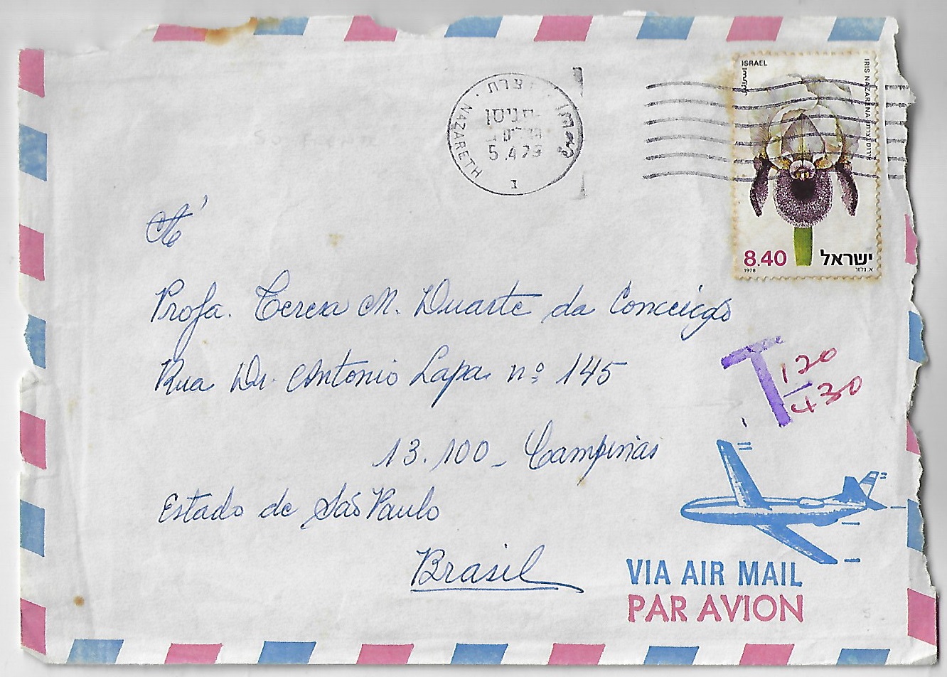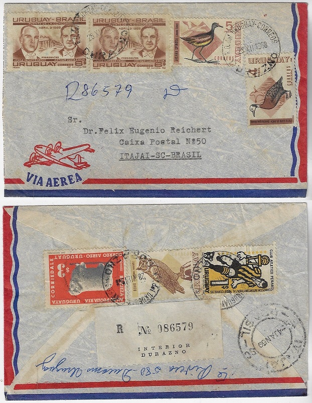 | 84330 | Uruguai, 1968 envelope aéreo com etiqueta de registrado no verso, remetido de Durazno (28/12) para Itajaí / SC (4/1/1969), porteado com 7 selos, Durazno = pêssego em espanhol | 20,00 | Foto |