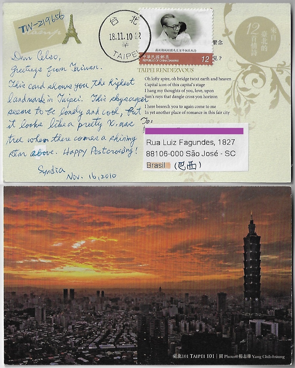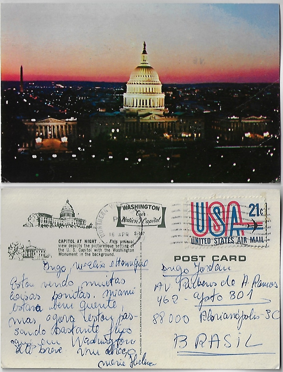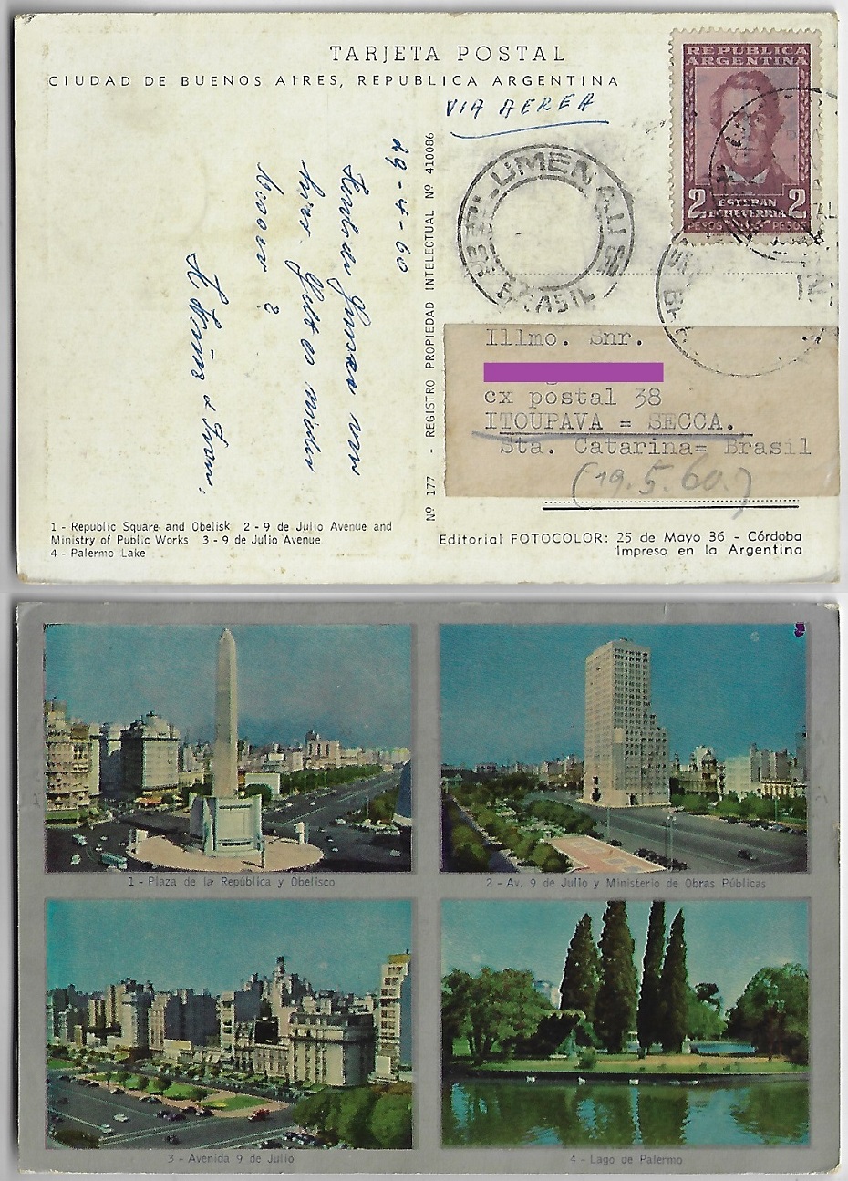 | 68910 | Argentina, 1960, cartão postal com fotos de Buenos Aires enviado para Blumenau, porteado com selo escritor Esteban Echeverría | 10,00 | Foto |