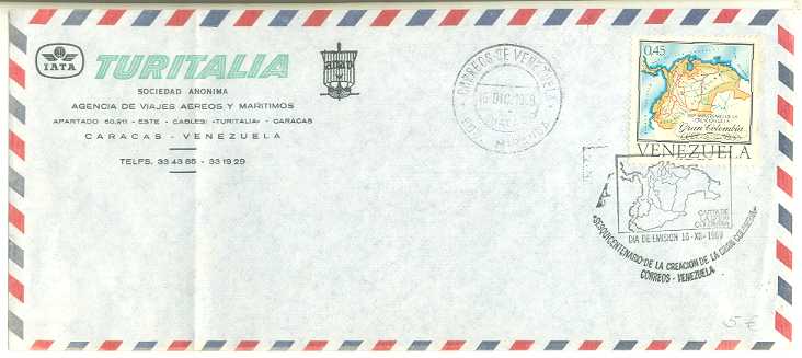 | 52931 | Venezuela, 1969, envelope com selo e carimbo alusivos a 150 Anos da Criação da Gran Colômbia | 3,00 | Foto |