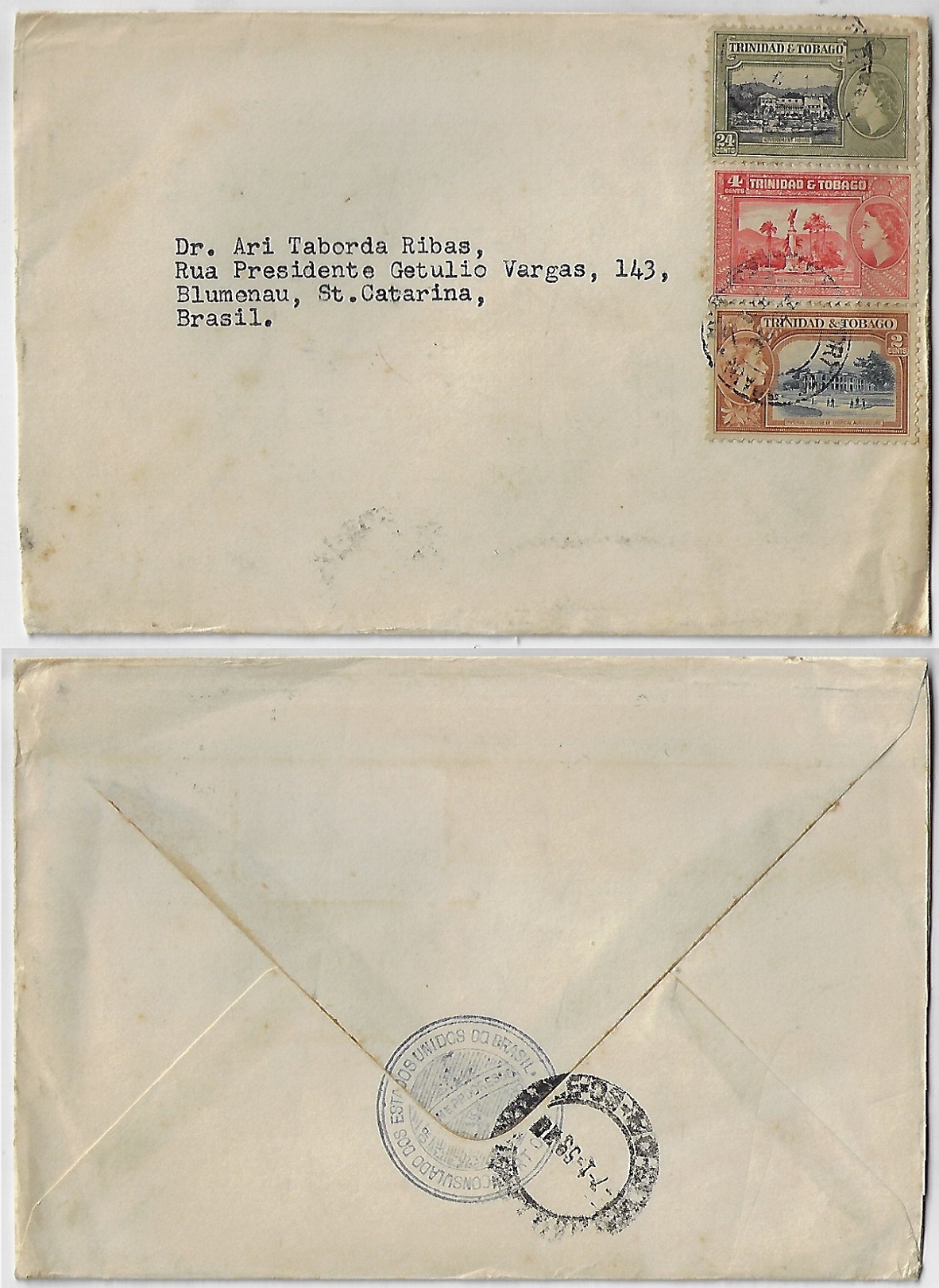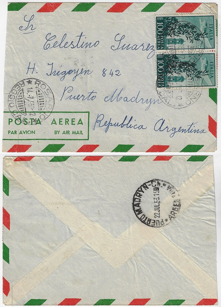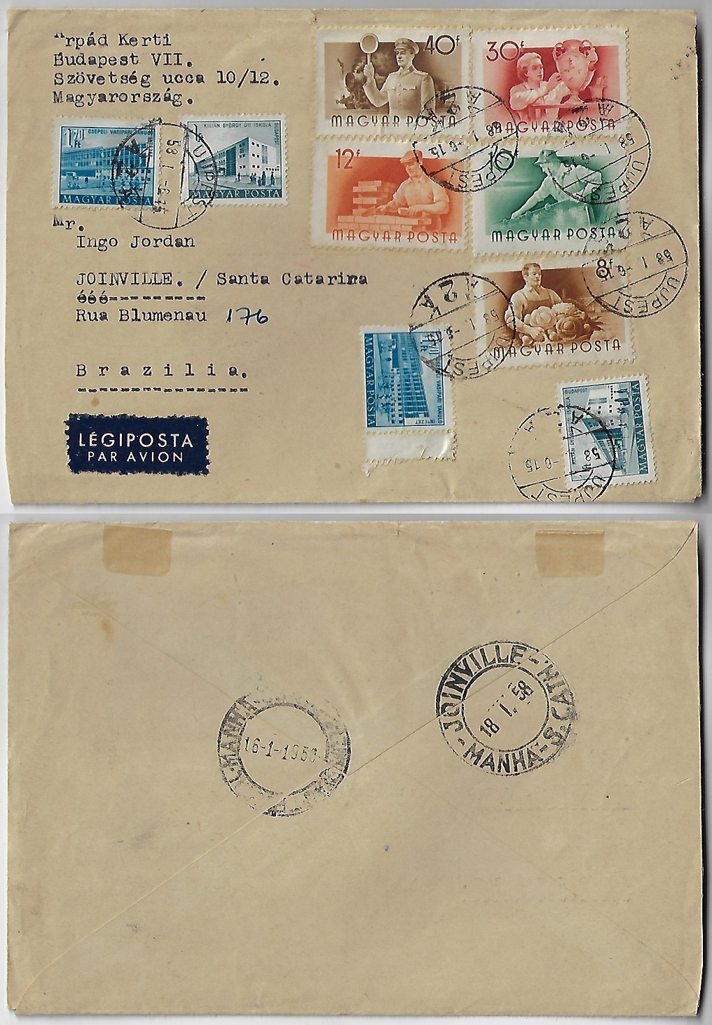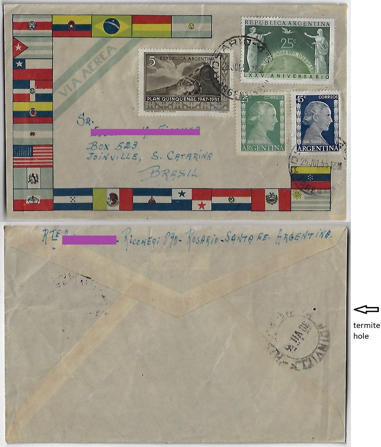 | 78770 | Argentina, 1955, envelope aéreo enviado de Rosário (25/7) para Joinville (30/7), porteado com 4 selos, Plano Quinquenal, União Postal Universal, Eva Peron, furo de cupim não atingindo os selos | 10,00 | Foto |