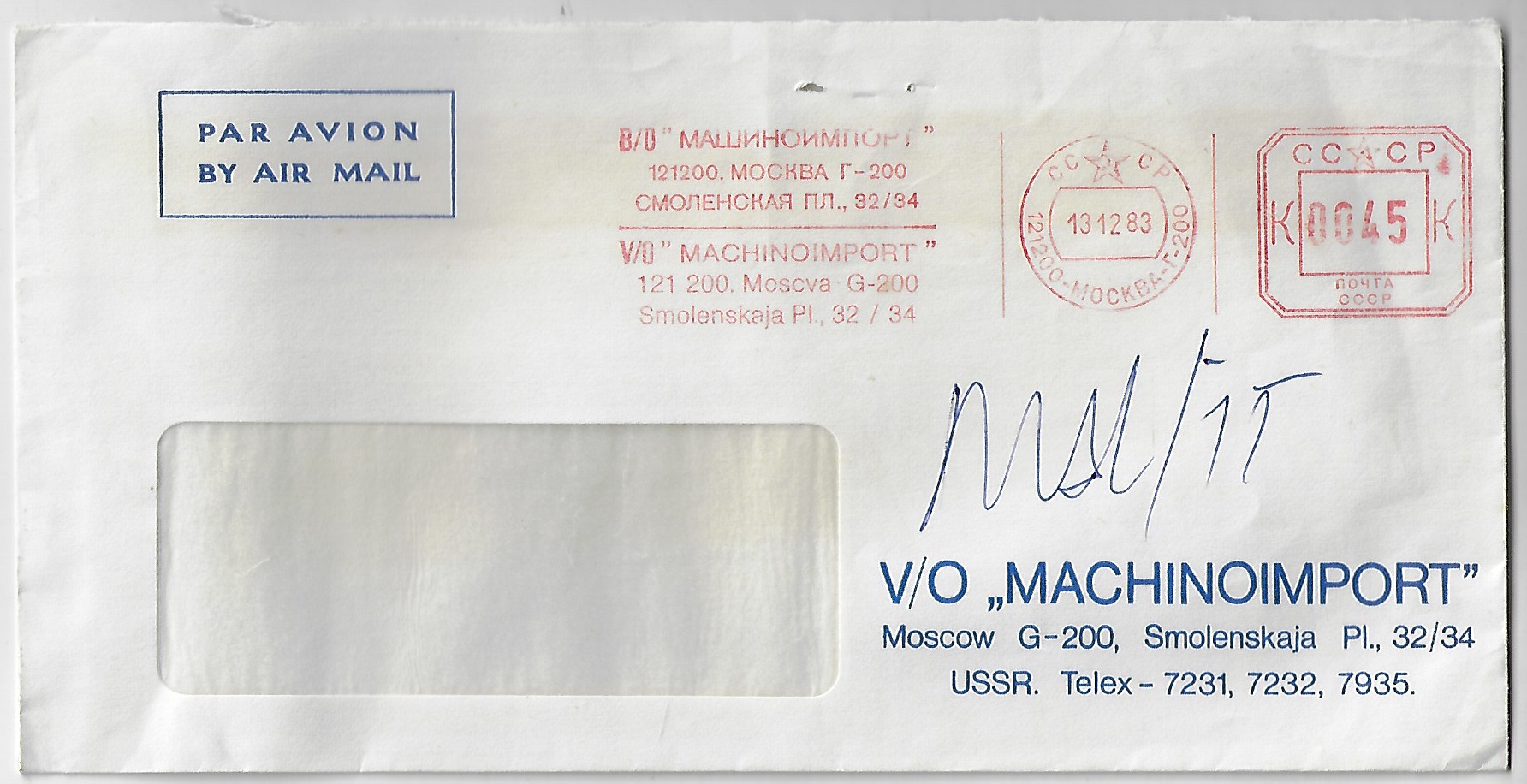 | 56570 | URSS, 1983, envelope aéreo de Moscou (13/12) porteado com franquia mecânica Frama com slogan Machinoimport, empresa estatal de importação de máquinas | 10,00 | Foto |