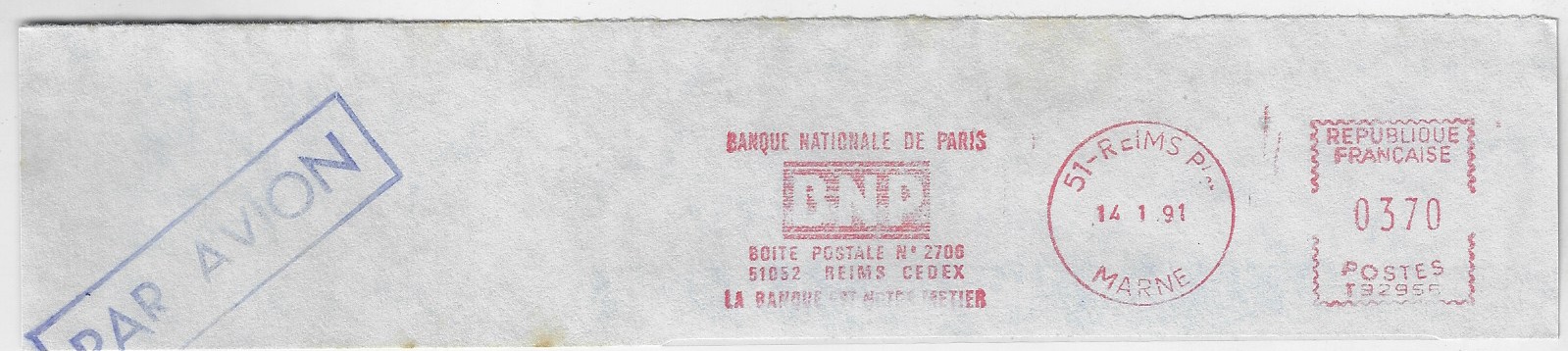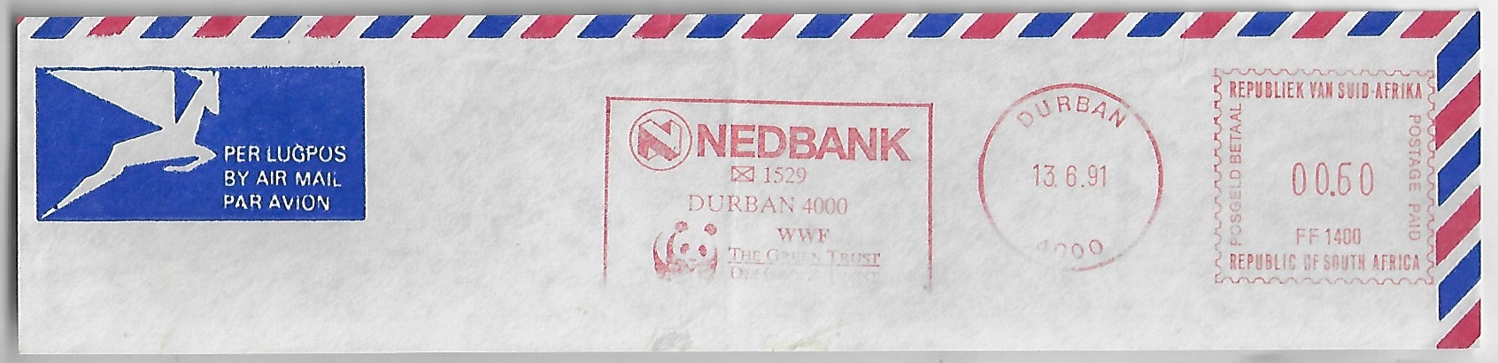 | 57153 | África do Sul, 1991, fragmento de envelope aéreo porteado com franquia mecânica Francotyp-Postalia com slogan "Nedbank", de Durban | 10,00 | Foto |
