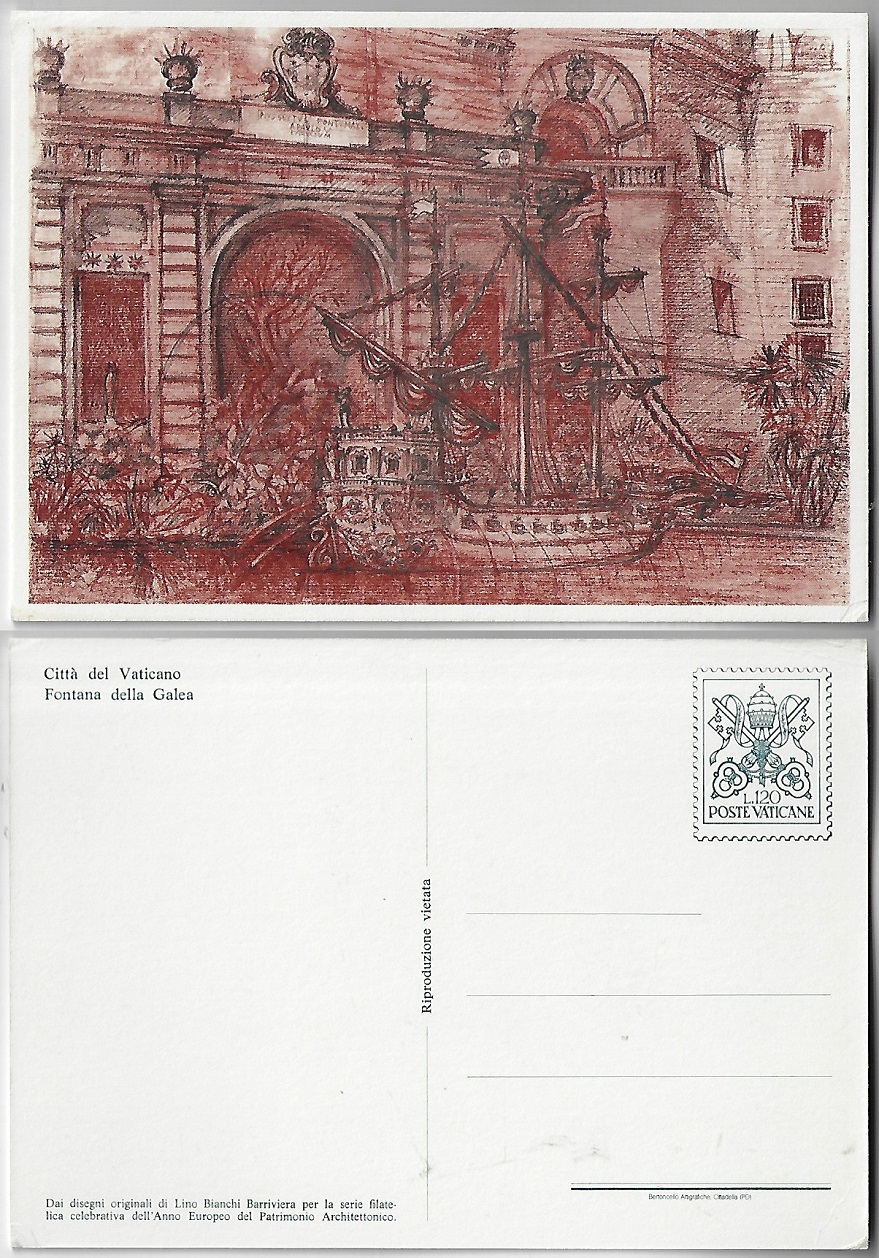 | 58487 | Vaticano, 1975, inteiro postal tipo bilhete selo Brasão 130 Liras com gravura Fonte do Galeão, da série Ano Europeu do Patrimônio Arquitetônico, sem uso | 10,00 | Foto |