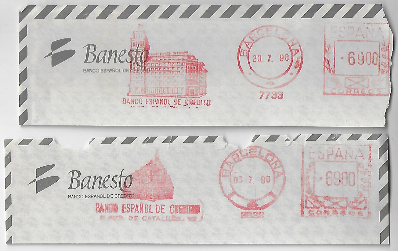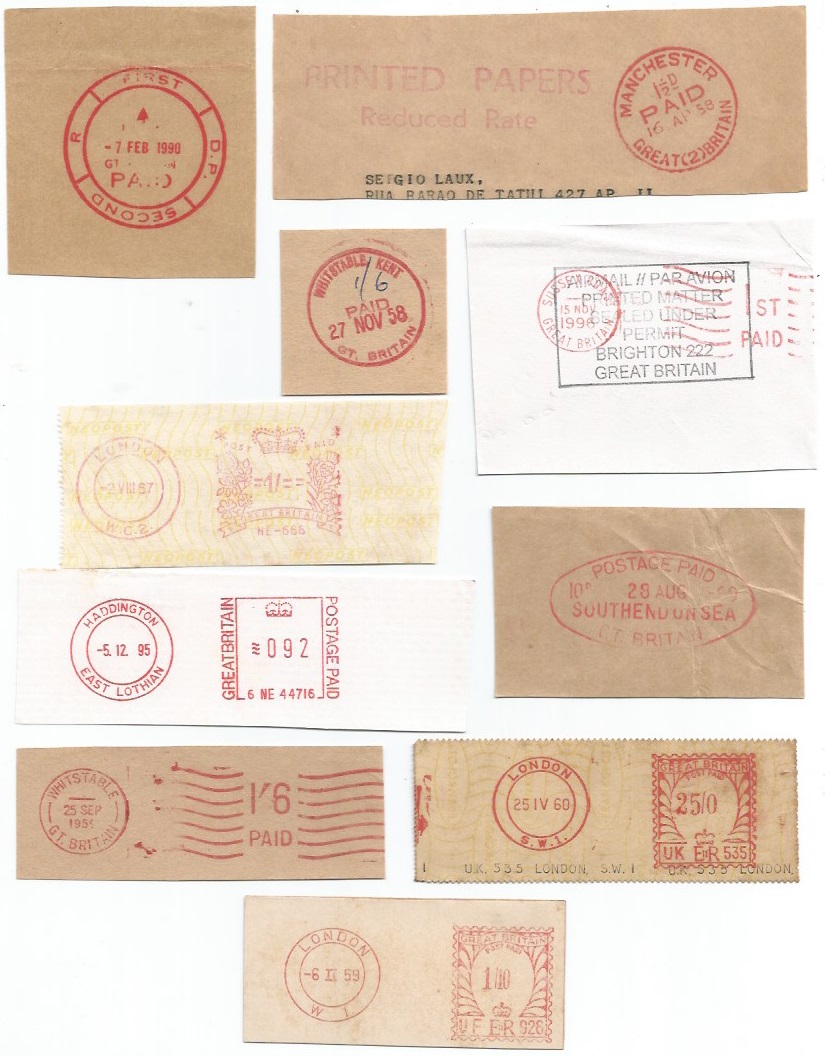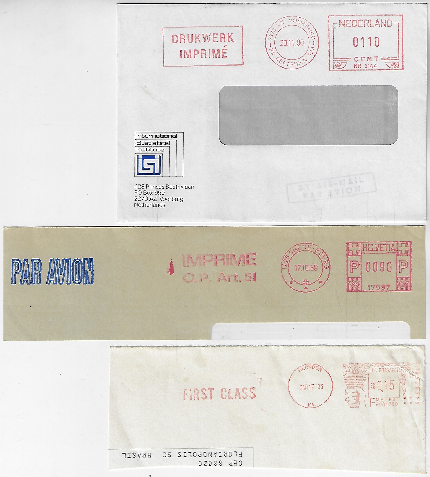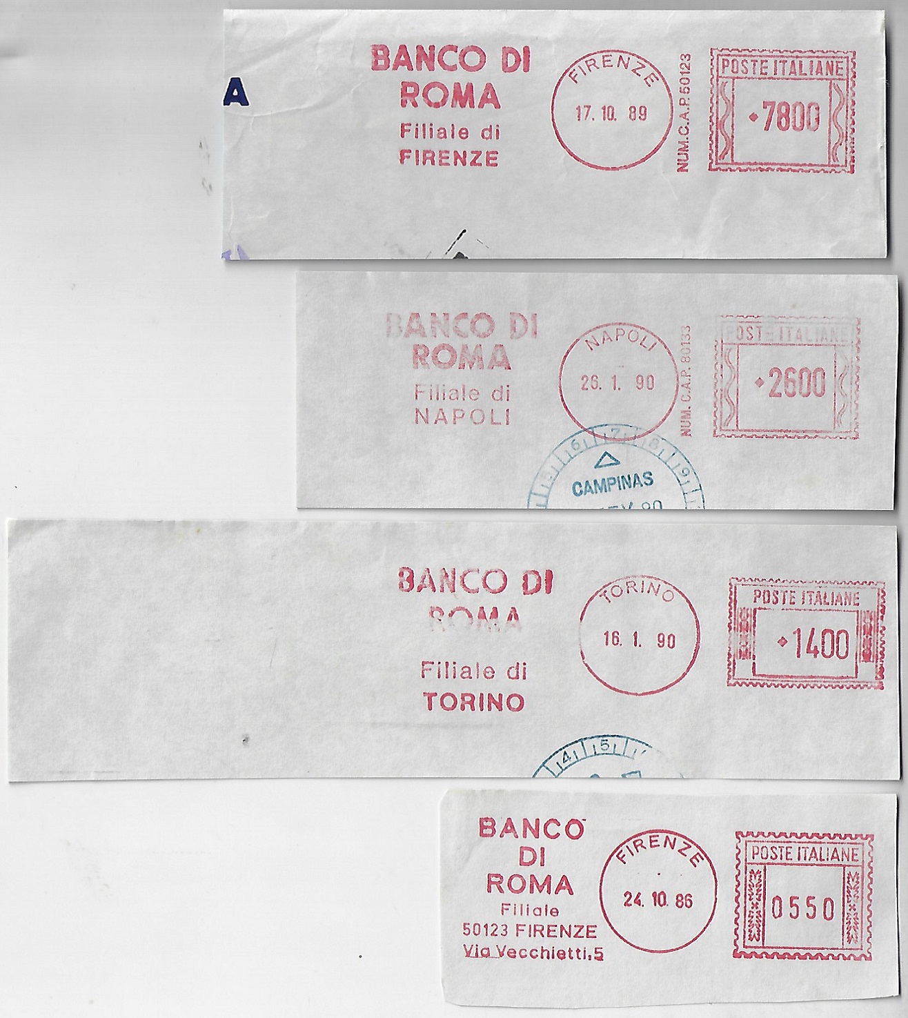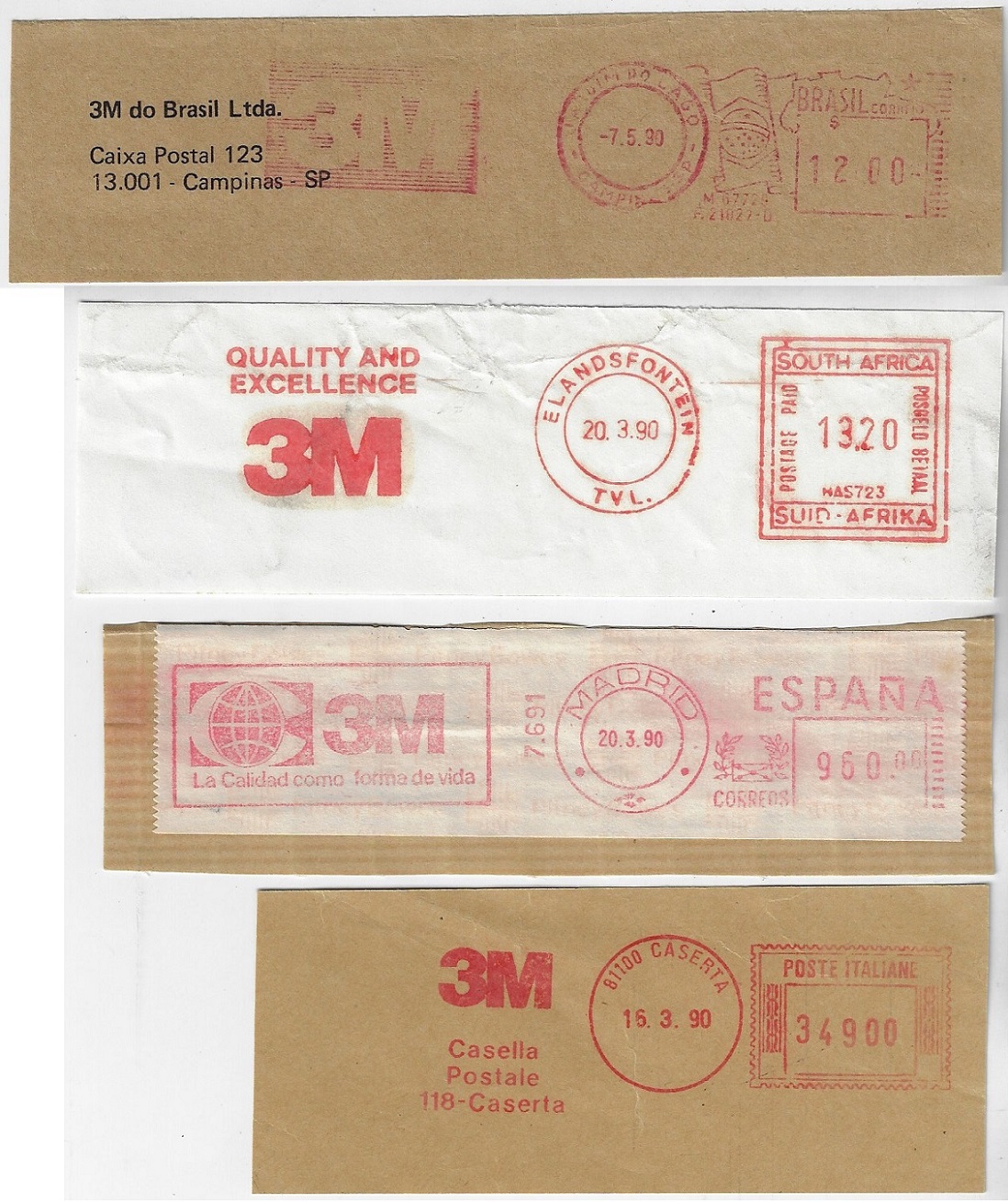 | 66486 | África do Sul, Espanha, Itália e Brasil, 1990, 4 fragmentos de envelopes porteado com franquias mecânicas alusivas a 3M | 20,00 | Foto |