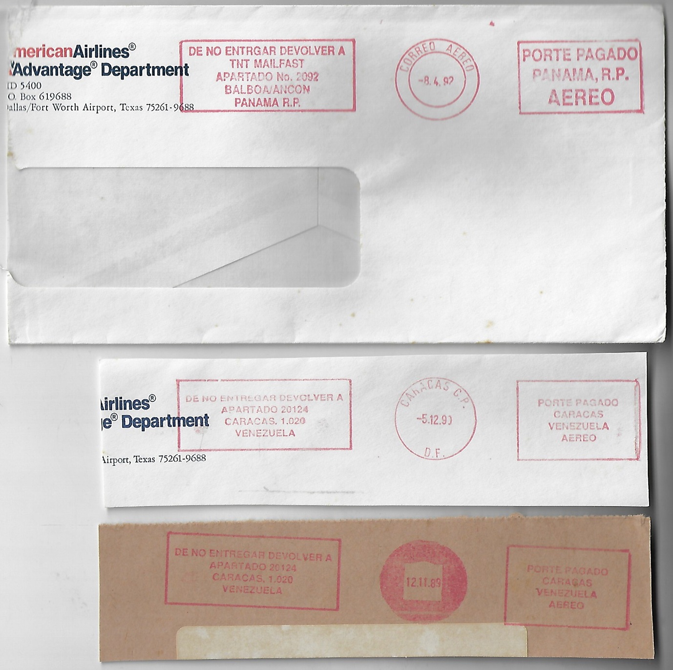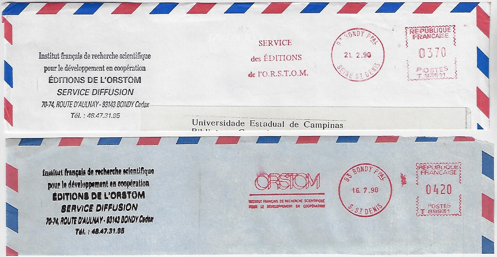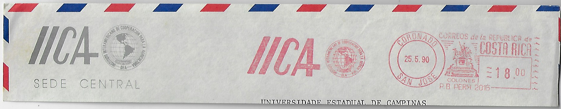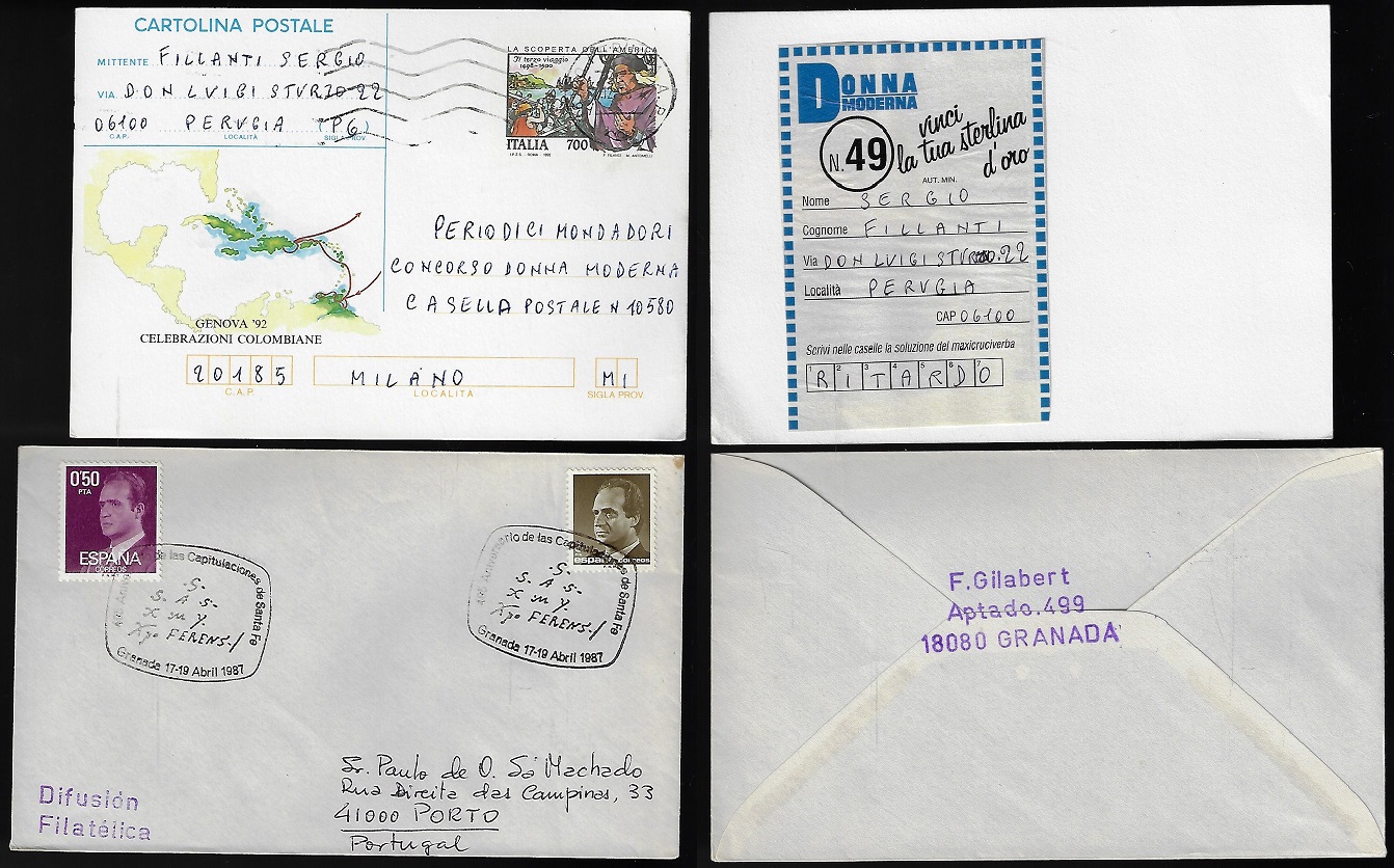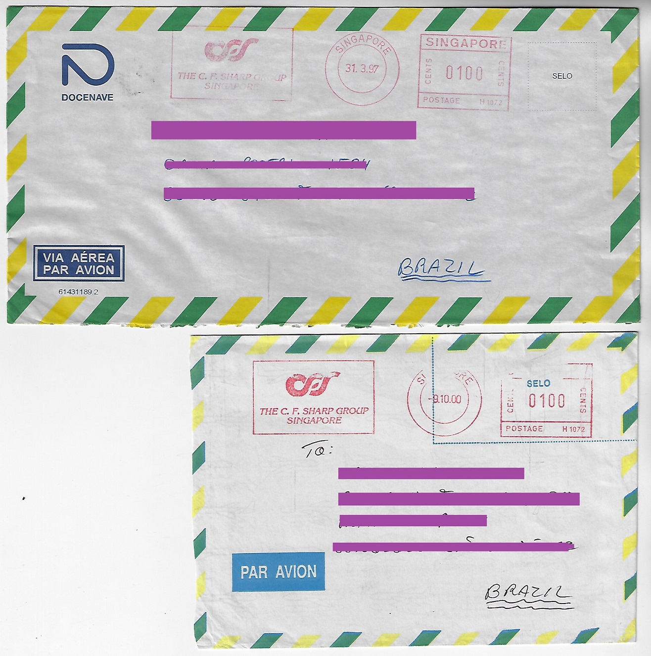 | 66486 | África do Sul, Espanha, Itália e Brasil, 1990, 4 fragmentos de envelopes porteado com franquias mecânicas alusivas a 3M | 20,00 | Foto |