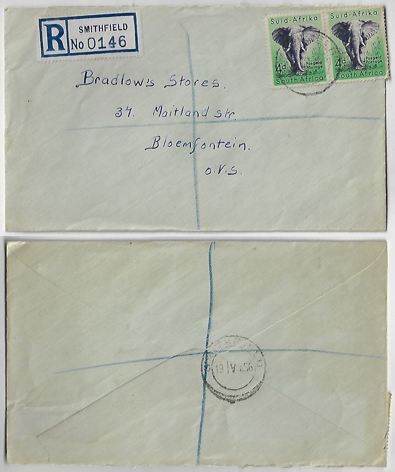 | 60445 | África do Sul, 1956, envelope com etiqueta de registro enviado de Smithfield para Bloemfontein, porteado com 2 selos Elefante 4d | 10,00 | Foto |
