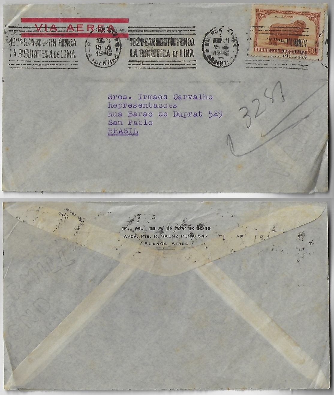 | 61299 | Argentina, 1946, envelope comercial de F. S. Radavero enviado de Buenos Aires (11/4) para São Paulo, reendereçado para Caixa Postal, porteado com selo Ovelha, carimbo mecânico rotativo com slogan "1821 San Martin funda a Biblioteca de Lima", no Peru | 10,00 | Foto |