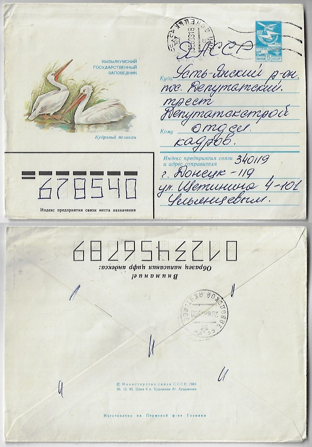 | 61360 | URSS, 1983, inteiro postal tipo envelope circulado, gravura de Aves Pelicano-crespo (Pelecanus crispus), na Reserva Estadual de Kyzyl Kum | 10,00 | Foto |