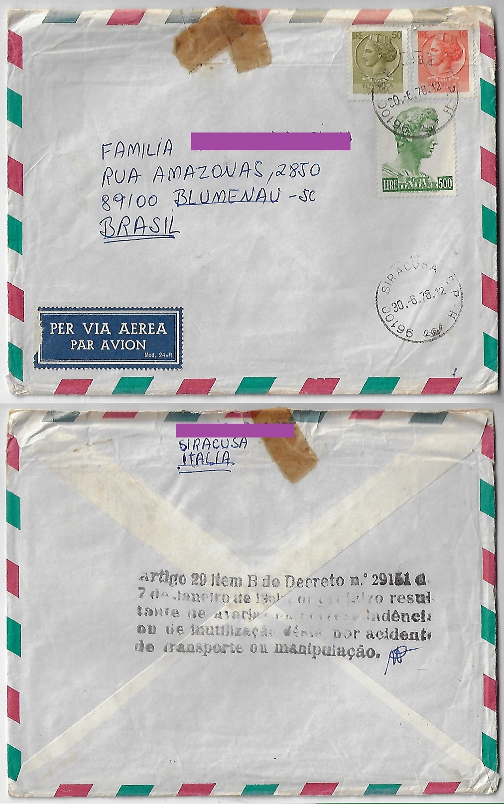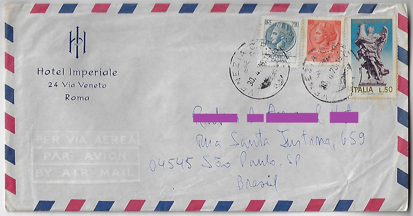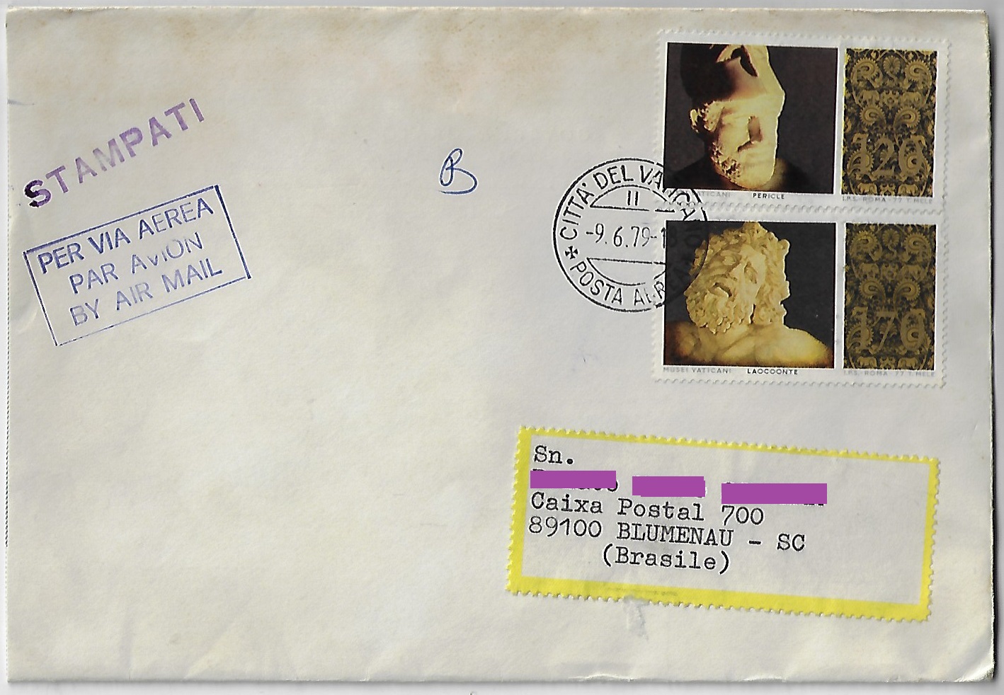 | 79076 | Vaticano, 1979, envelope aéreo enviado para Blumenau, porteado com 2 selos Série Esculturas: Péricles e Laocoonte | 10,00 | Foto |