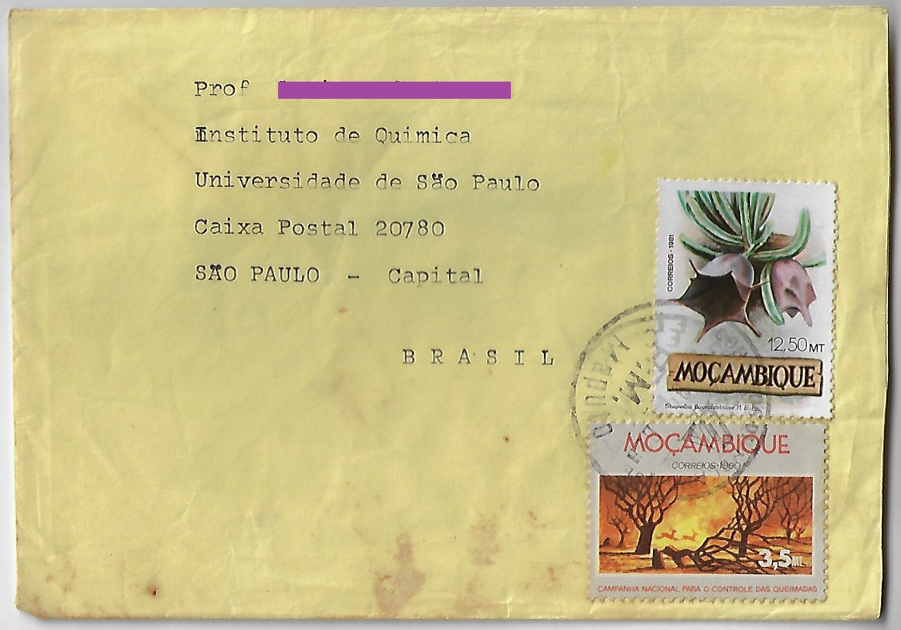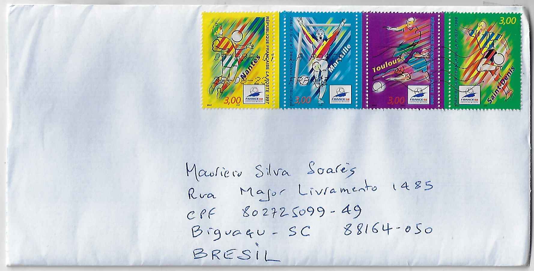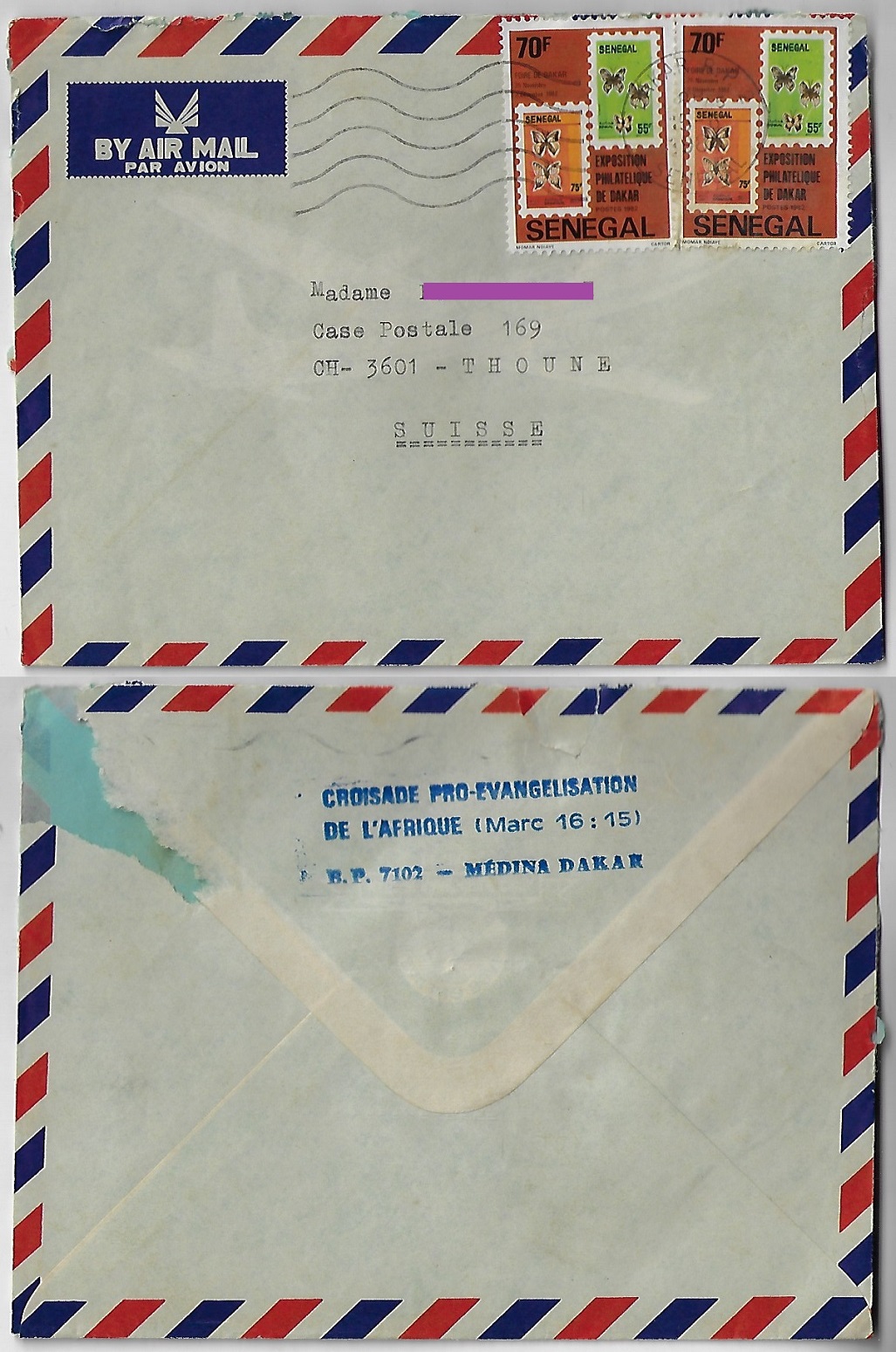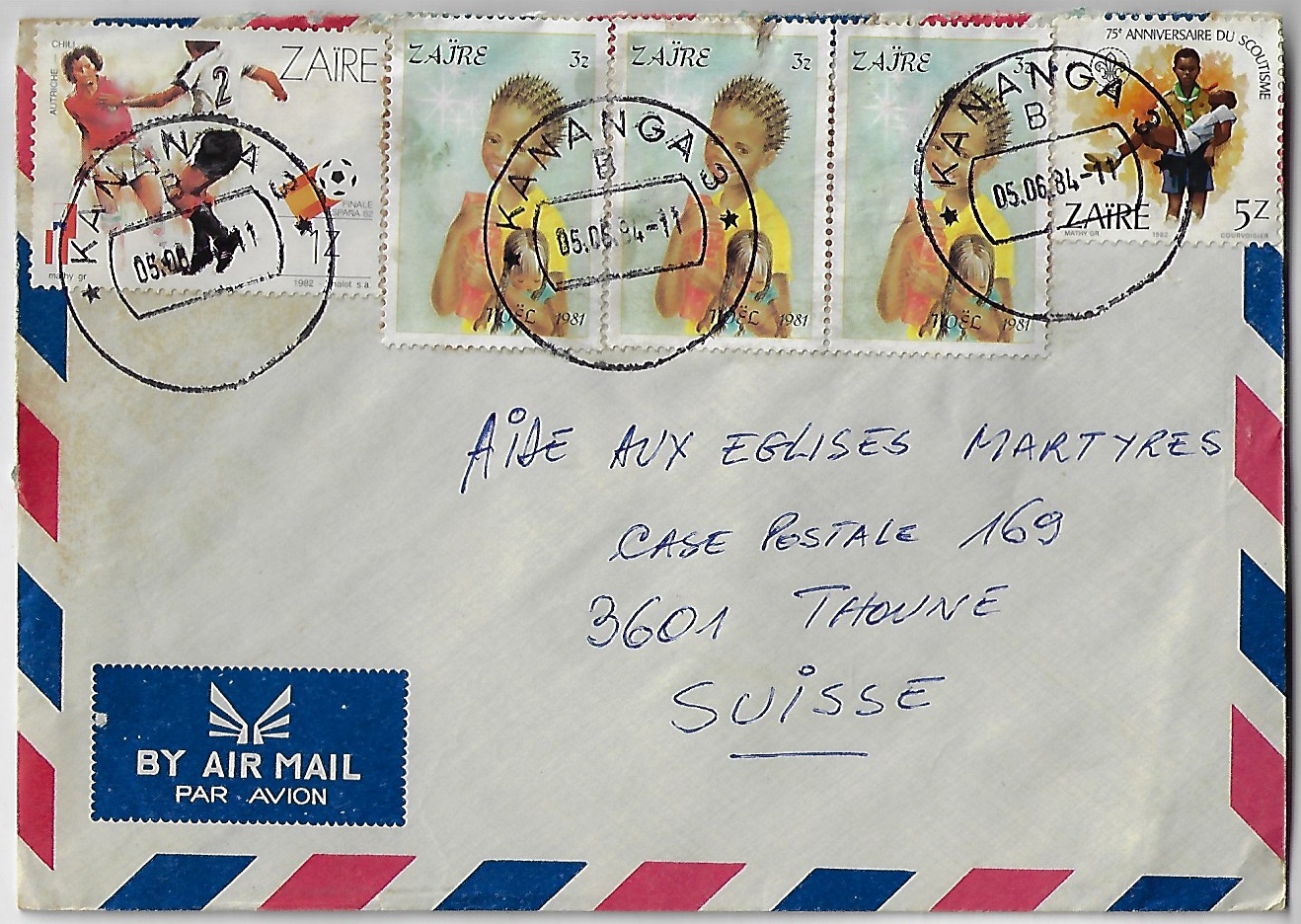 | 62032 | Zaire, 1984, envelope aéreo enviado de Kananga (5/6) para Thoune / Suíça, porteado com 5 selos Campeonato Mundial de Futebol, Natal e Escotismo | 10,00 | Foto |