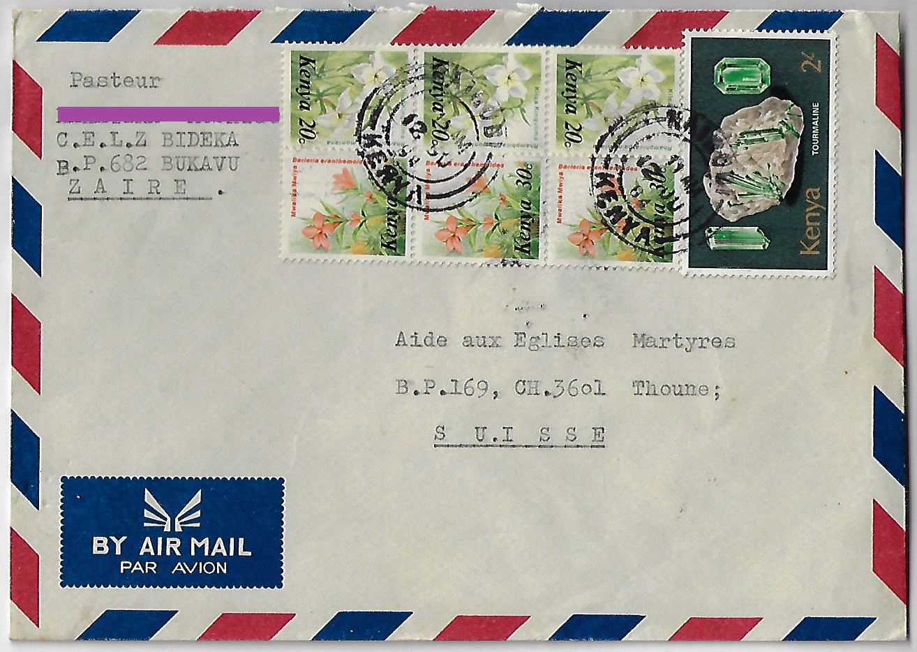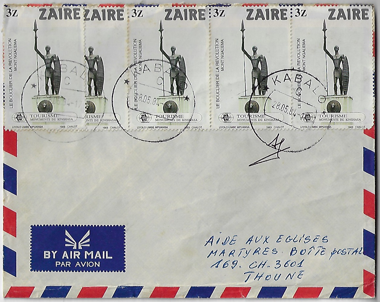 | 62033 | Zaire, 1984, envelope aéreo enviado de Kabalo (28/5) para Thoune / Suíça, porteado com 5 selos O escudo da revolução, no bairro Mont Ngaliema, em Kinshasa, escultura de Liyolo Limbe | 10,00 | Foto |