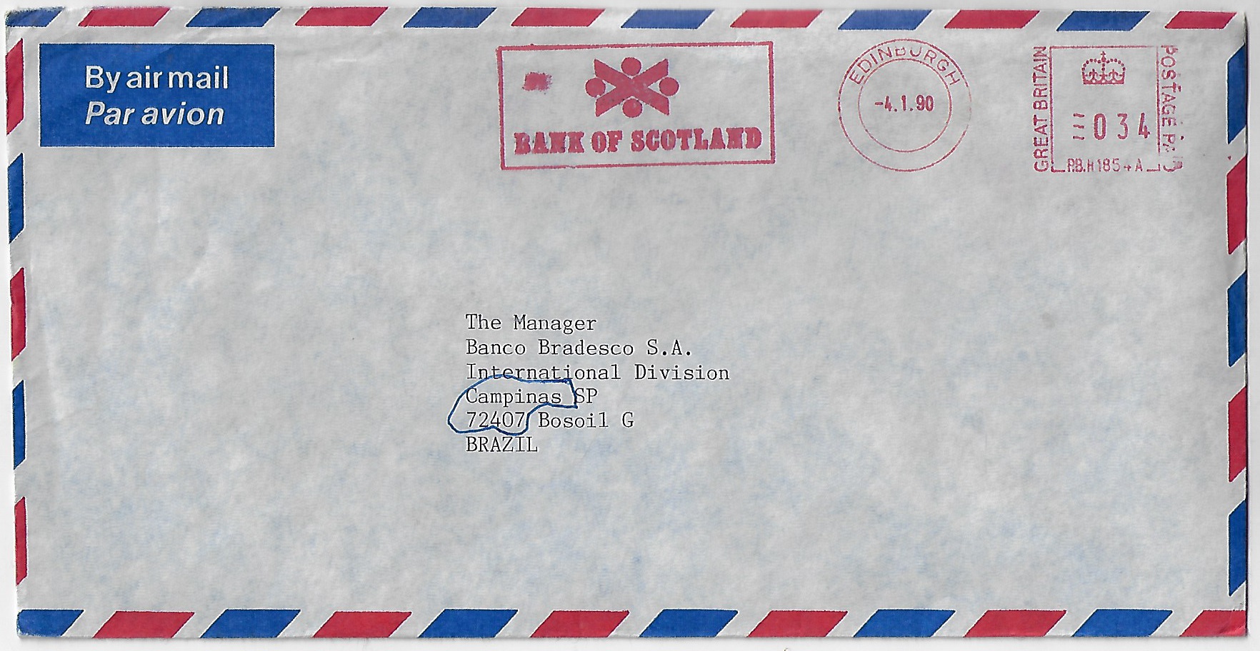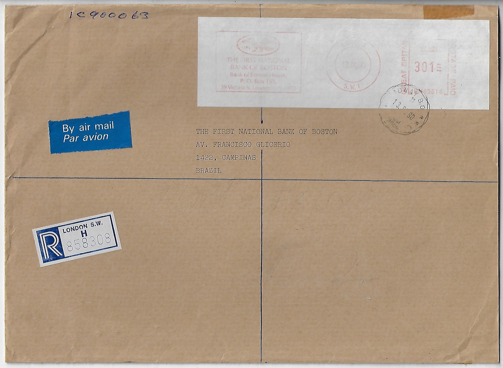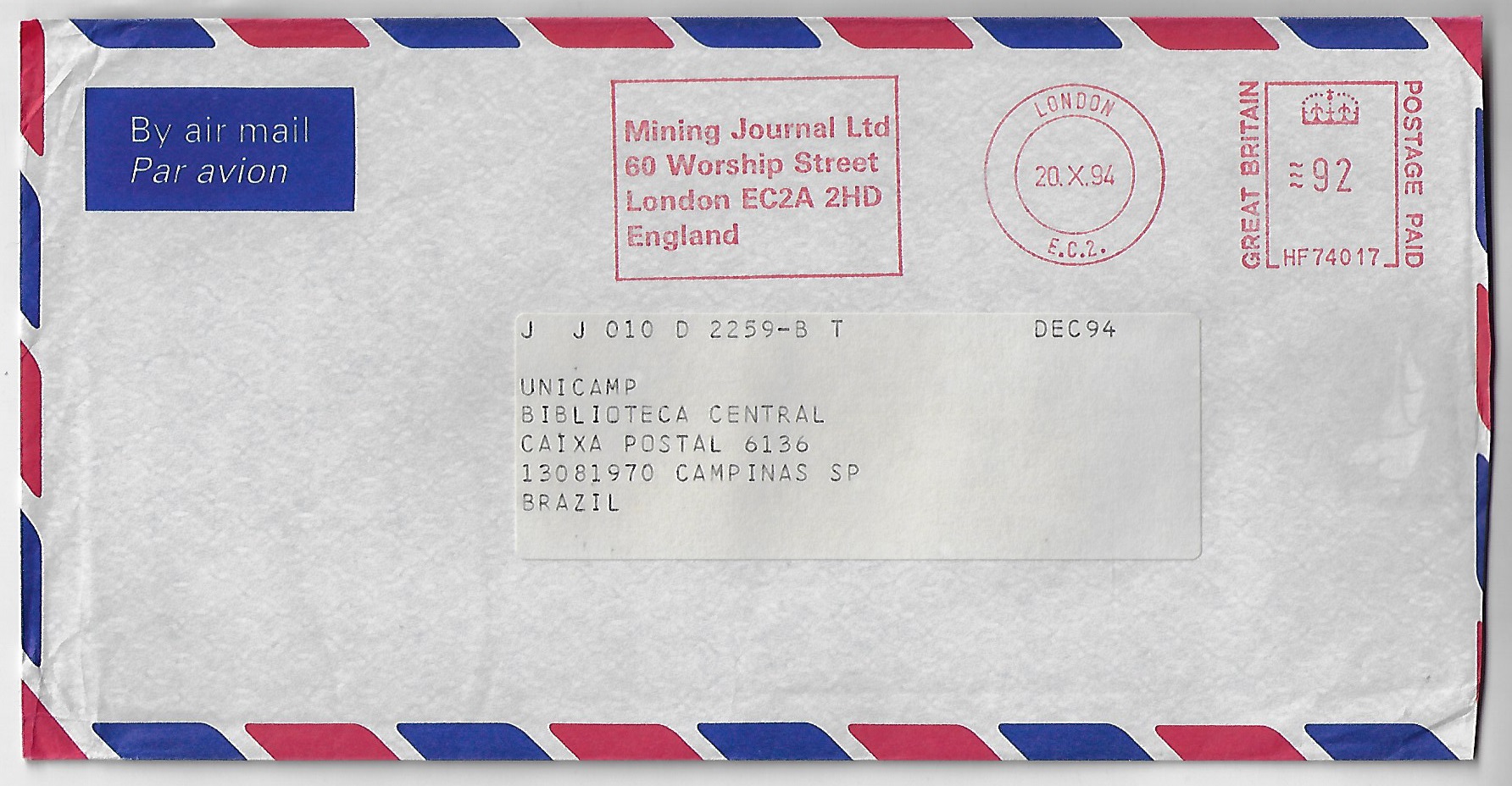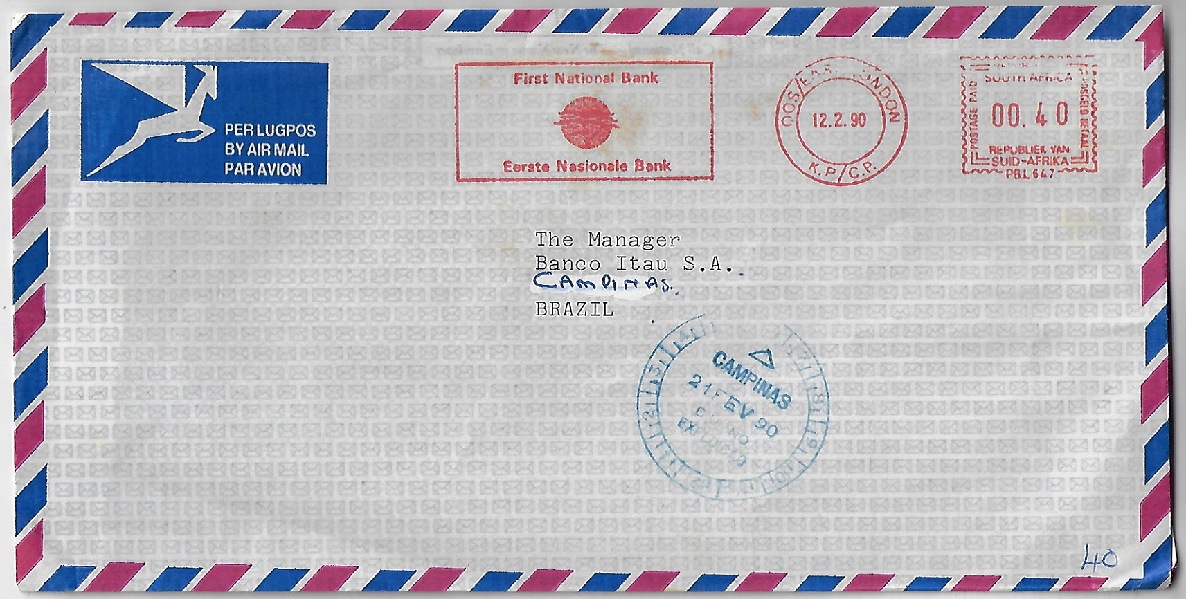 | 77755 | África do Sul, 1990, envelope aéreo enviado de East London (12/2) para Campinas, porteado com franquia mecânica Pitney Bowes-GB "6300" com slogan do First National Bank, logo Árvore Acácia e Sol | 10,00 | Foto |