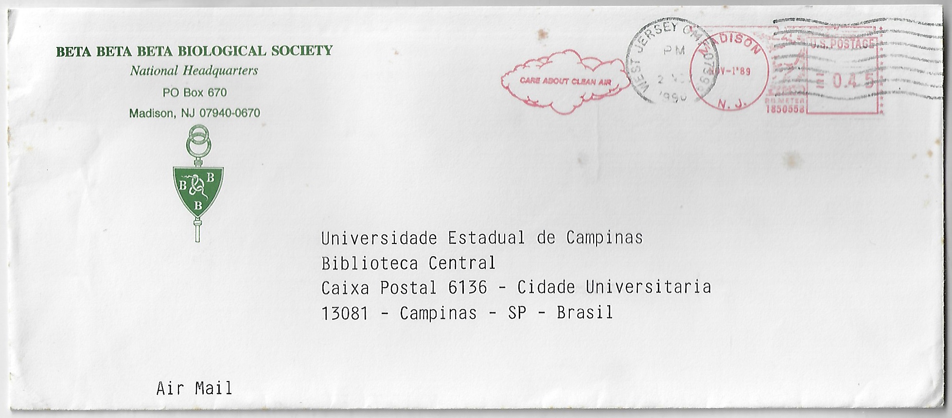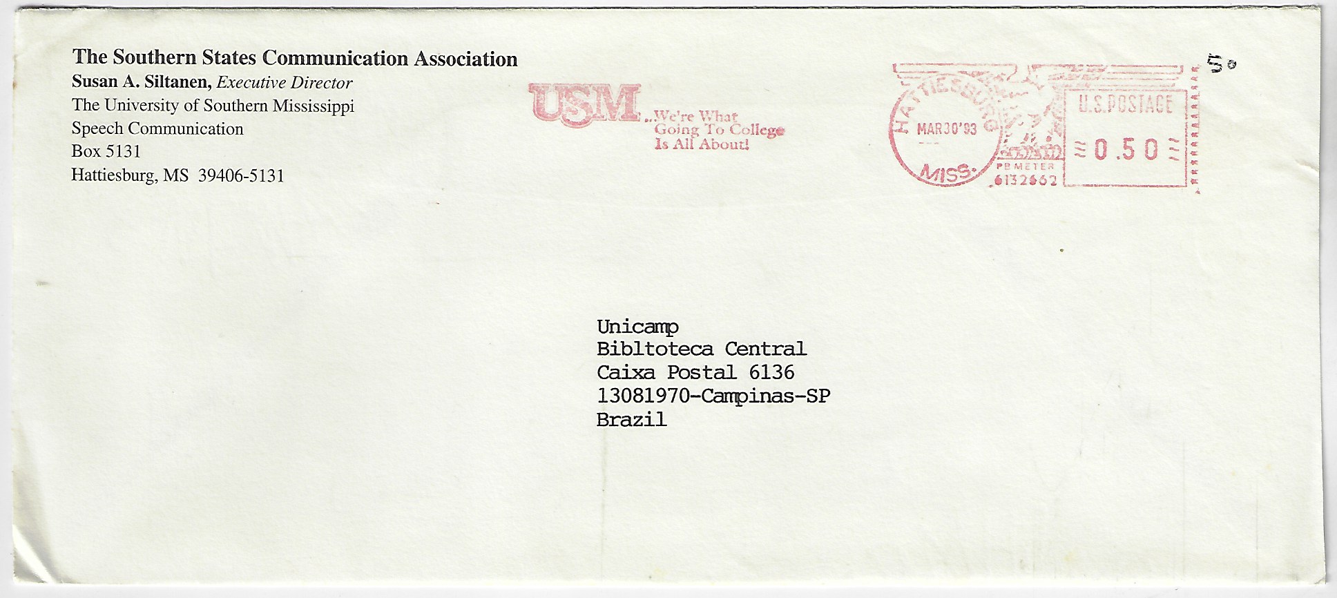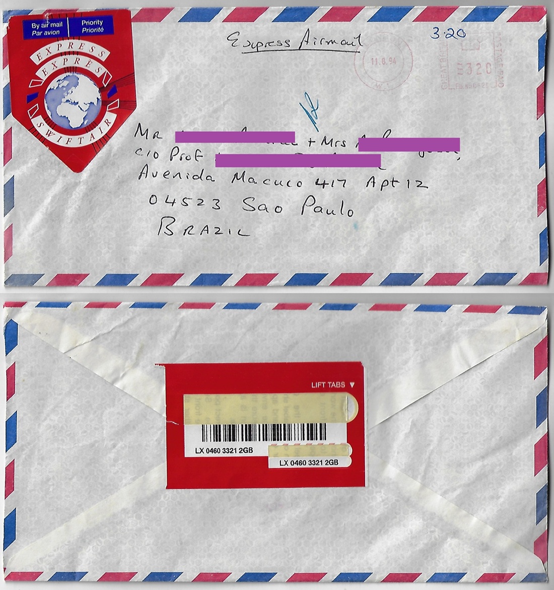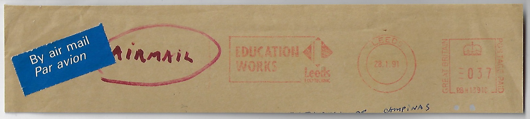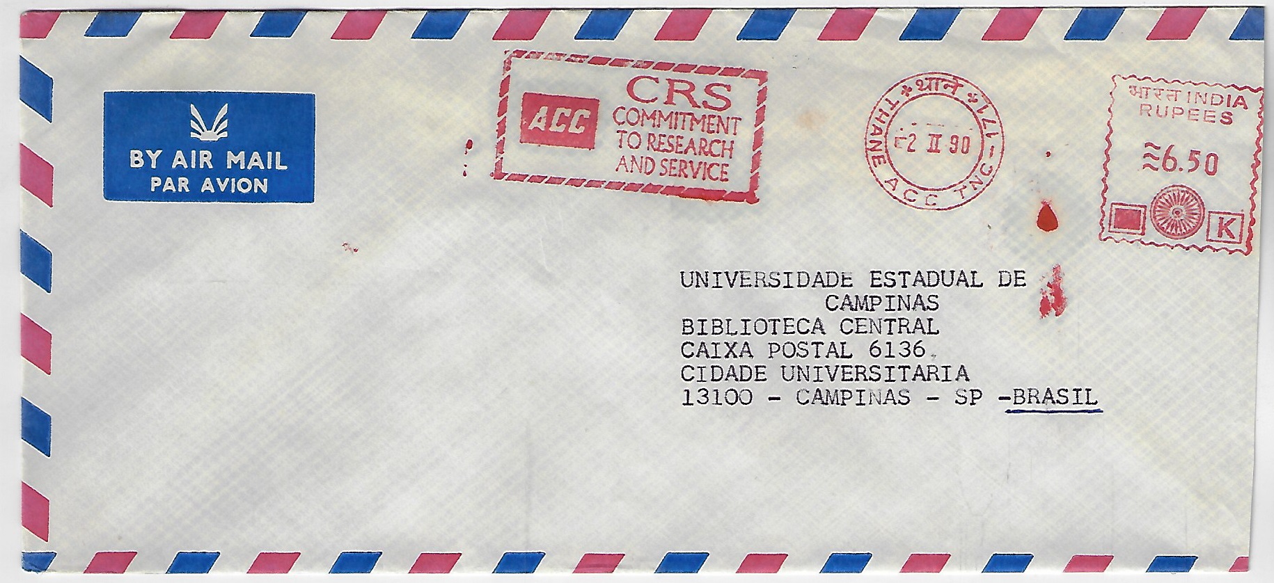 | 77755 | África do Sul, 1990, envelope aéreo enviado de East London (12/2) para Campinas, porteado com franquia mecânica Pitney Bowes-GB "6300" com slogan do First National Bank, logo Árvore Acácia e Sol | 10,00 | Foto |