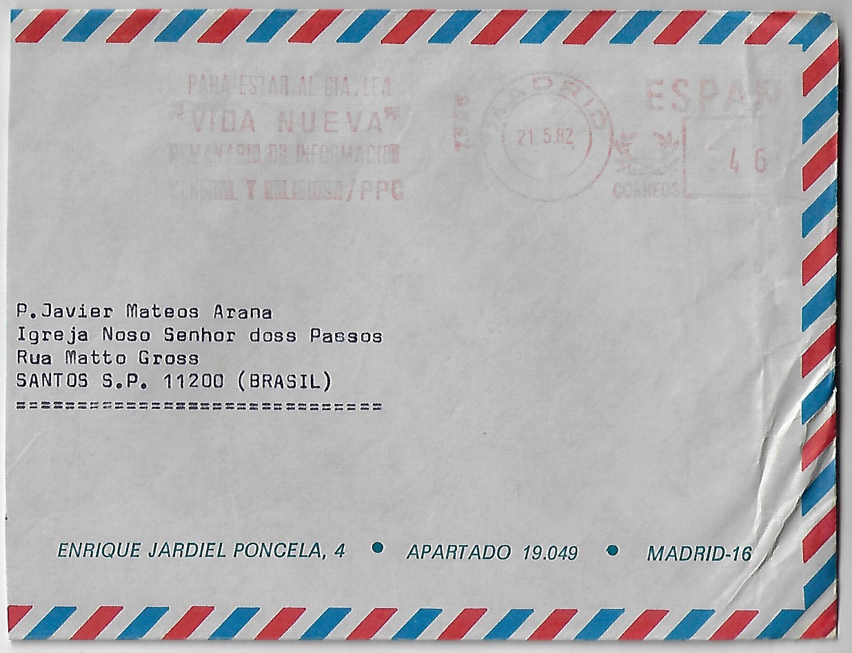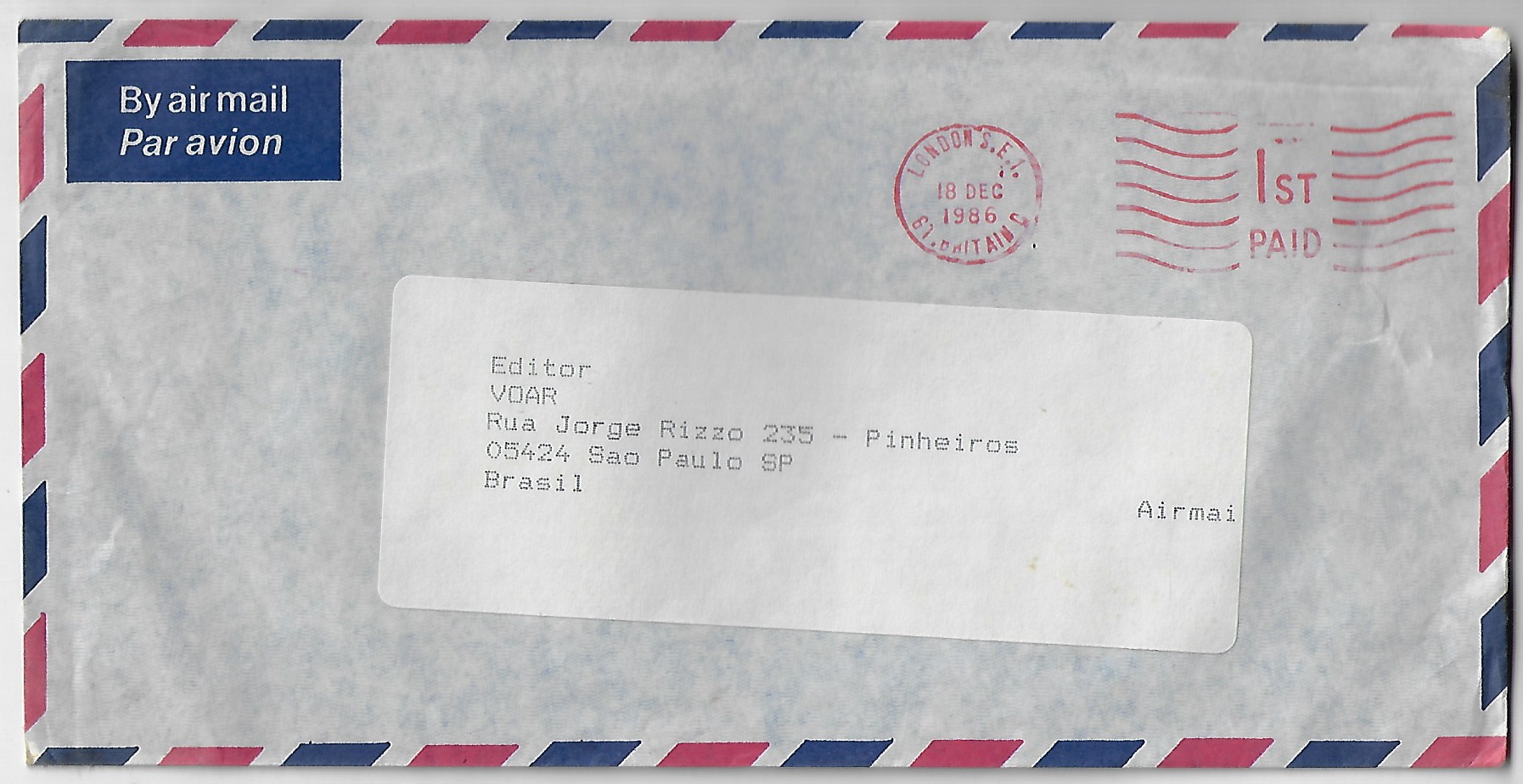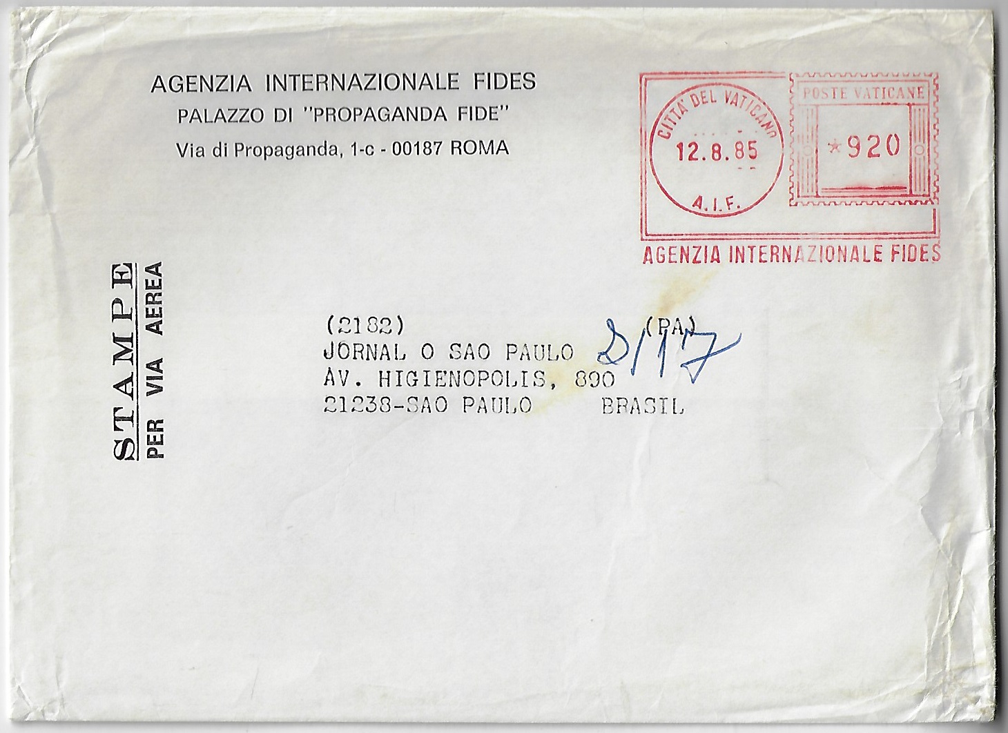 | 79309 | Vaticano, 1985, envelope aéreo enviado para São Paulo, porteado com franquia mecânica Lirma com slogan "Agência Internacional Fides", Fides significa Fé em Latim | 10,00 | Foto |