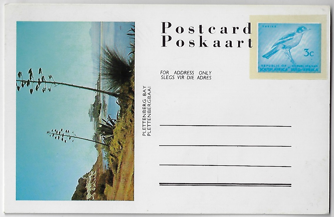 | 63981 | África do Sul, 1960s, Inteiro Postal tipo bilhete com vista da Plettenberg Bay, selo impresso Ave 3 Cents, sem uso | 10,00 | Foto |