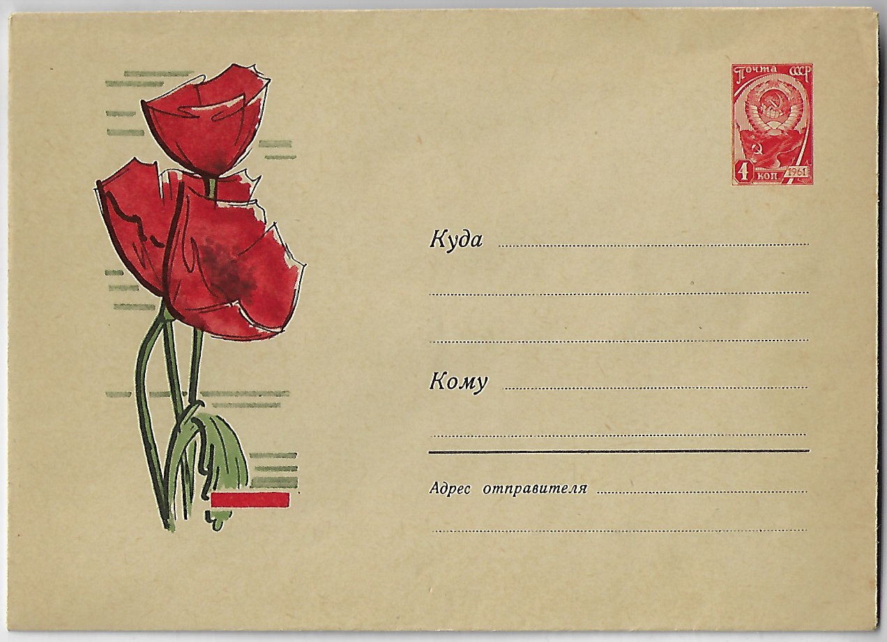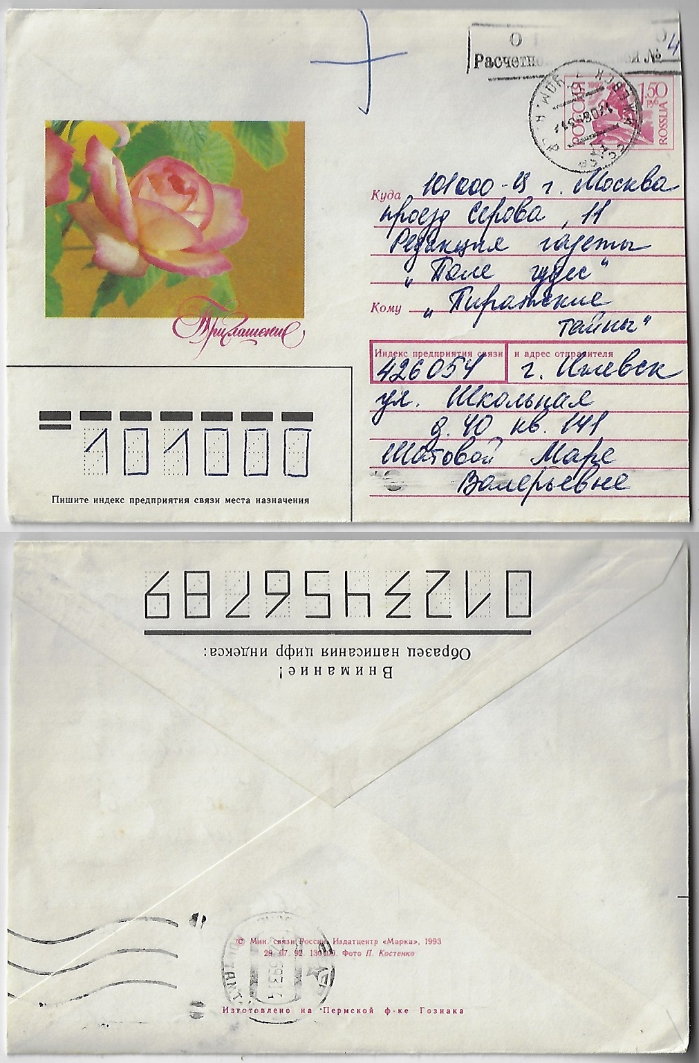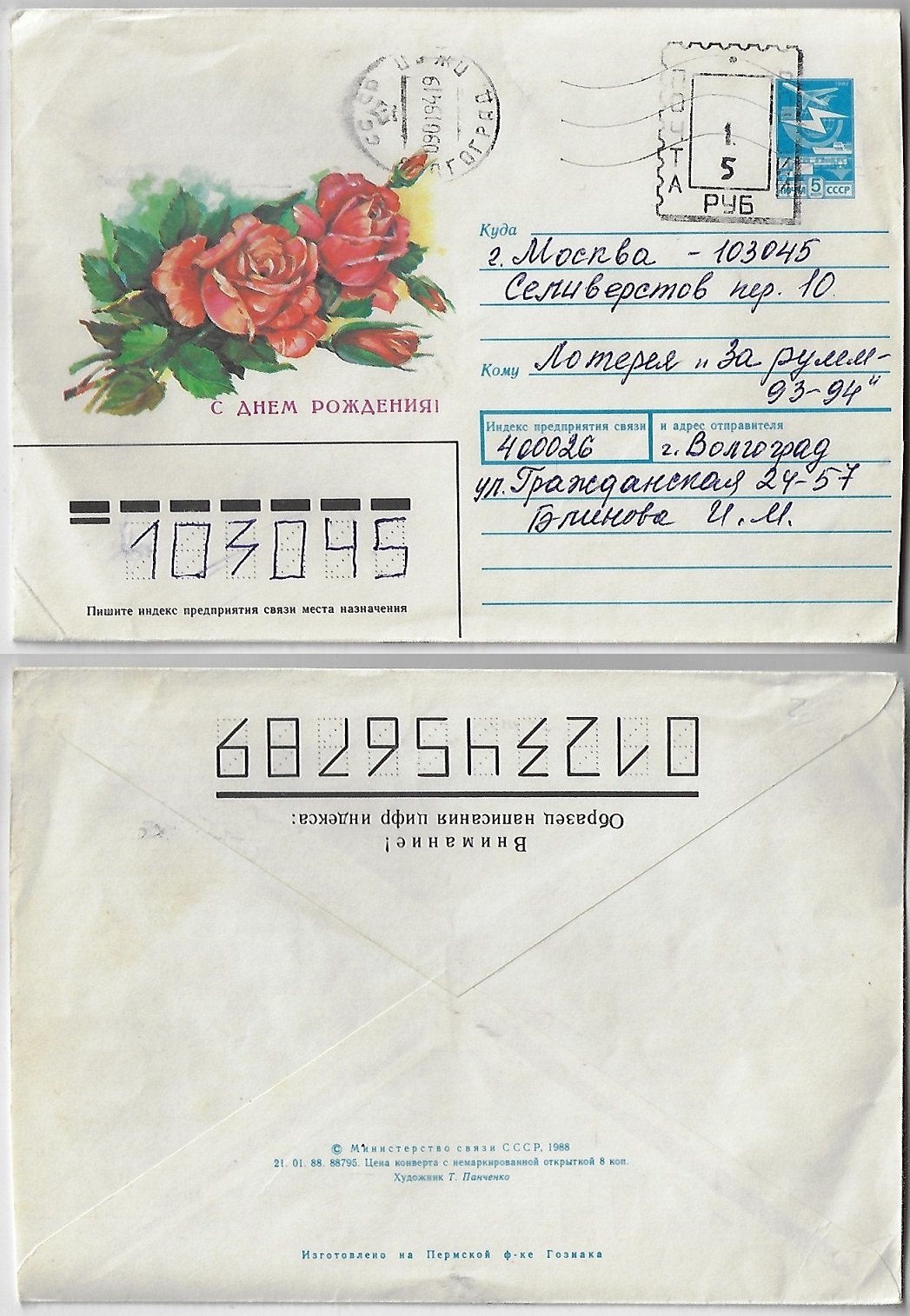 | 82868 | URSS, 1994 (modelo de 1988 com sobrestampa "Correio Russo 1.5 rublos), inteiro postal tipo envelope enviado de Volgogrado (9/1) para Moscou, gravura de Flores Rosas Vermelhas e legenda "Feliz Aniversário" | 10,00 | Foto |