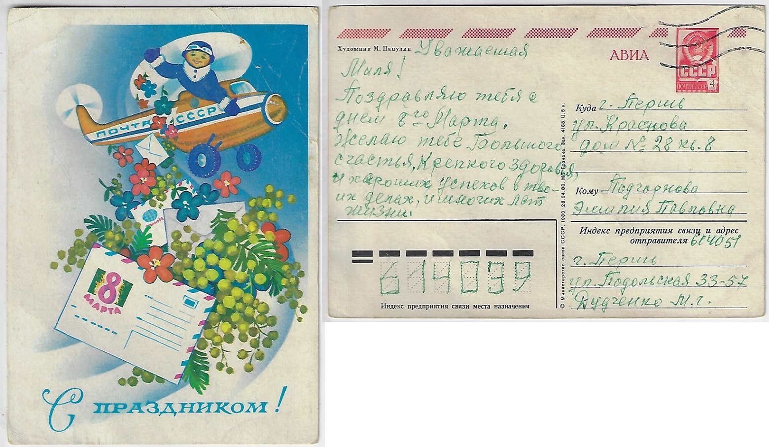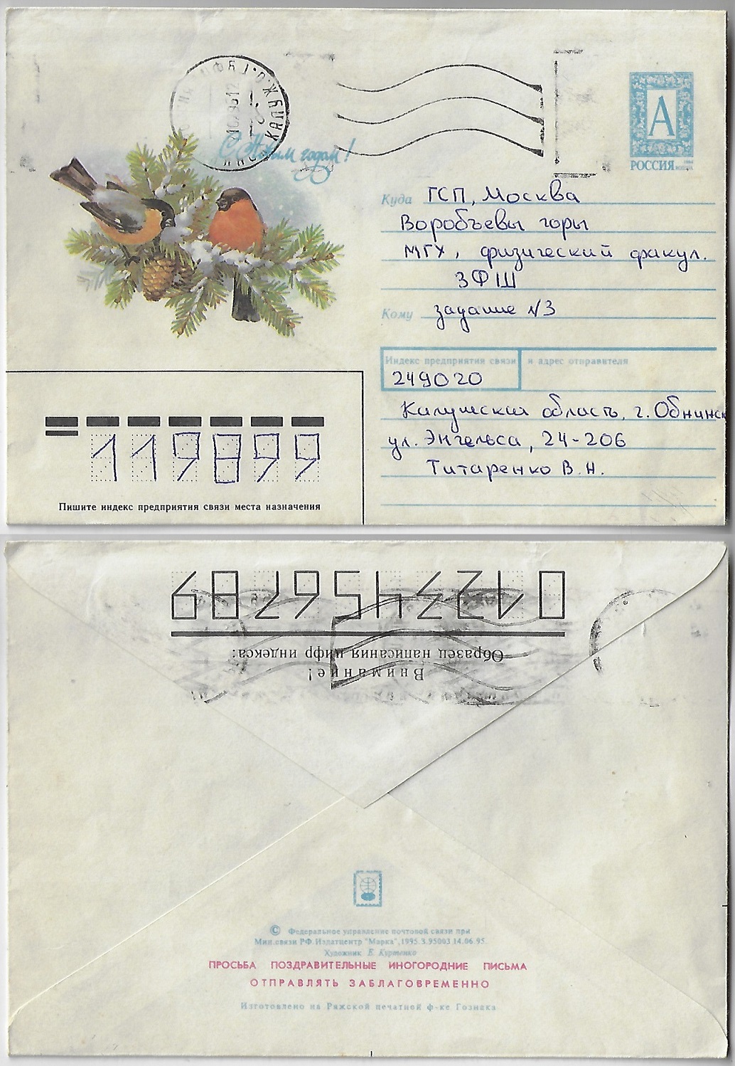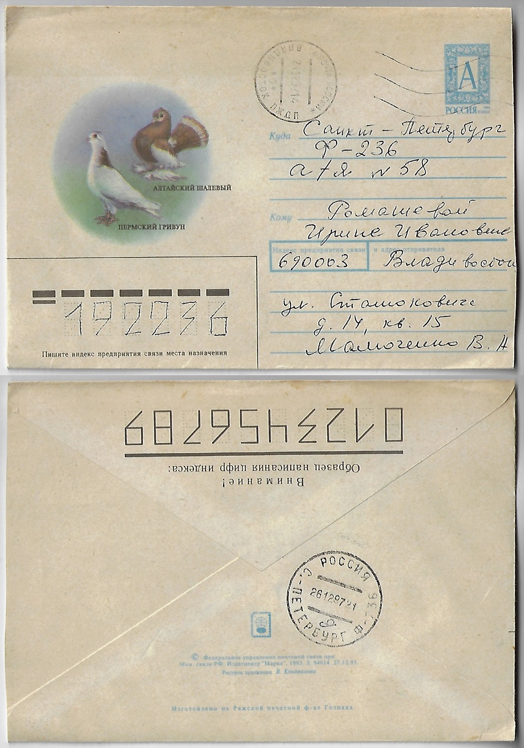 | 82868 | URSS, 1994 (modelo de 1988 com sobrestampa "Correio Russo 1.5 rublos), inteiro postal tipo envelope enviado de Volgogrado (9/1) para Moscou, gravura de Flores Rosas Vermelhas e legenda "Feliz Aniversário" | 10,00 | Foto |
