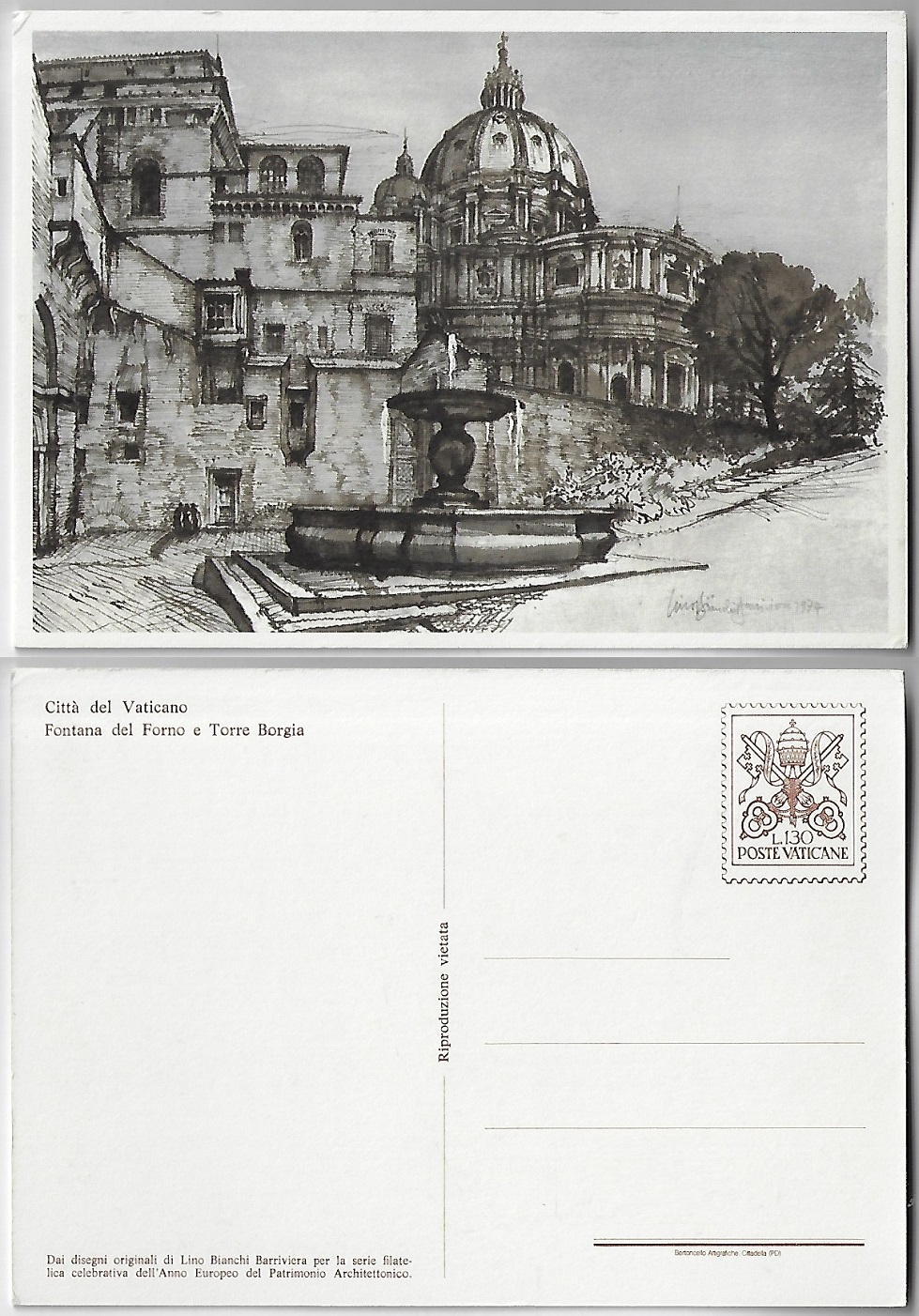 | 64650 | Vaticano, 1975, inteiro postal tipo bilhete selo Brasão 130 Liras com gravura Fonte de Forno e Torre Borgia, da série Ano Europeu do Patrimônio Arquitetônico, sem uso | 10,00 | Foto |