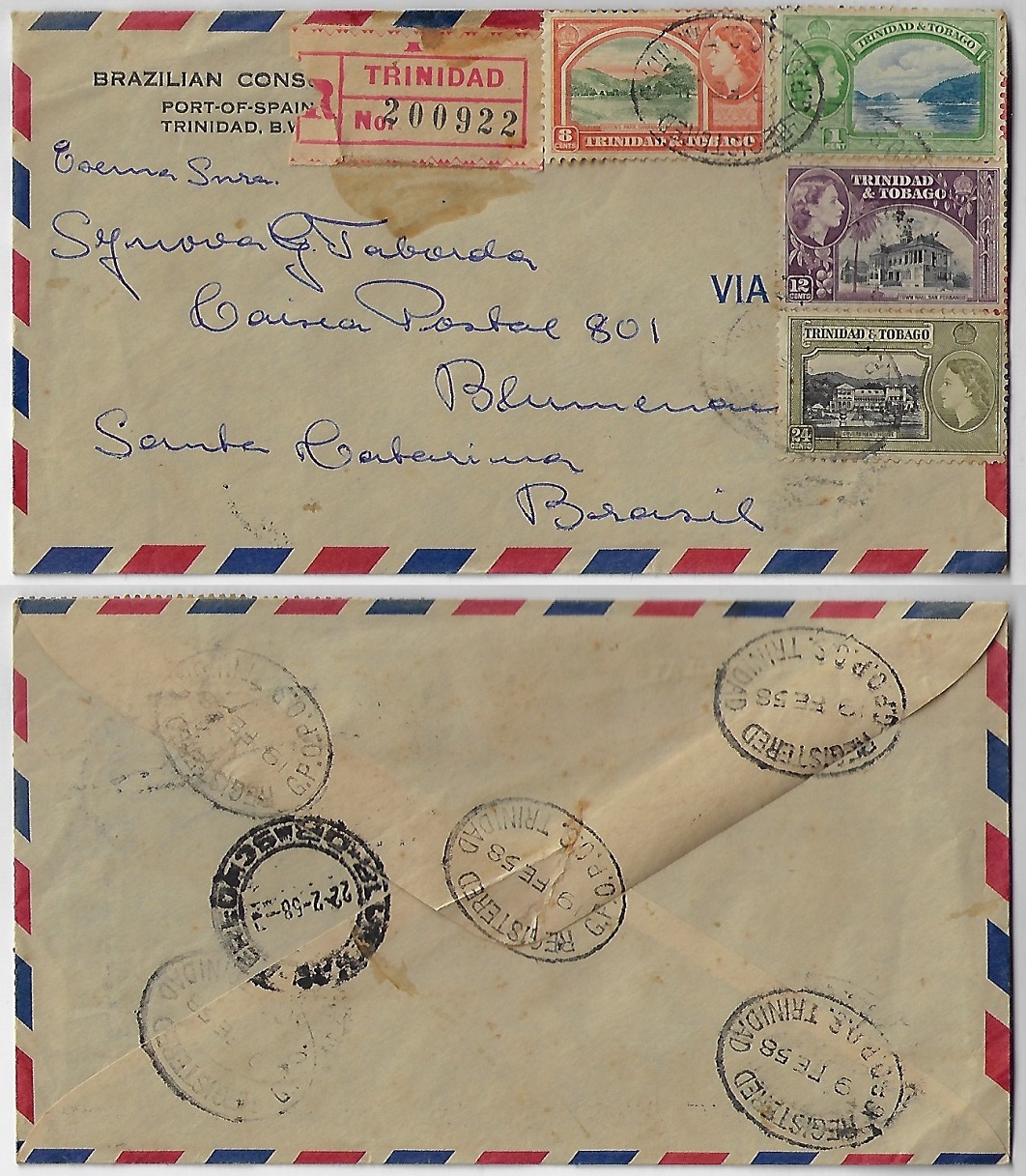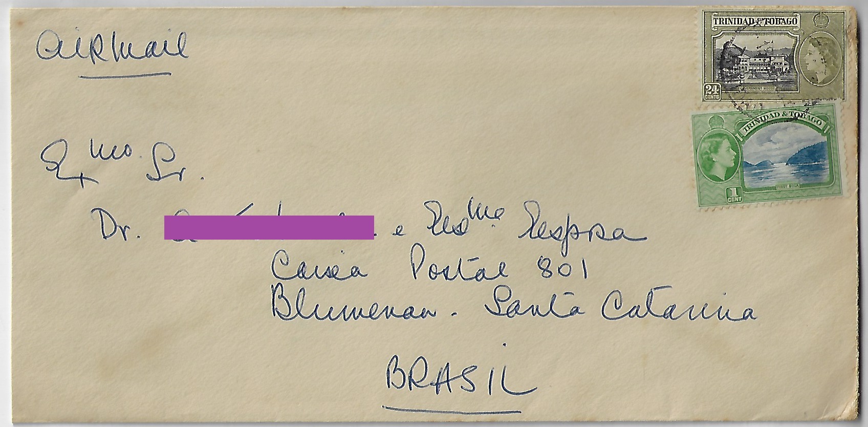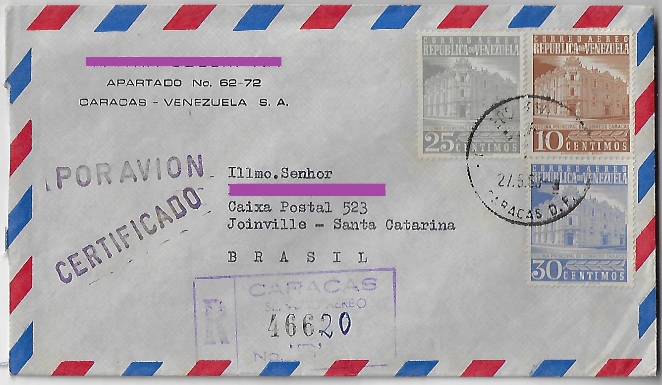 | 79132 | Venezuela, 1963, envelope aéreo registrado enviado de Caracas para Joinville, porteado com selos Correio Geral | 10,00 | Foto |