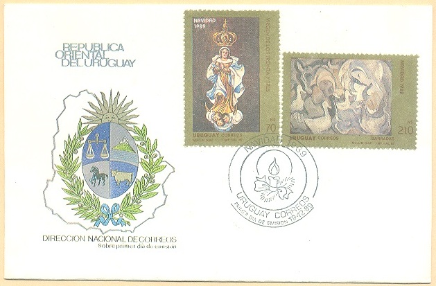| 65751 | Uruguai, 1989, envelope com carimbo de 1º dia com 2 selos alusivos ao Natal | 3,00 | Foto |