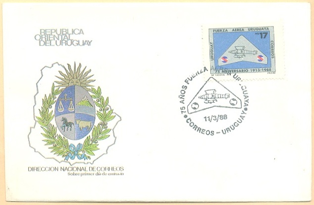 | 65752 | Uruguai, 1988, envelope com carimbo de 1º dia alusivo a Força Aérea | 3,00 | Foto |