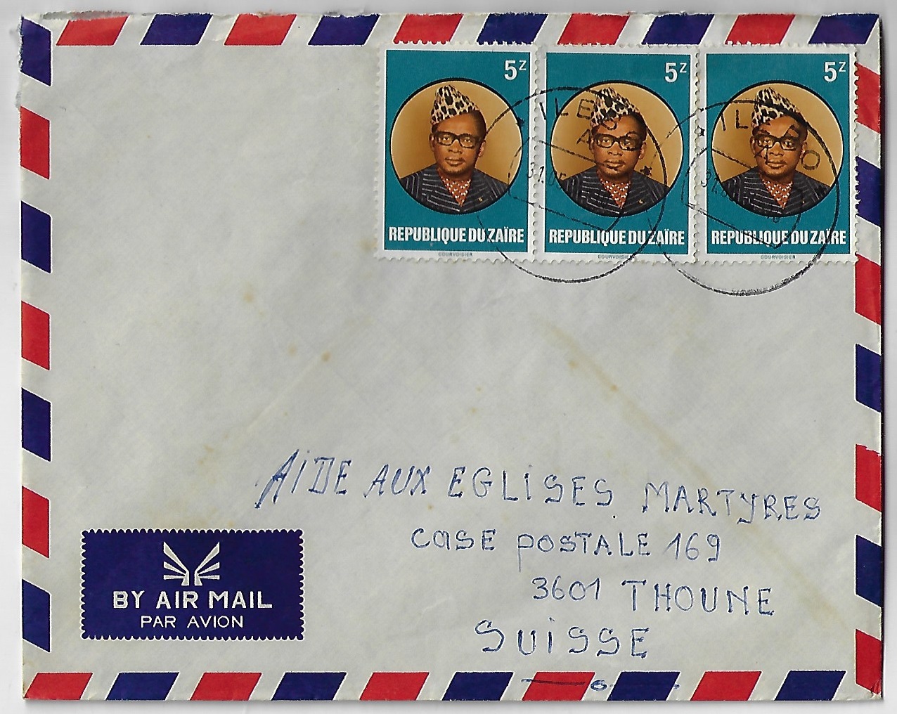 | 66731 | Zaire, 1984, envelope aéreo enviado de Ilebo (31/5) para Thoune / Suíça, porteado com 3 selos Presidente Mobutu Sese Seko | 10,00 | Foto |