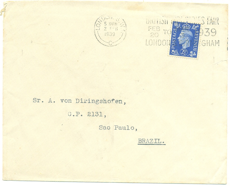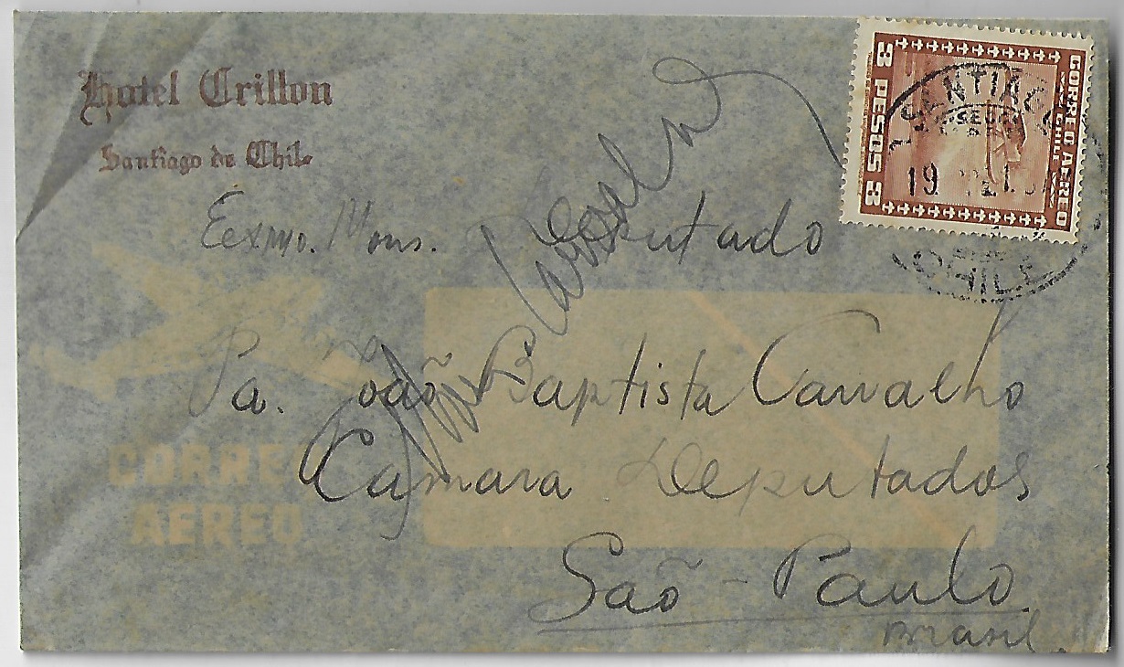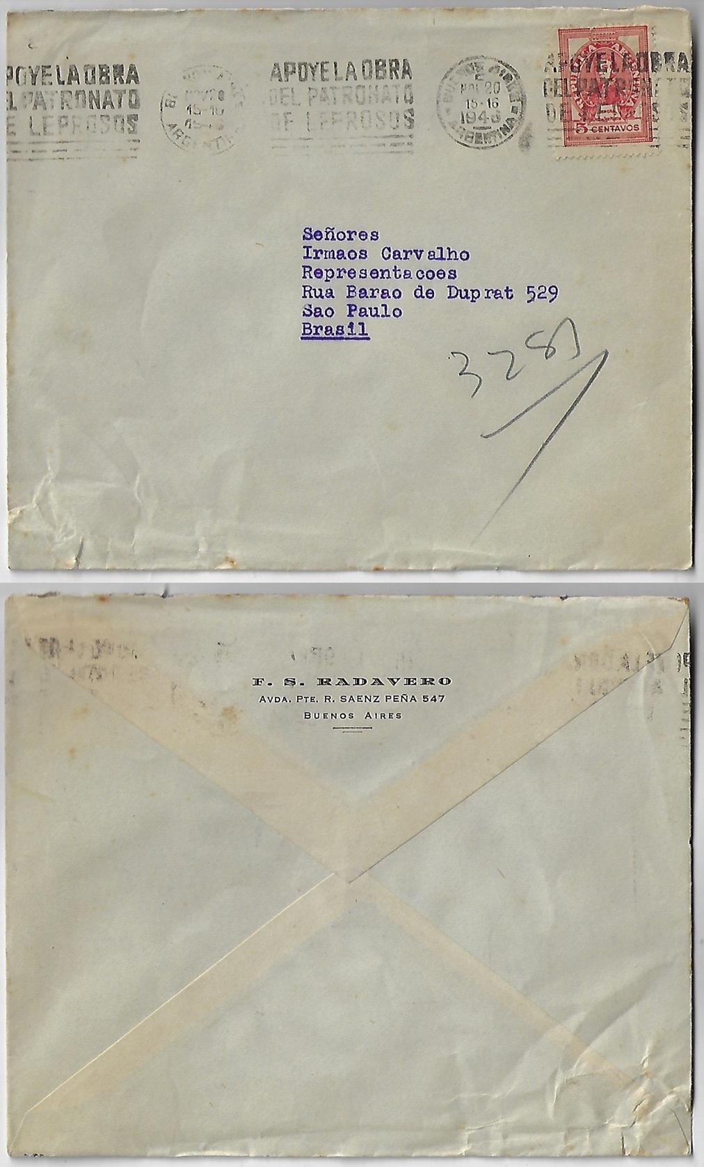 | 83930 | Argentina, 1946, envelope comercial de F.S.Radavero enviado de Buenos Aires (20/5) para São Paulo, reencaminhado para Caixa Postal, selo San Martin, carimbo com slogan "Apoie a obra da Comissão de Leprosos" | 10,00 | Foto |