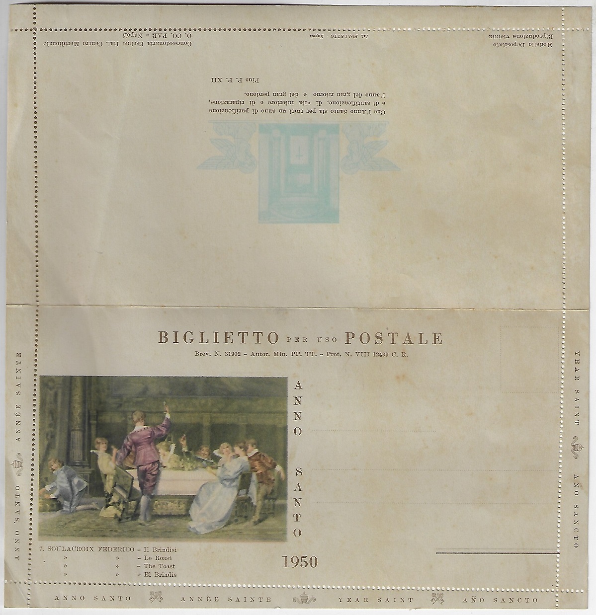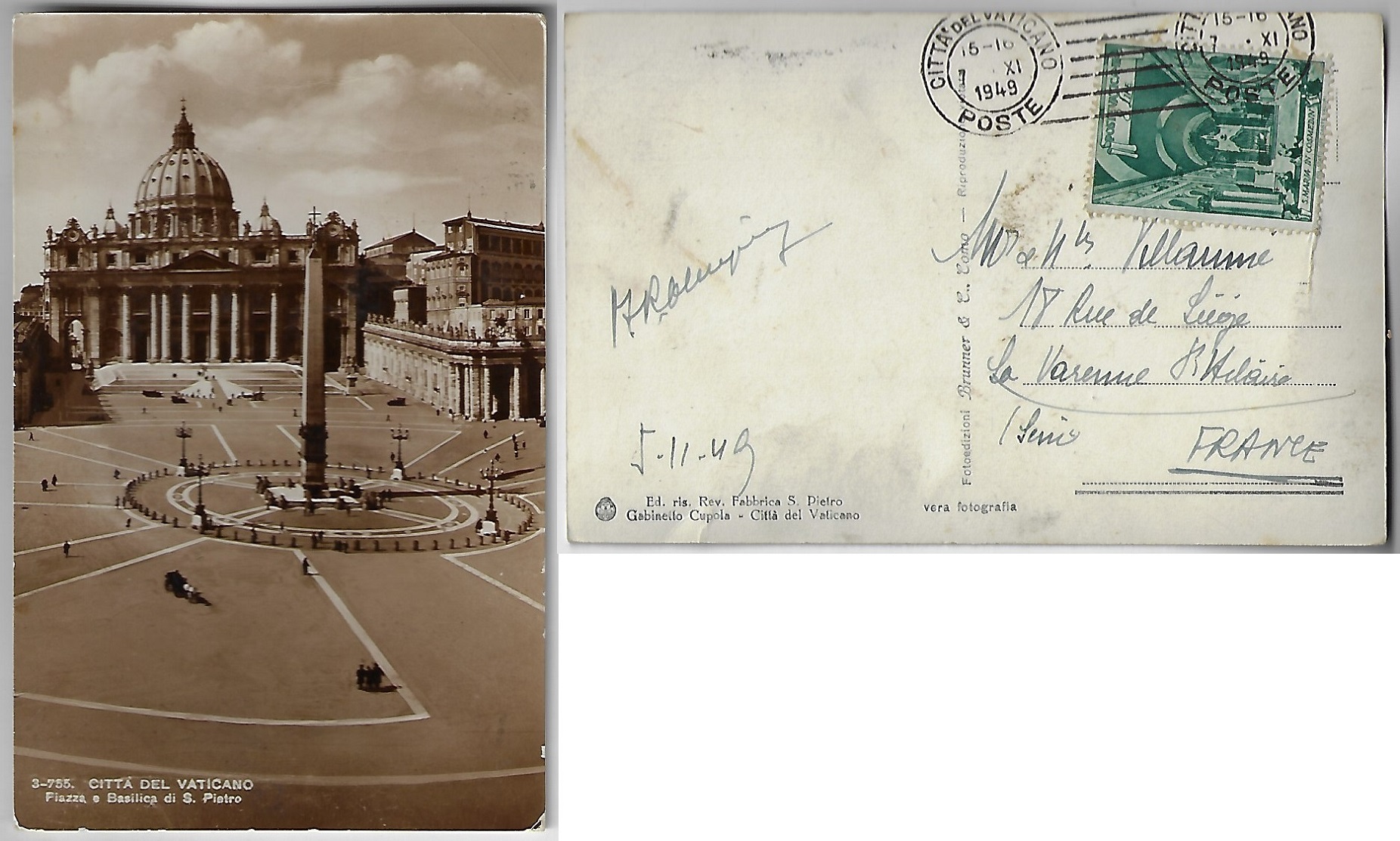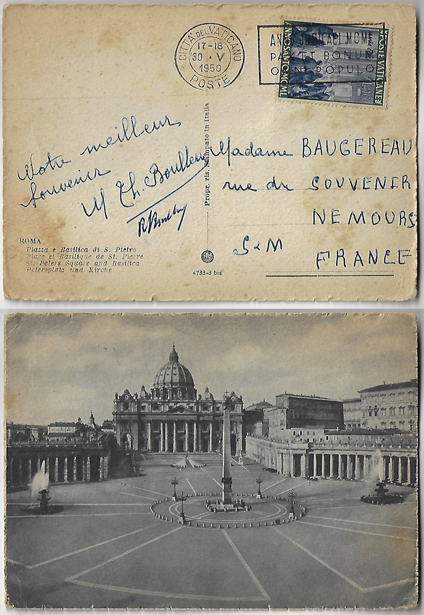 | 68878 | Vaticano, 1950, cartão postal com foto preto e branco da Praça e Basílica de São Pedro enviado para Nemours / França (30/5), porteado com selo Papa Pius XII, carimbo com slogan "No ano do Jubileu 1950 Paz e Bem para todas as pessoas" | 10,00 | Foto |