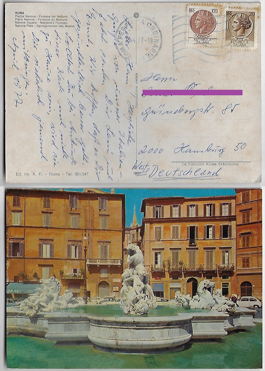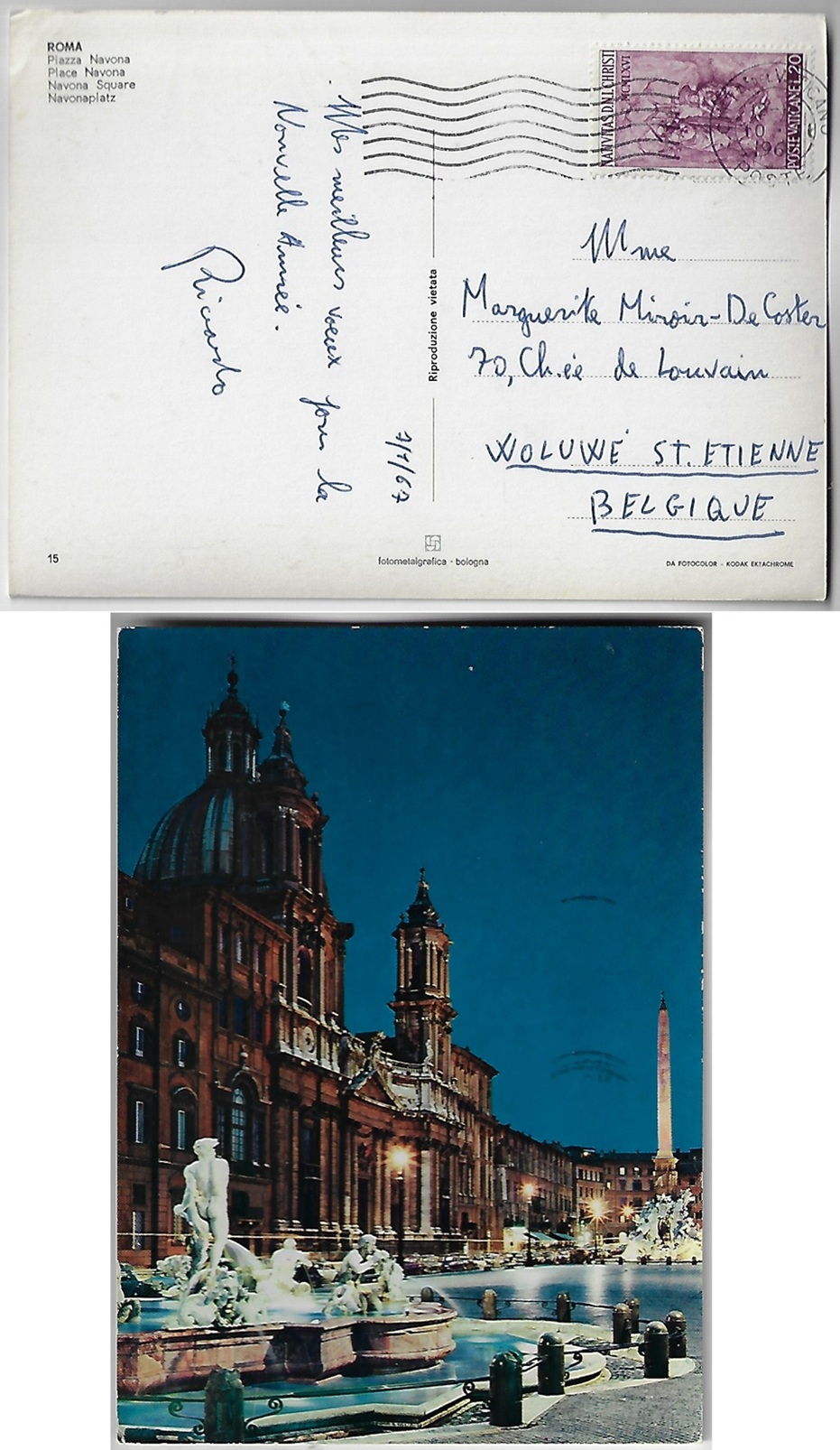 | 83602 | Vaticano, 1967, cartão postal com foto preto e branco da Praça Navona, em Roma, enviado para Woluwe-Saint-Étienne / Bélgica (7/1), porteado com selo Sagrada Família em Belém | 10,00 | Foto |