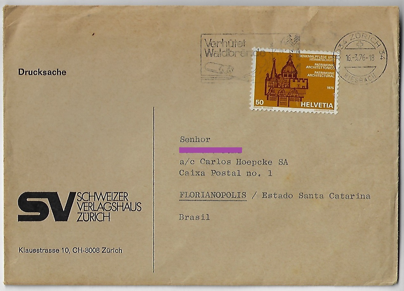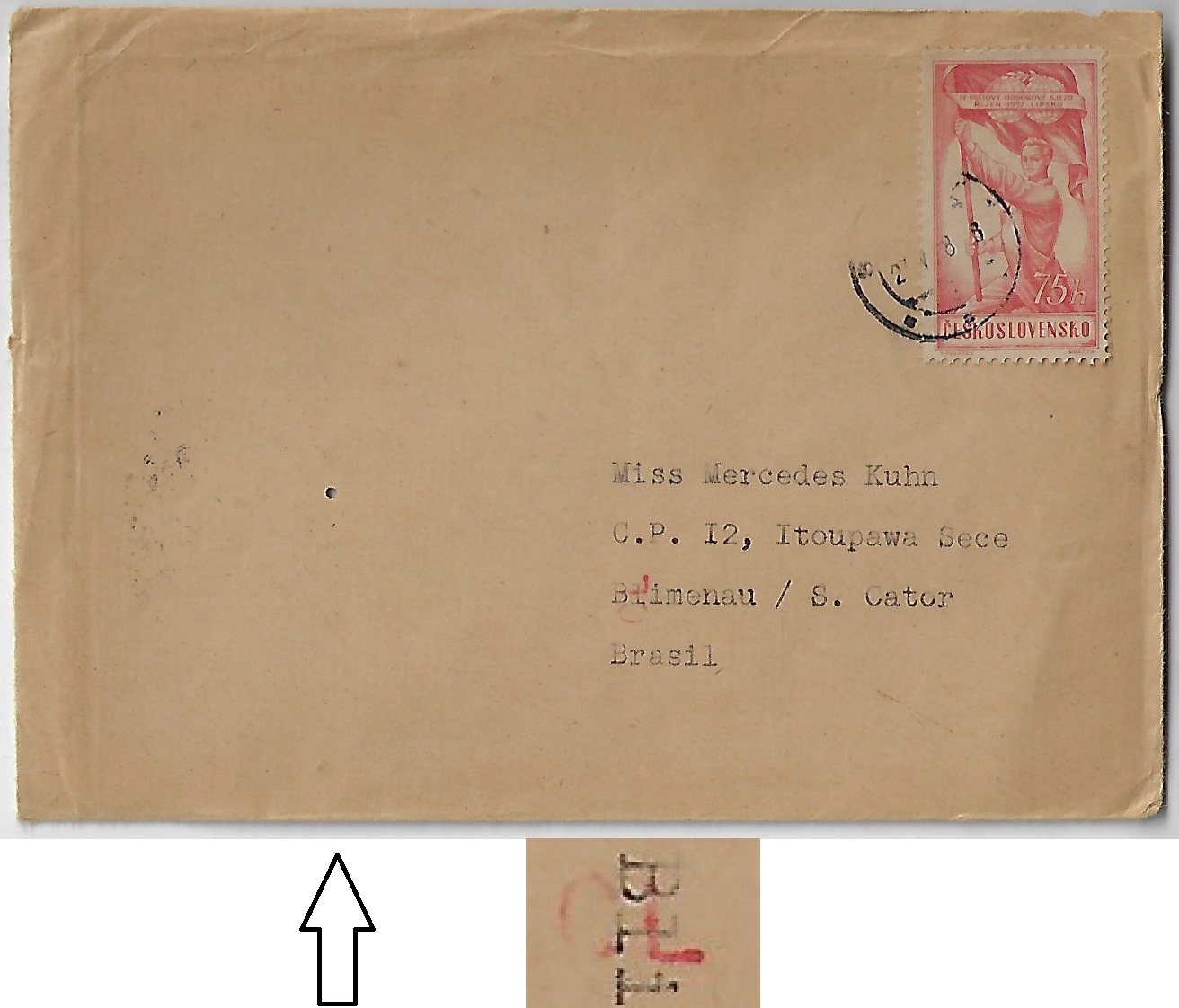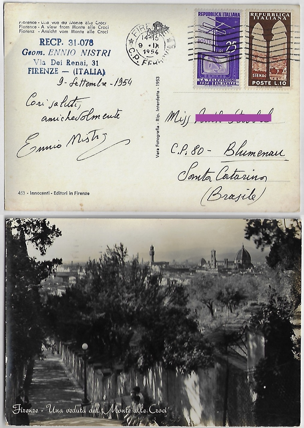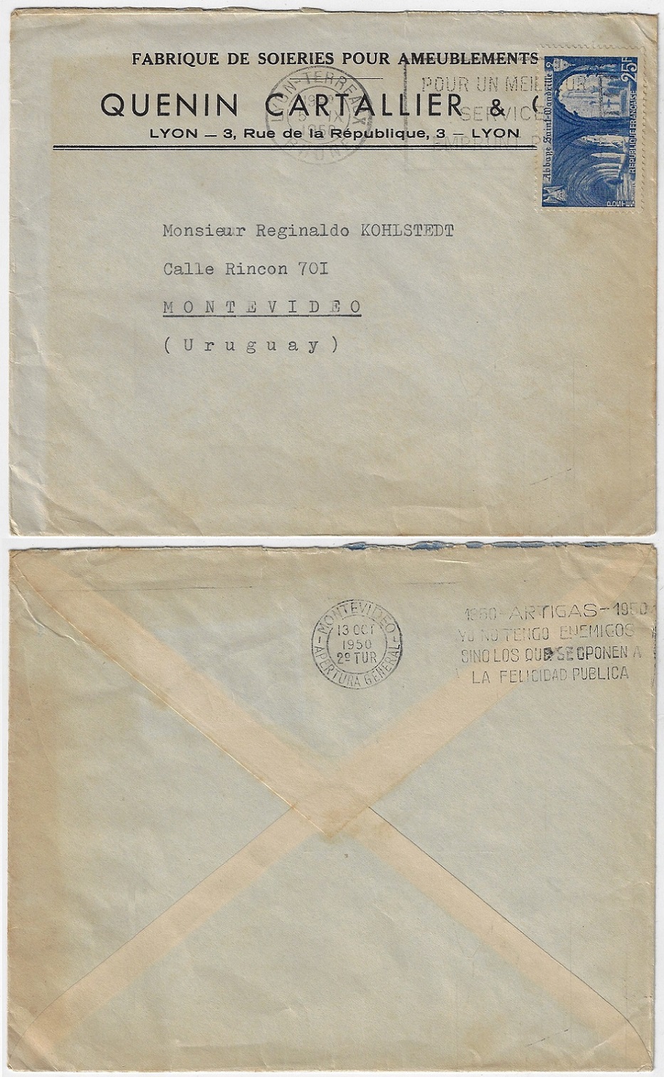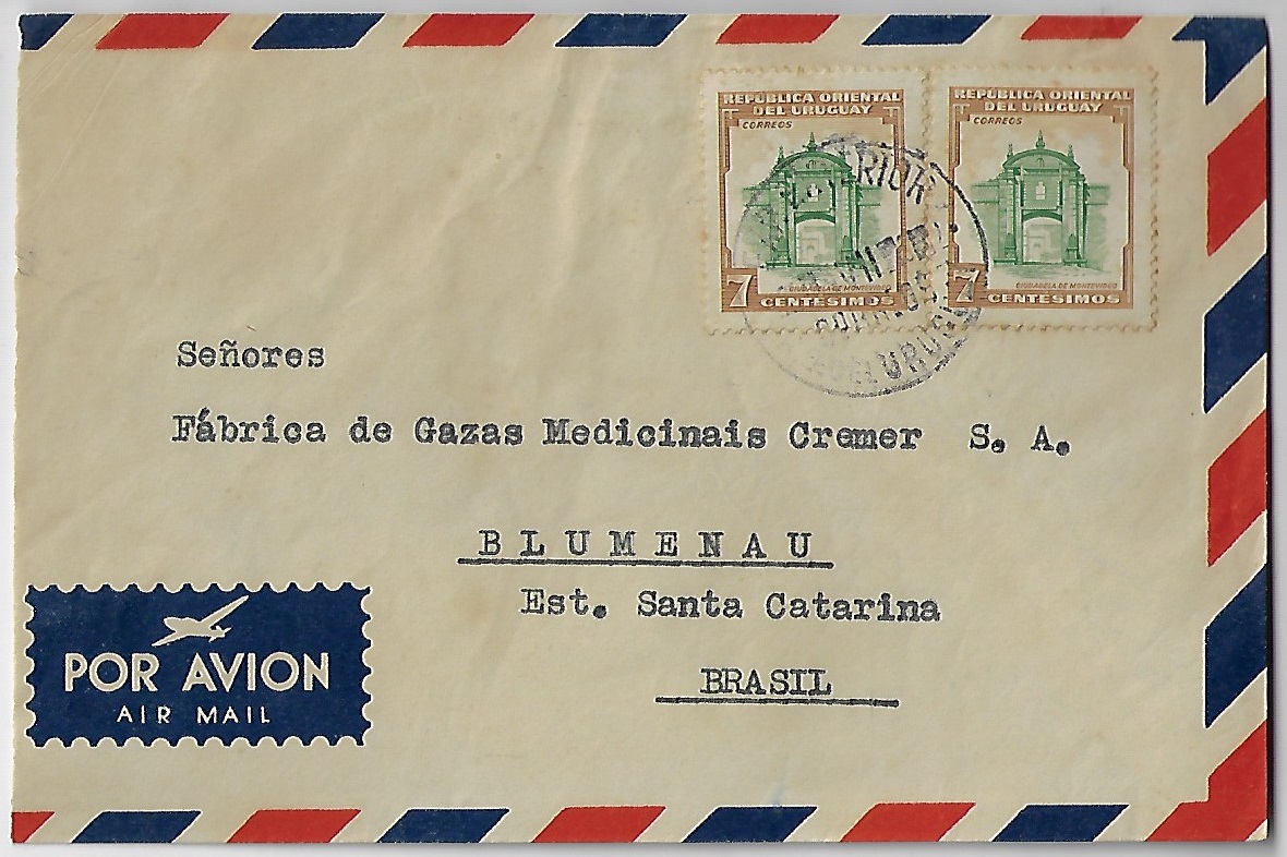 | 79722 | Uruguai, 1954, envelope aéreo de Guillermo Klimesch & Hijo enviado de Montevidéu para Blumenau (1/7), porteado com 2 selos 7 Centésimos, Entrada para a Cidadela | 10,00 | Foto |
