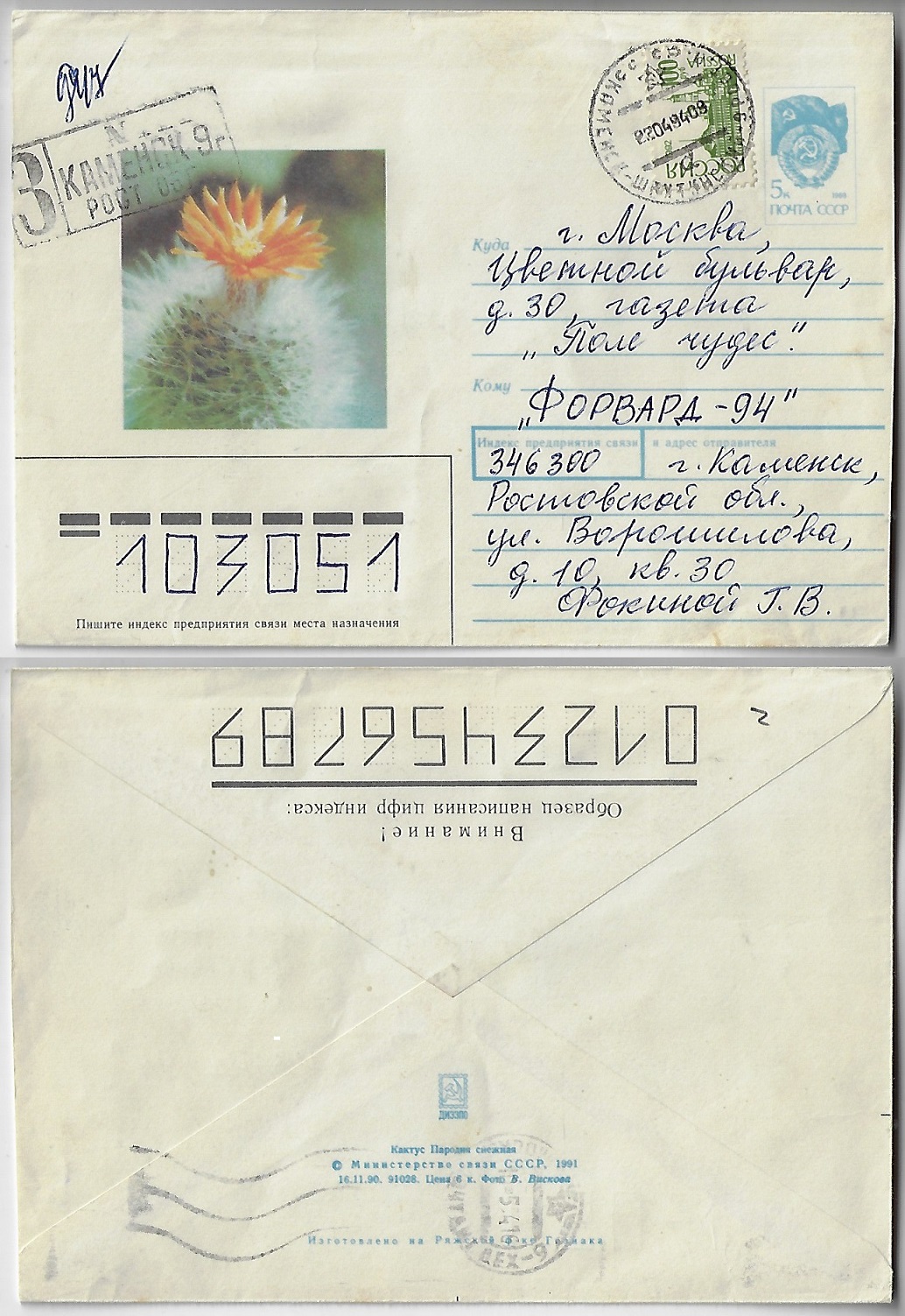 | 69461 | URSS, 1994, inteiro postal tipo envelope com carimbo de Registrado enviado de Kamensk-Shakhtinsky (22/4) para Moscou, foto de Flor do Cactus Paródia da Neve (Paradia nivosa), com selo adicional | 10,00 | Foto |