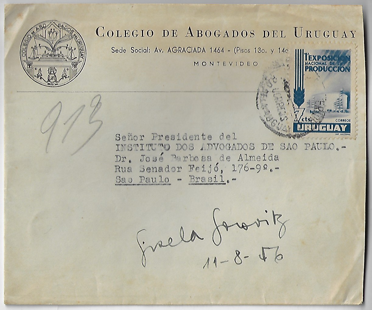 | 69523 | Uruguai, 1956, envelope timbrado do Colégio de Advogados do Uruguai enviado de Montevidéu para São Paulo, porteadoc om selo 1ª Exposição Nacional da Produção | 10,00 | Foto |