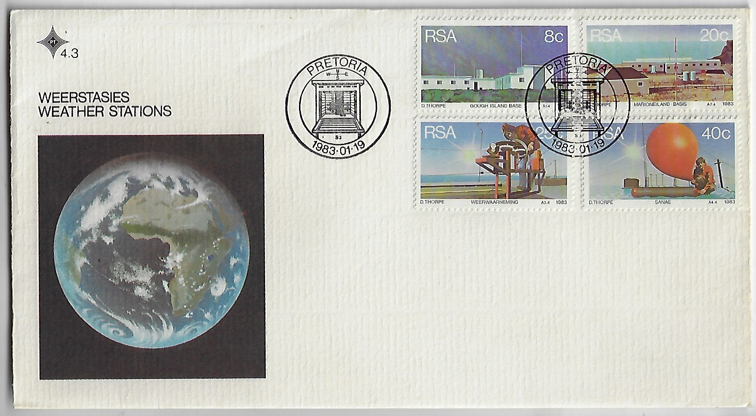 | 69651 | África do Sul, 1983, envelope com 4 selos e carimbo comemorativo alusivos a Estações Meteorológicas, com edital | 10,00 | Foto |