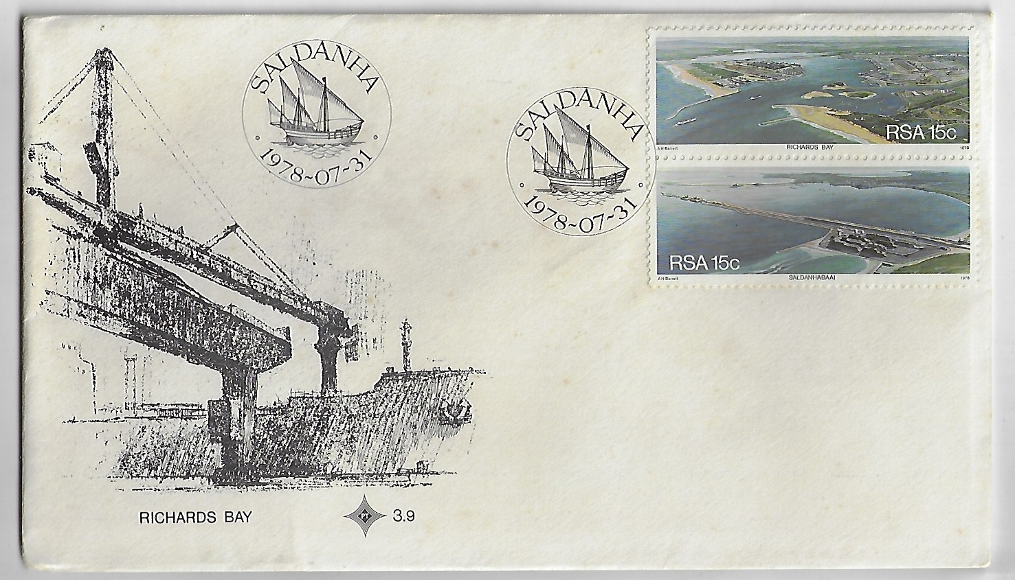 | 69719 | África do Sul, 1978, FDC envelope com 2 selos retratando a Saldanha Bay e Richards Bay, carimbo comemorativo figurando a caravela de António de Saldanha, com edital | 10,00 | Foto |
