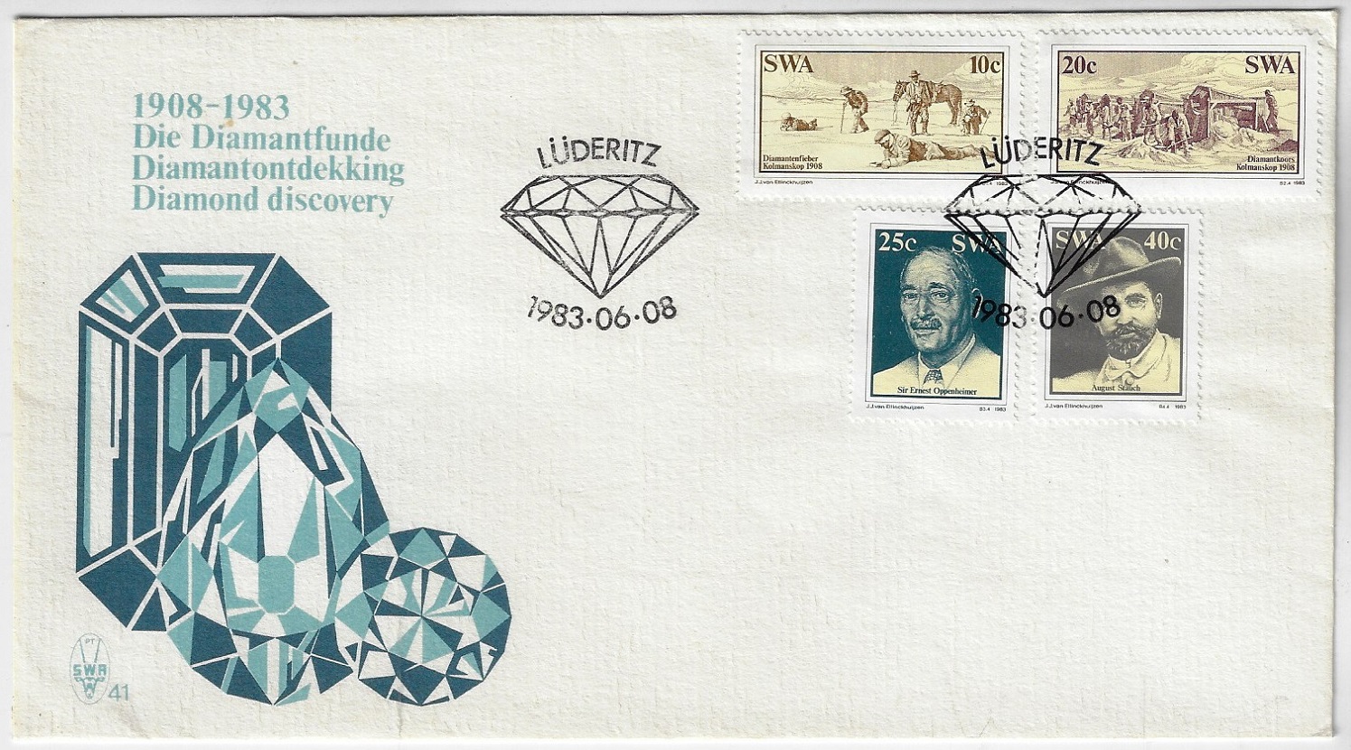 | 69730 | África do Sudoeste, 1983, FDC com 4 selos alusivos a Descoberta de Diamente, Geologia, Mineralogia, Jóia | 10,00 | Foto |