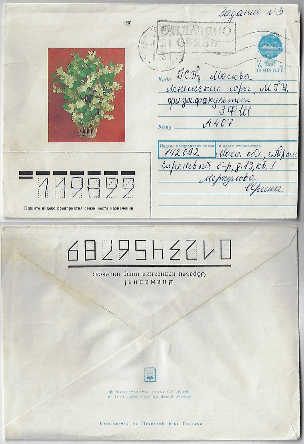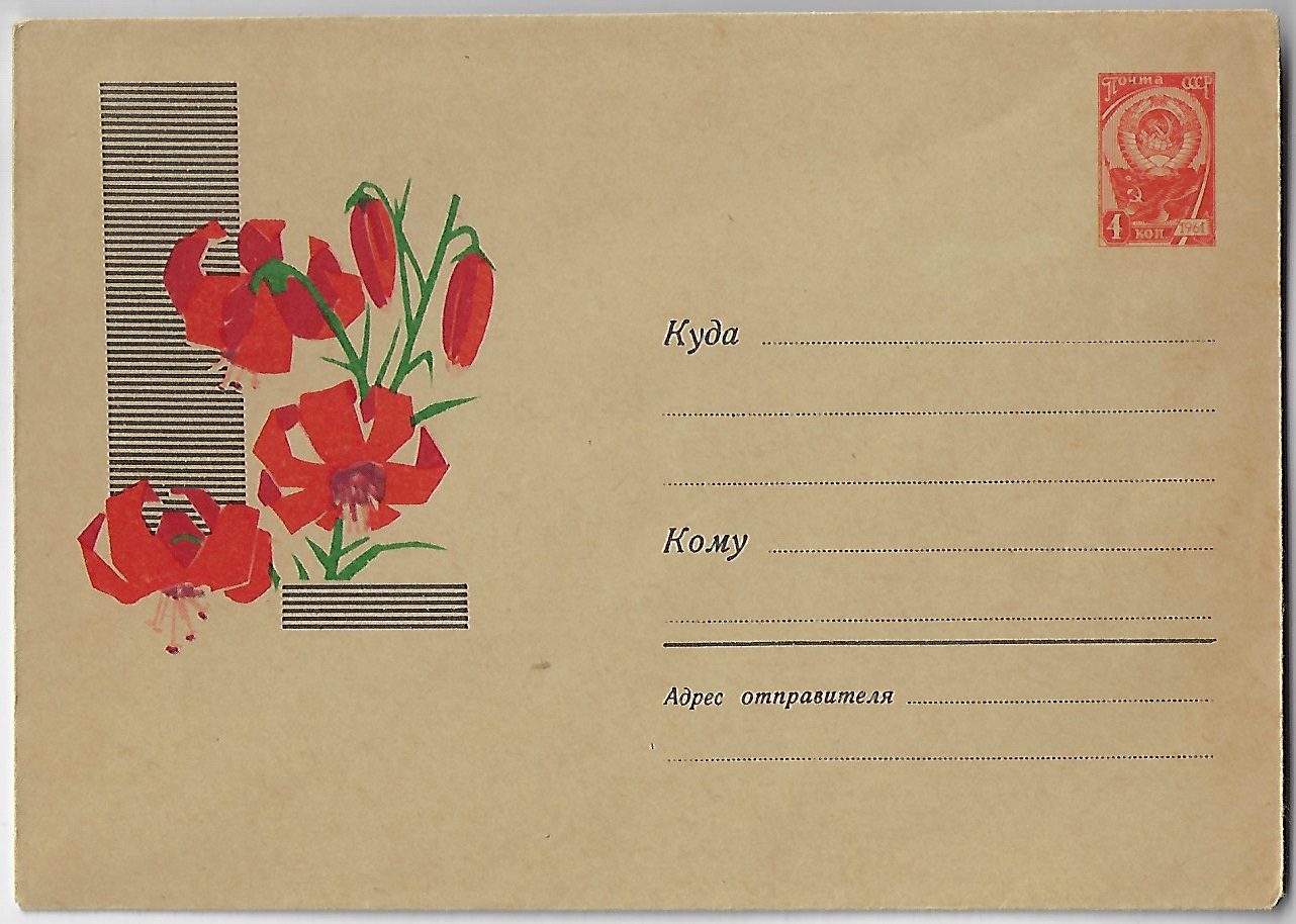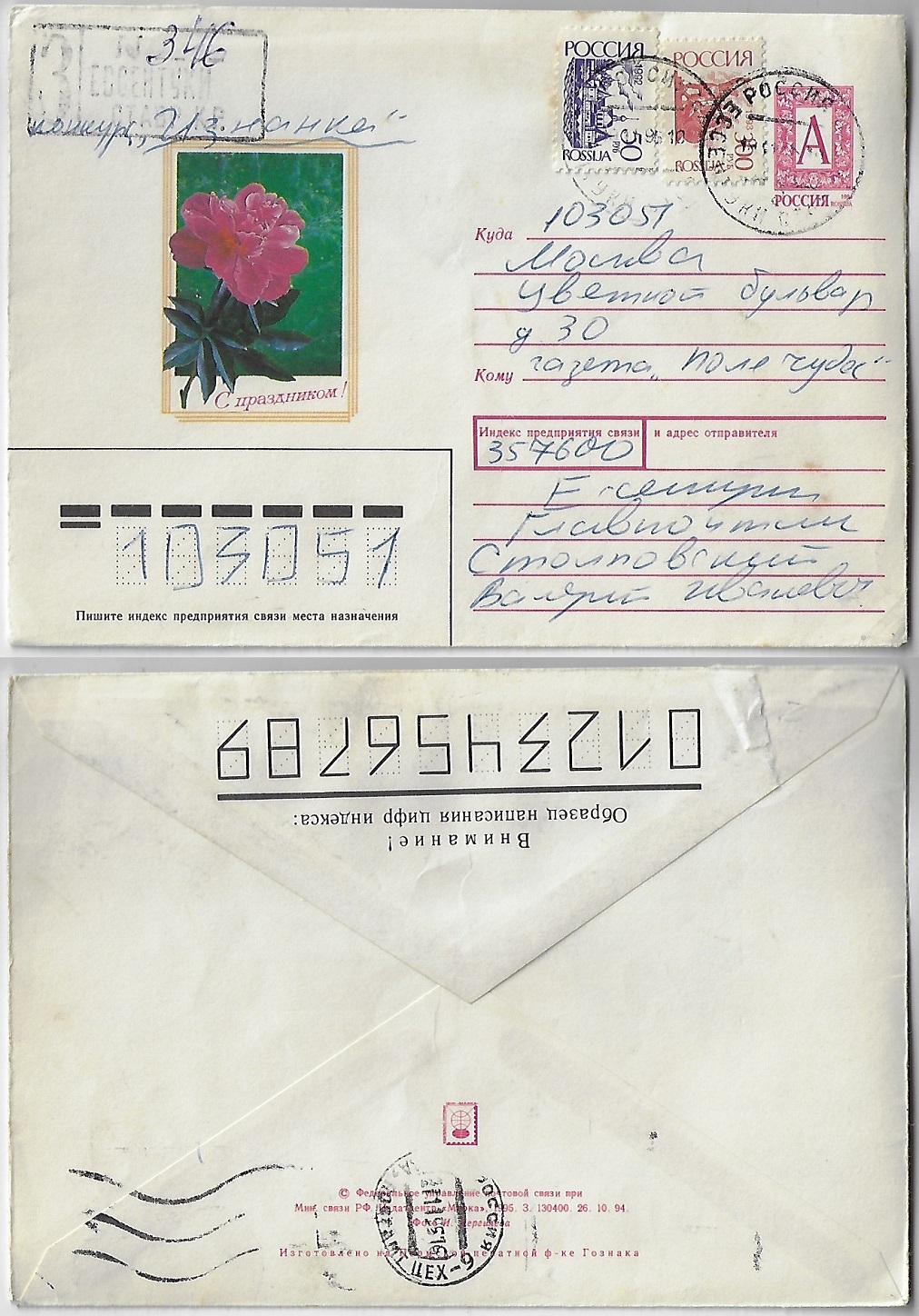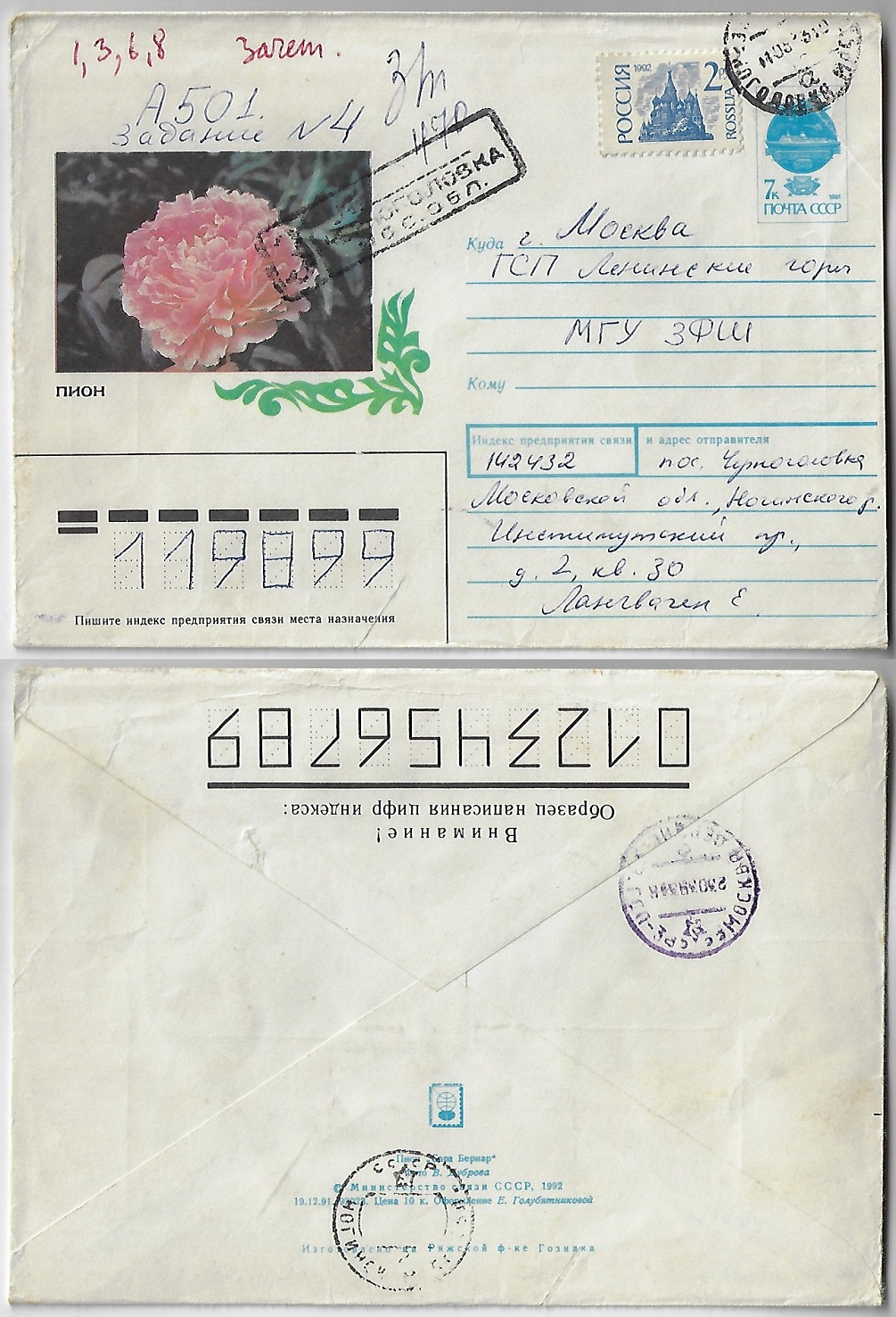 | 84613 | URSS, 1993, inteiro postal tipo envelope enviado de Chernogolovka para Moscou, com selo adicional para porte registrado, Flor Peônia | 10,00 | Foto |