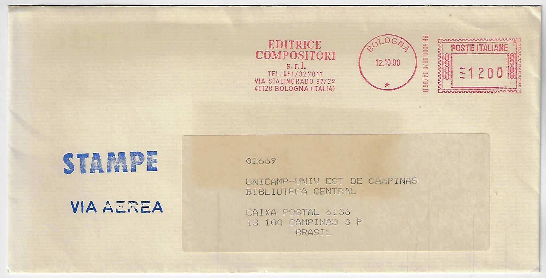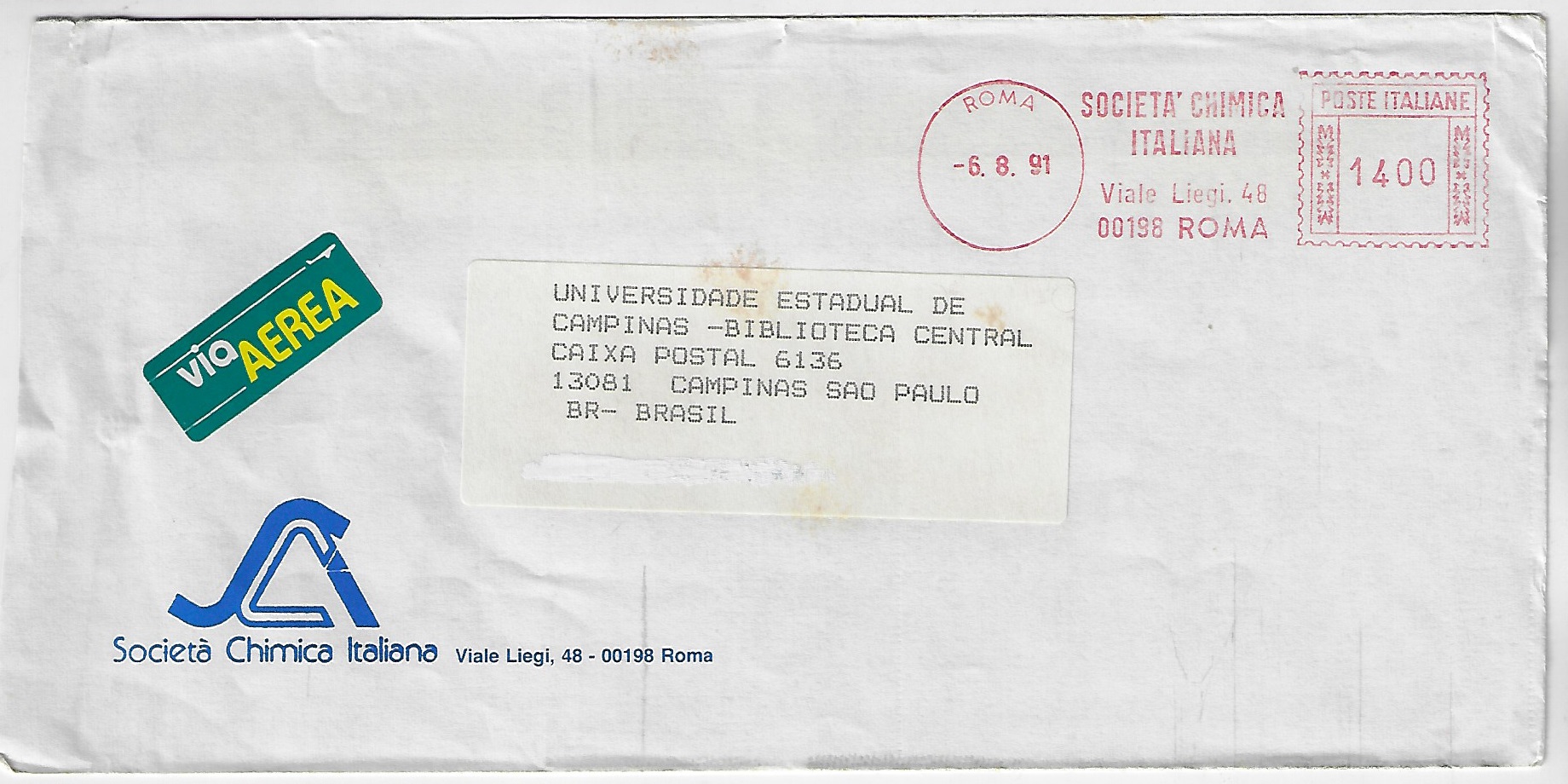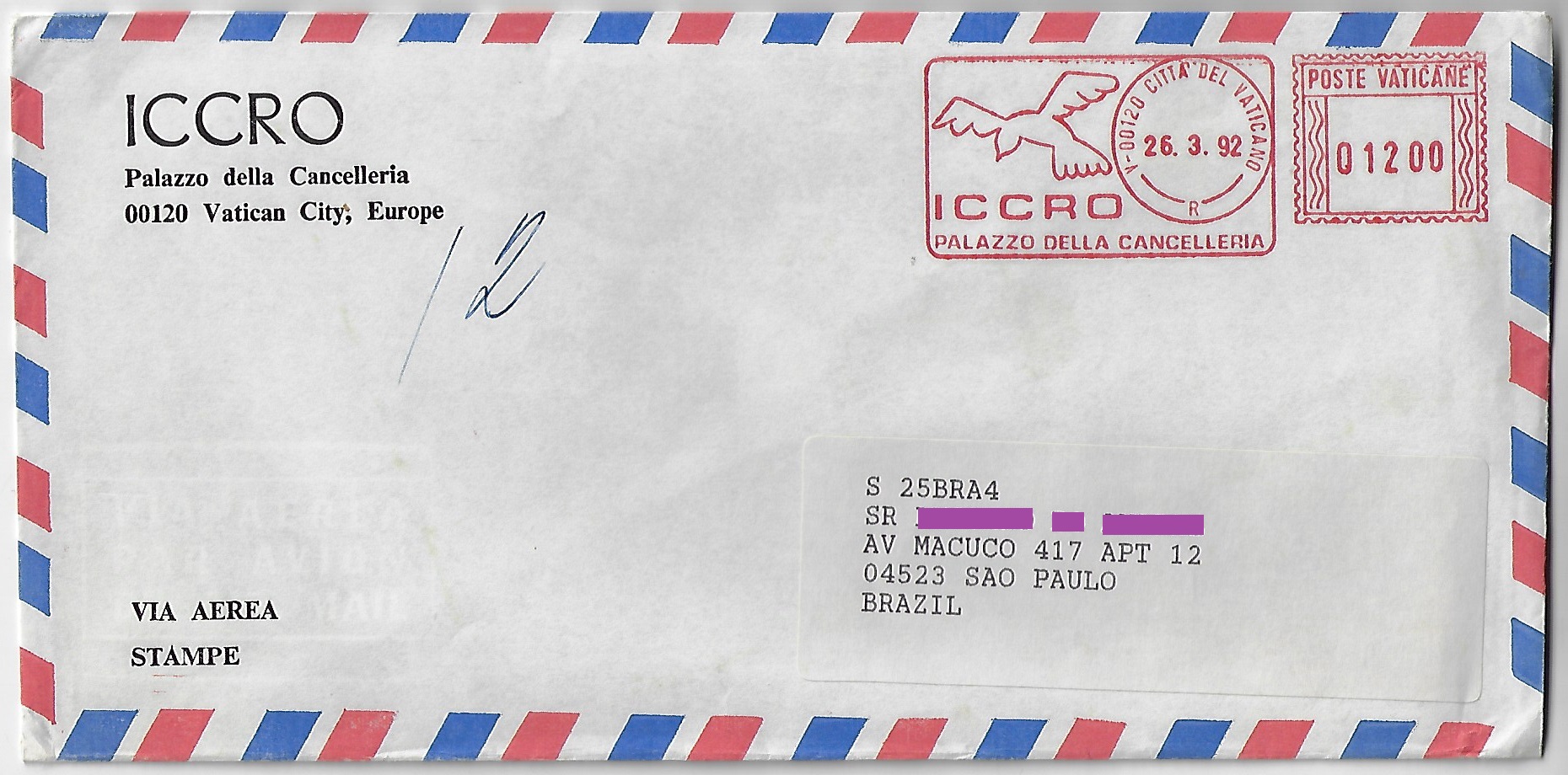 | 78083 | Vaticano, 1992, envelope aéreo do ICCRO (International Catholic Charismatic Renewal Offices) enviado para São Paulo, porteado com franquia mecânica Audion com slogan ICCRO / Palácio da Chancelaria, Ave, Pomba | 10,00 | Foto |